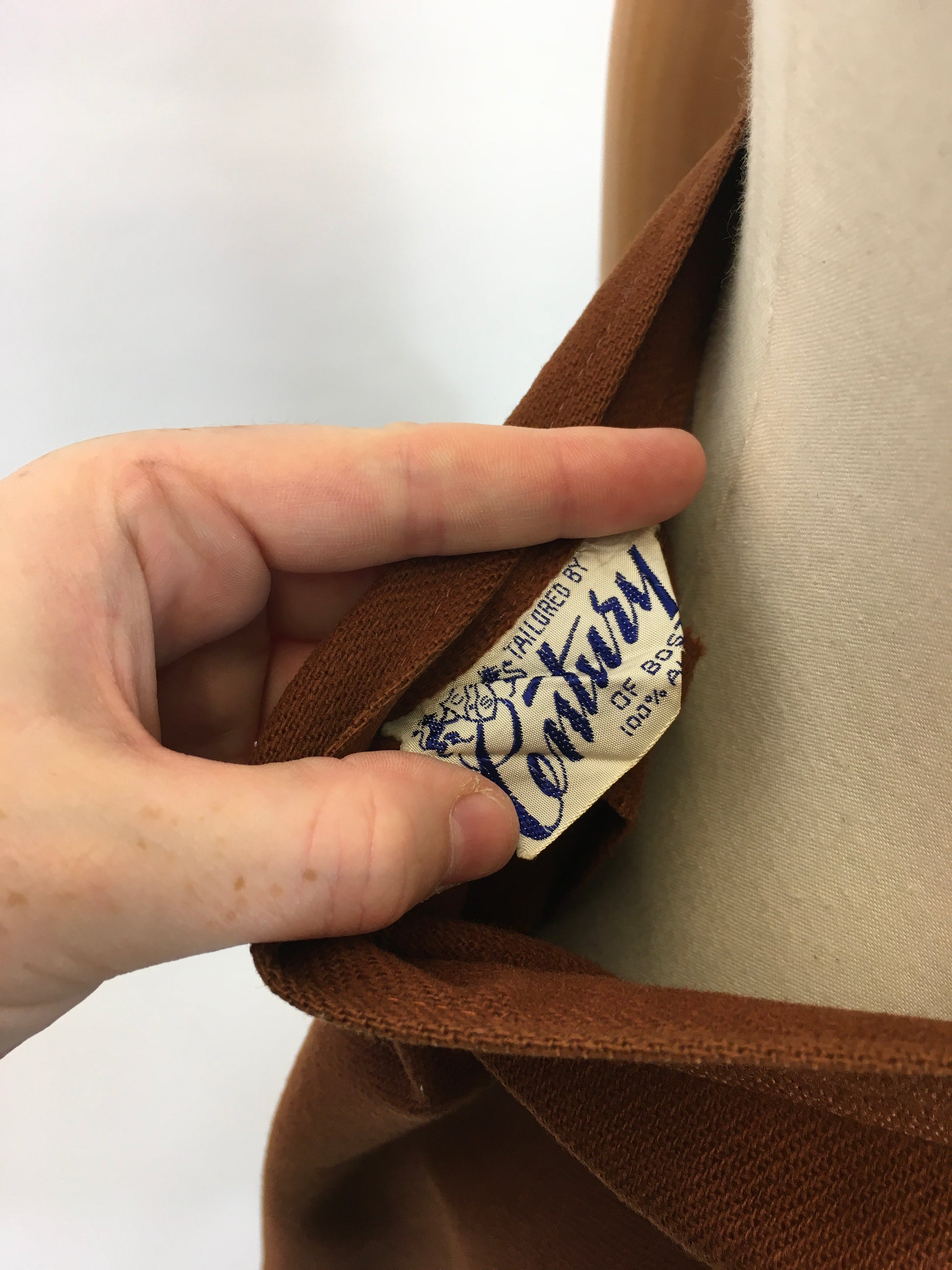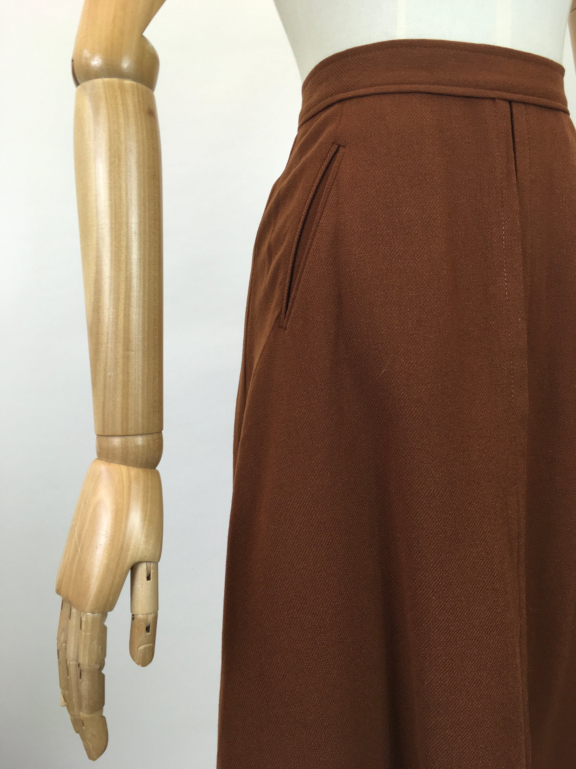 Vintage 1940’s Woollen skirt in a warm Chestnut Brown. A great Autumnal colourway. An American beauty which features A line skirt with lined pockets to the front. Alongside lovely double stitched pleat all the way from waistband to hemline down the front centre. Side metal zip and button fastening.