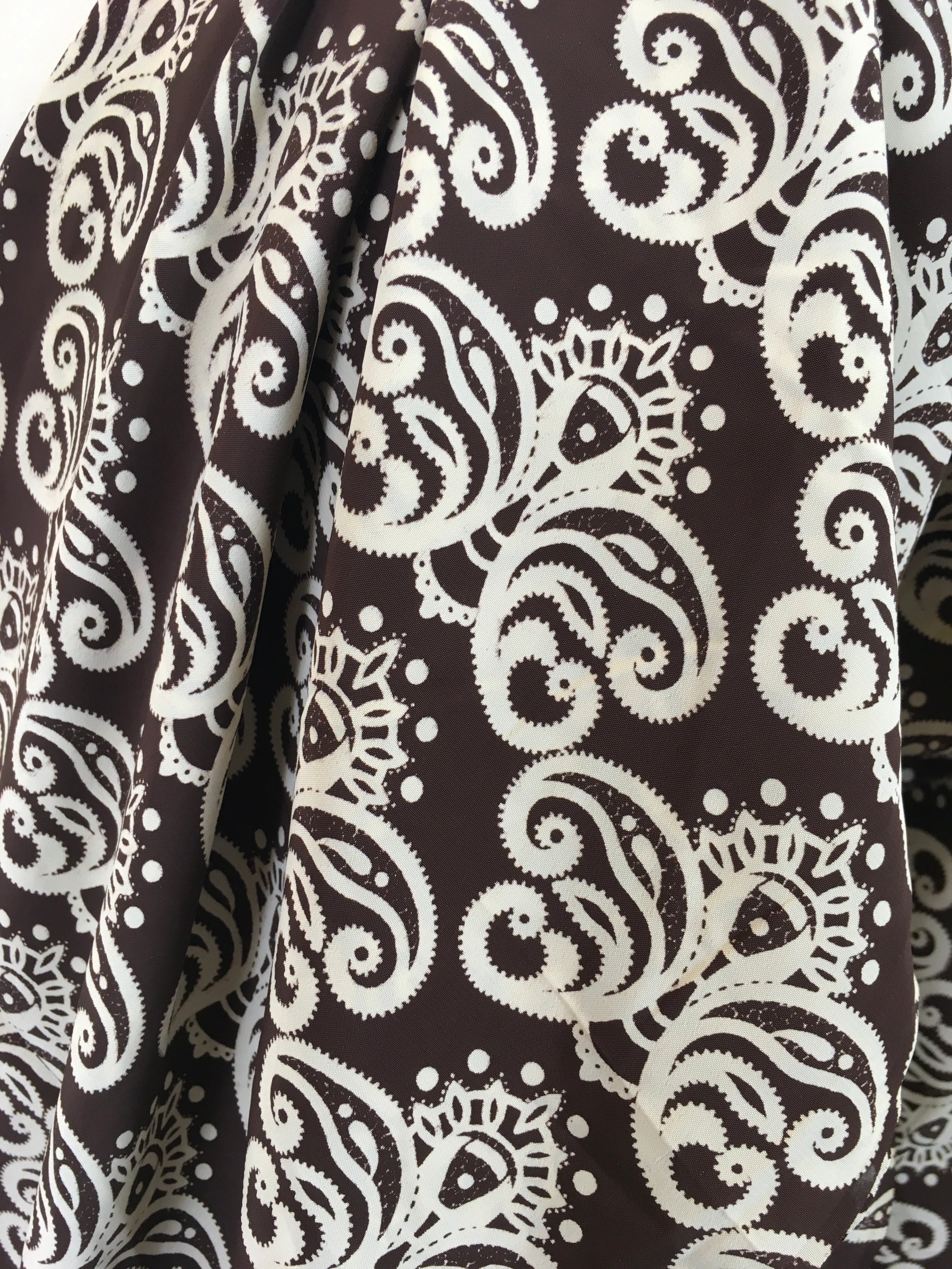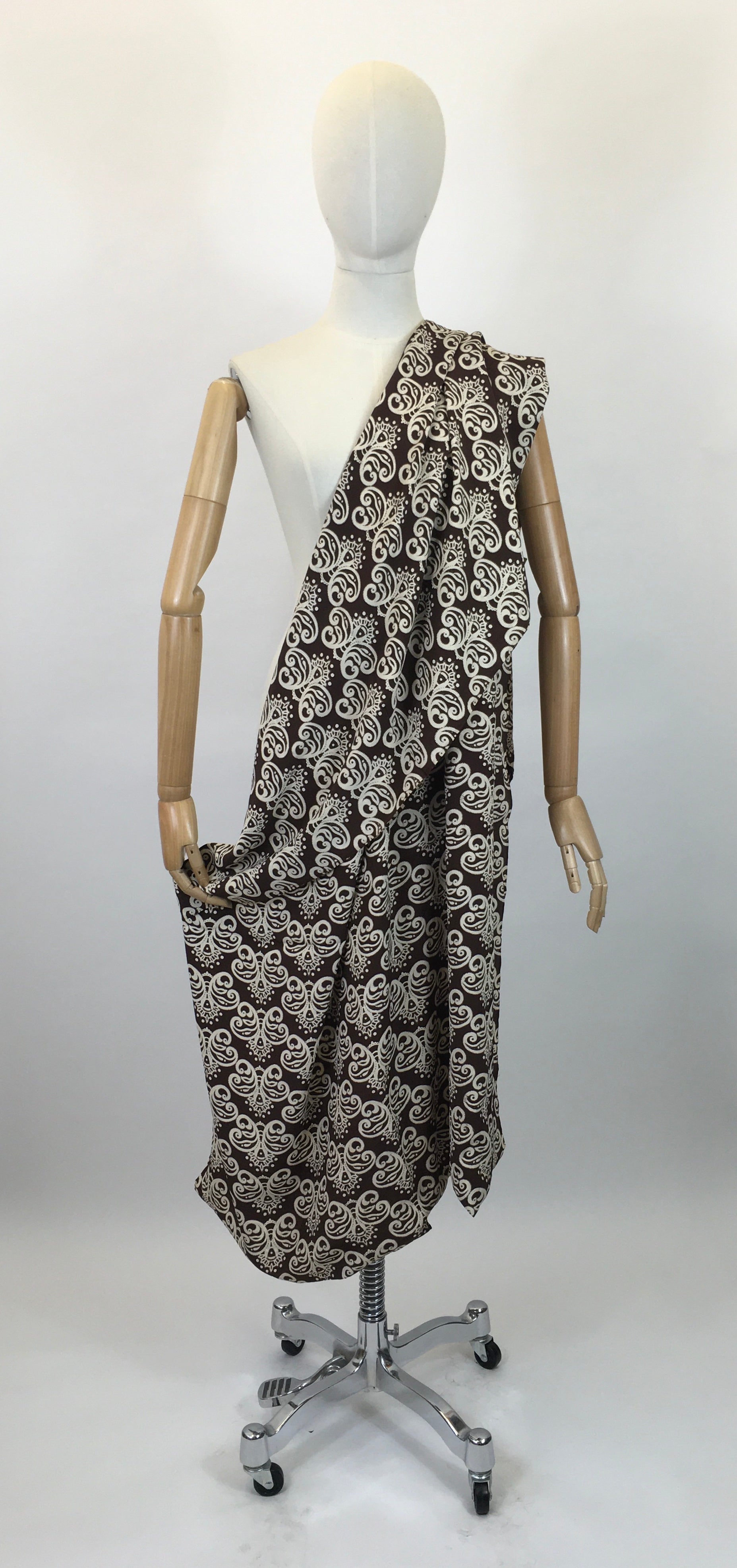 Vintage late30’s / early 40’s Rayon Silk Dressmaking fabric in Chocolate Brown and Cream. On a chocolate brown background with cream, almost Butterfly silhouette / swirl. (All I see now is butterflies), beautiful light feel to this fabric and it would drape amazingly for a dress or blouse / skirt combination. It still has its original paper label stapled on it.