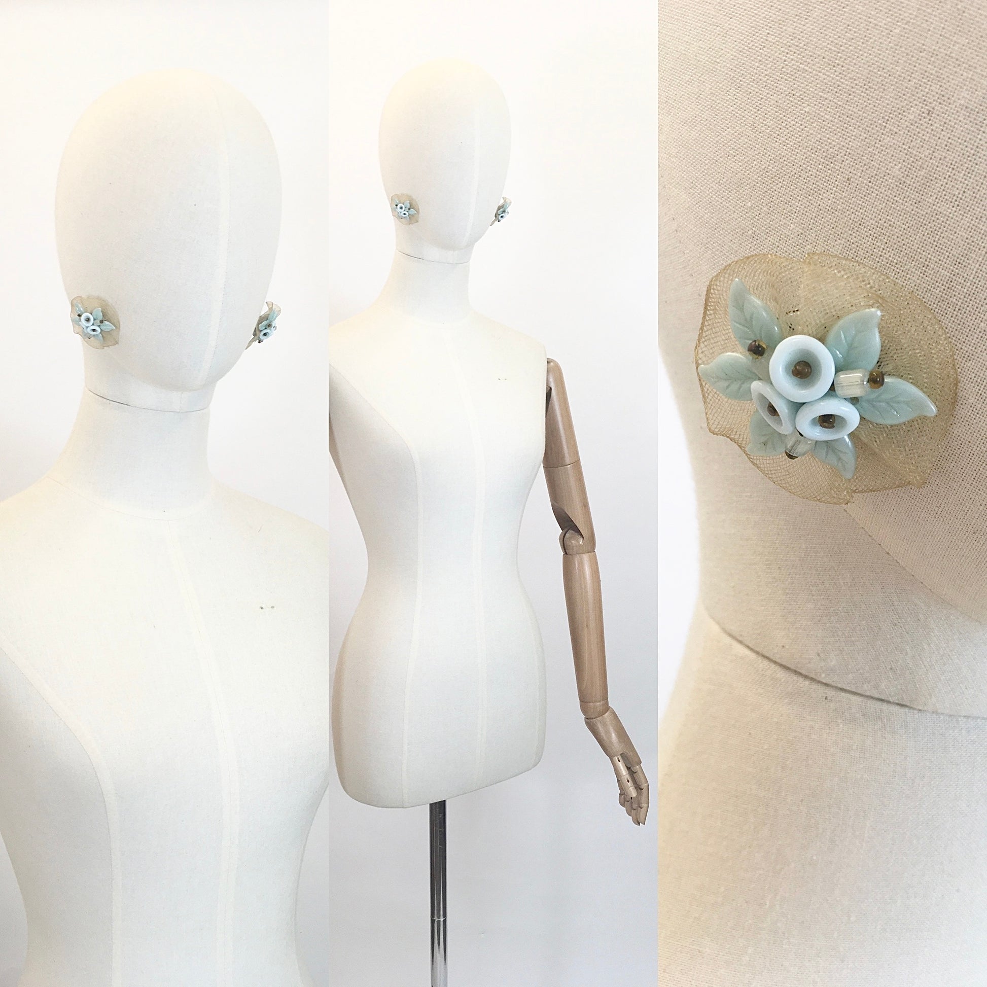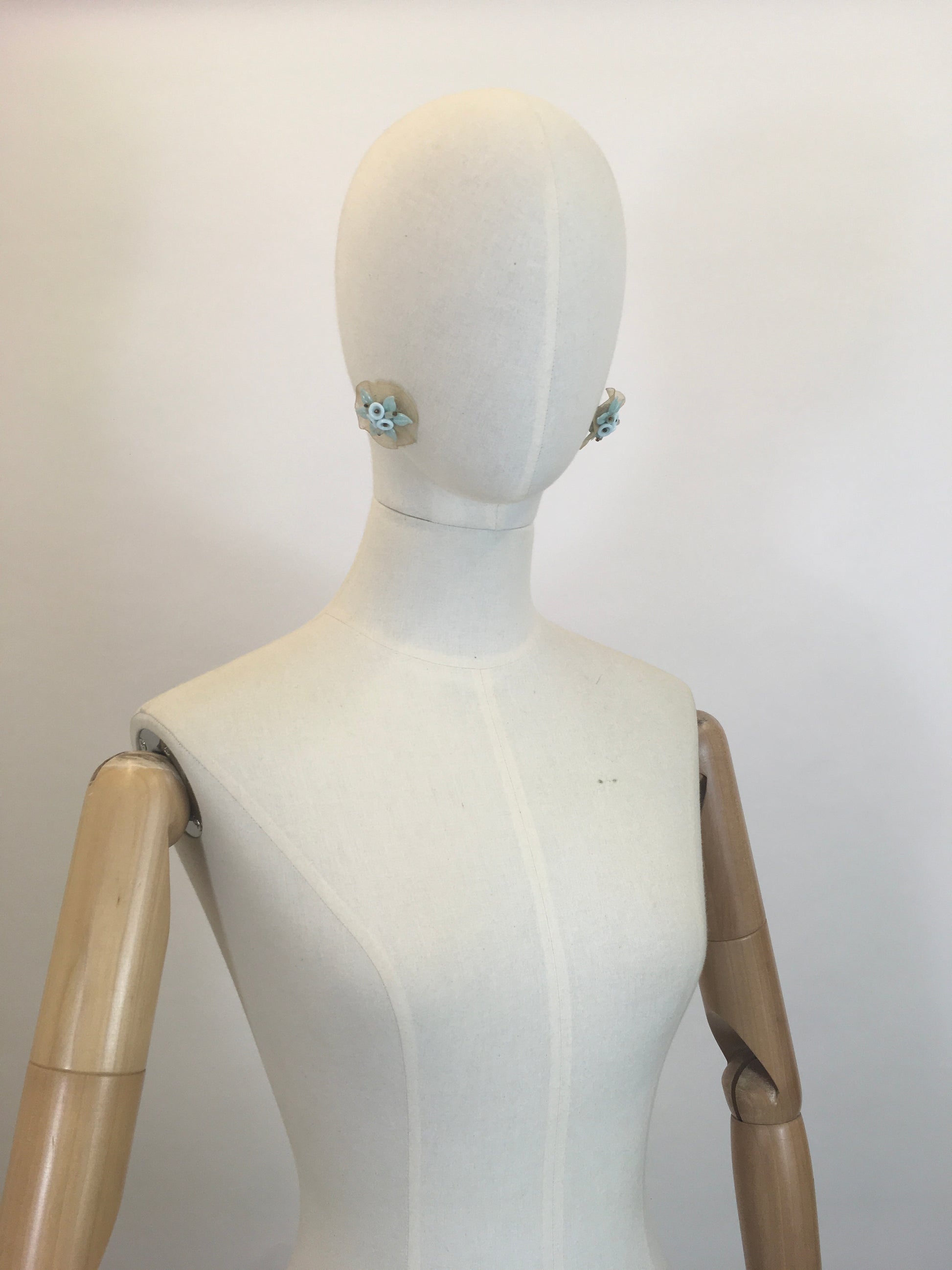 Vintage 40’s amazing clip on earrings in a gorgeous duck egg colour way.  Early celluloid beadwork in flowers and petals, sits on an almost starched like nylon frill.      With Gold tone clips to the back, secure working clasps.  Delicate in appearance but strong and such  a great statement to adorn any ensemble from the era.