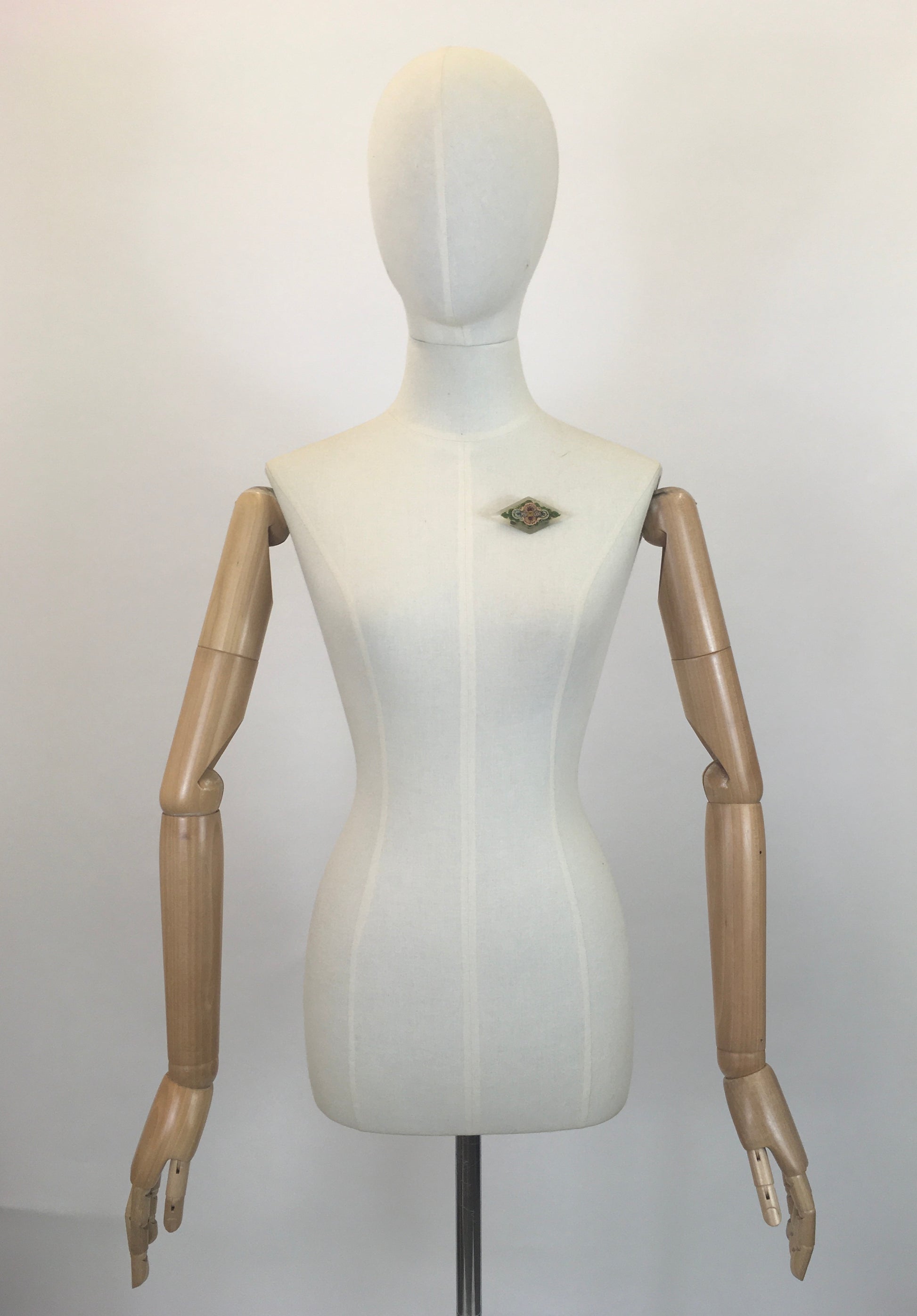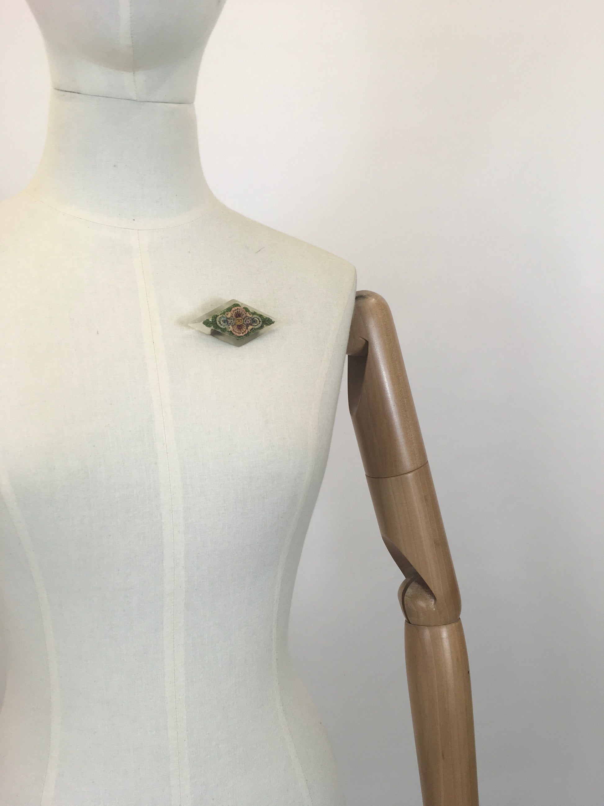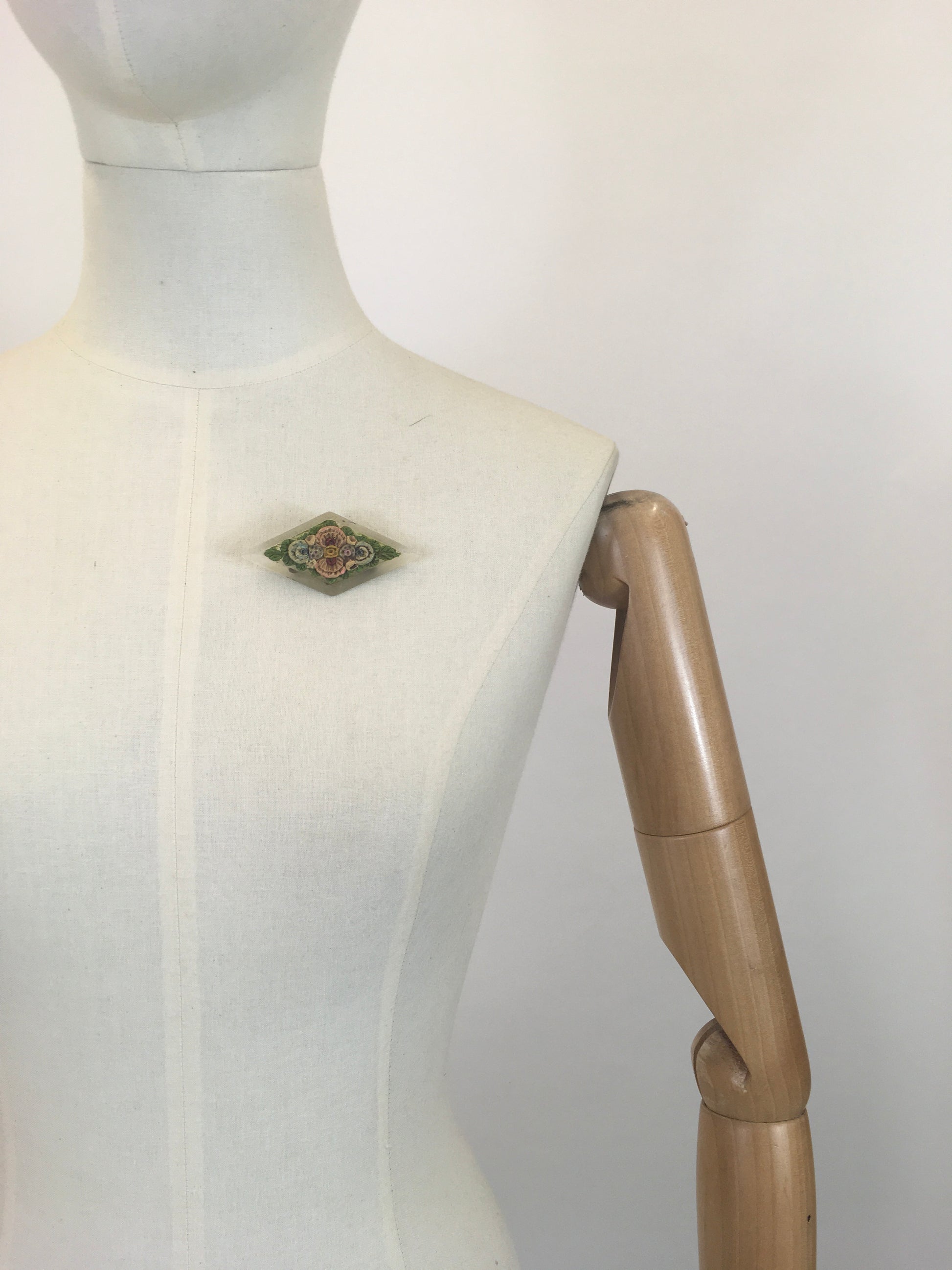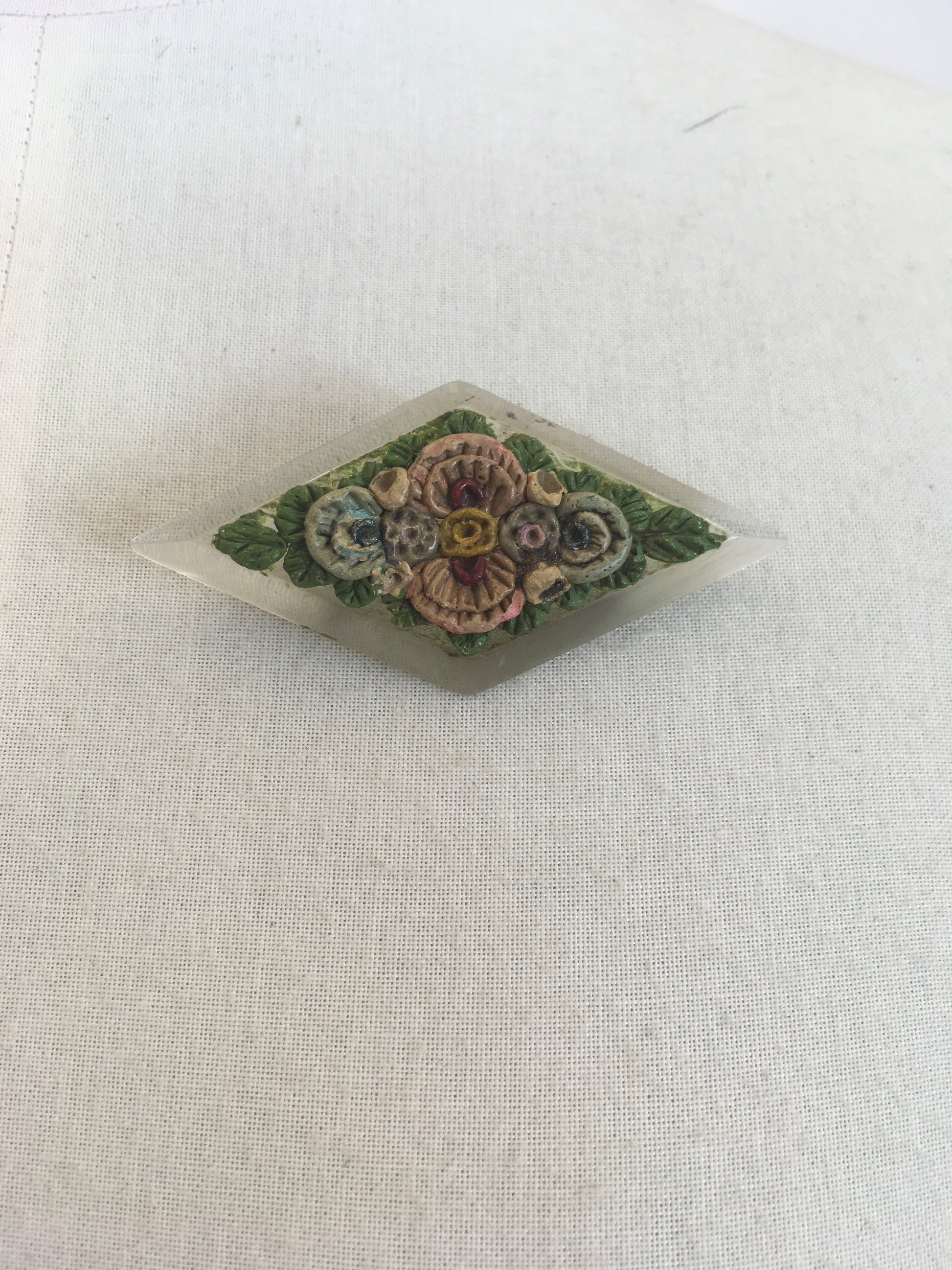 Vintage 1930’s gorgeous lucite brooch embossed with delicate painted flowers which adorn the surface. In colours of pastels - with pinks, blues and yellow flowers on a bed of green leaves. It has a good strong original pin.