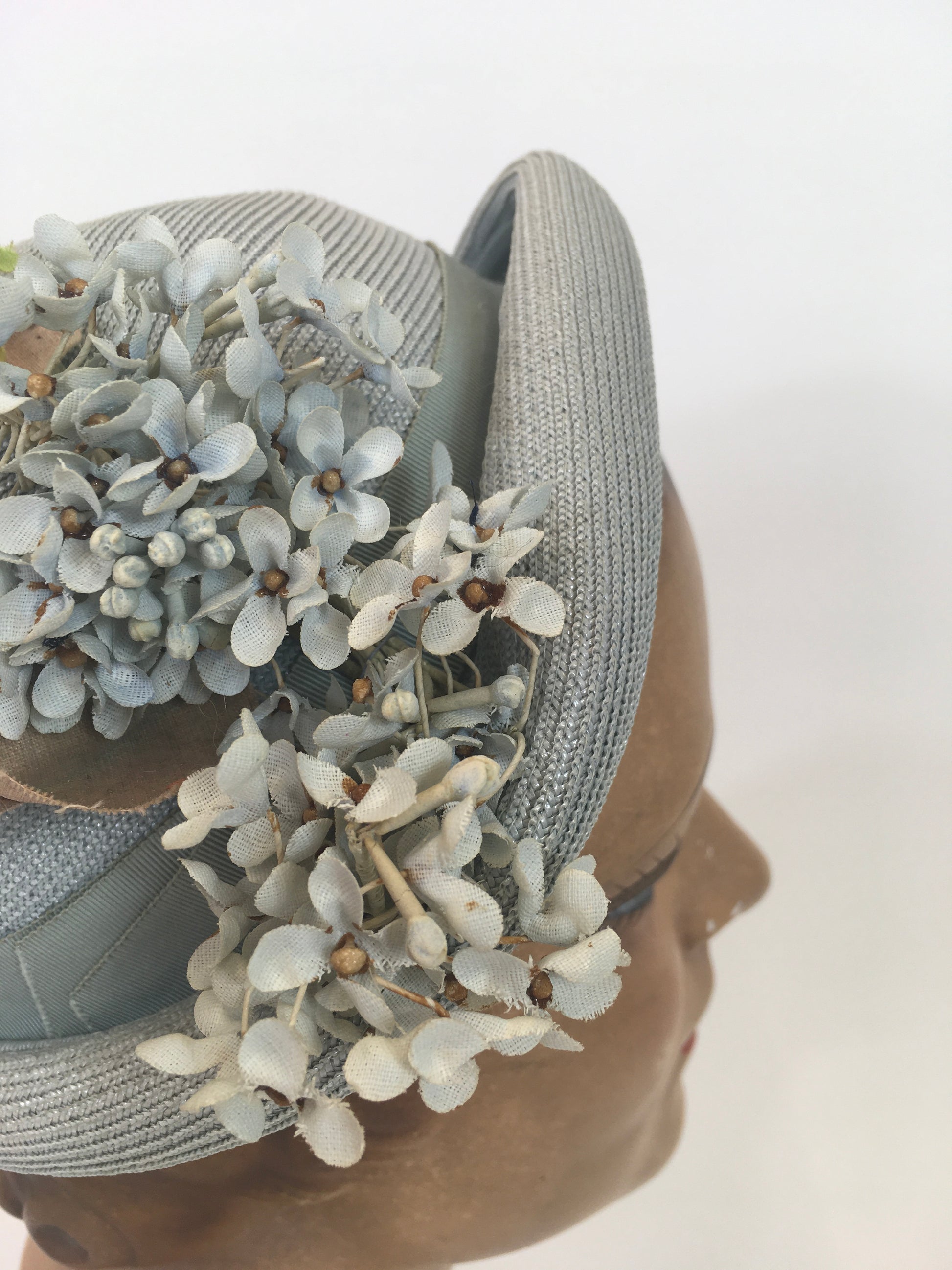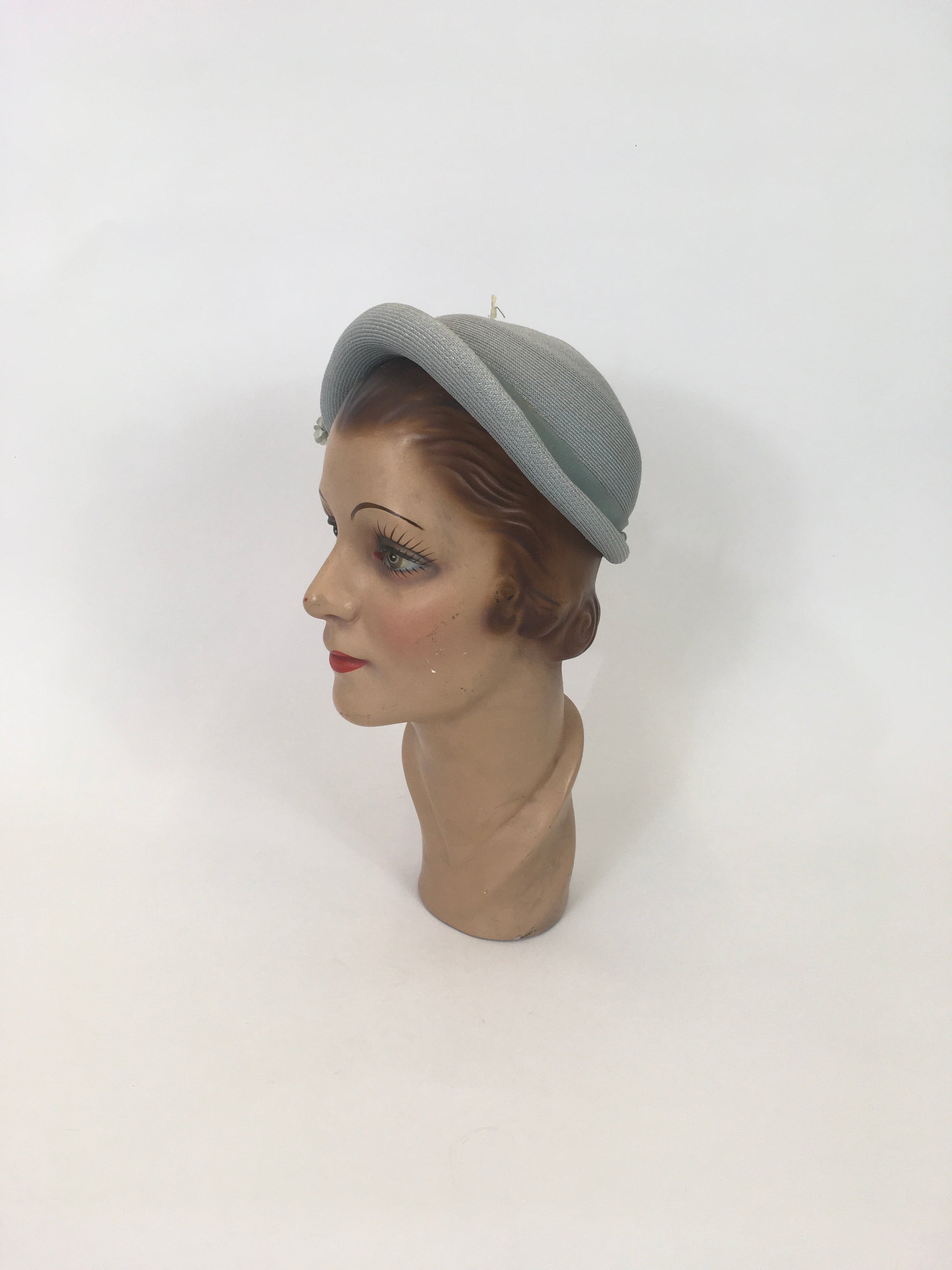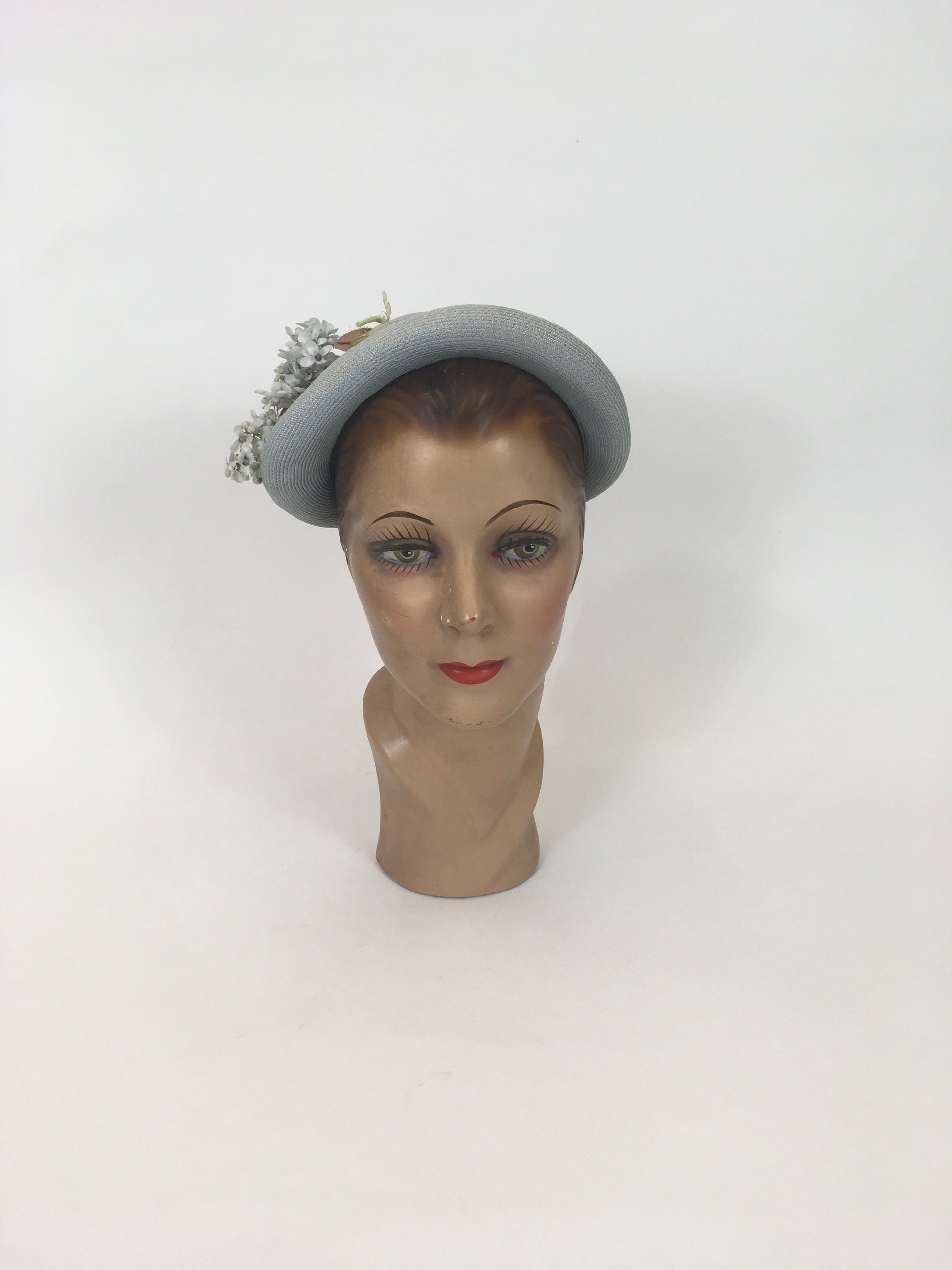 VIntage 1930’s  Gorgeous Fine Natural Straw hat in a pale blue. This beauty is the palest shade of blue it can be. She is quite structured with a beautiful shape. Original cluster of dainty millinery flowers cascades the front body falling onto the upturned brim again in the softest of colours.