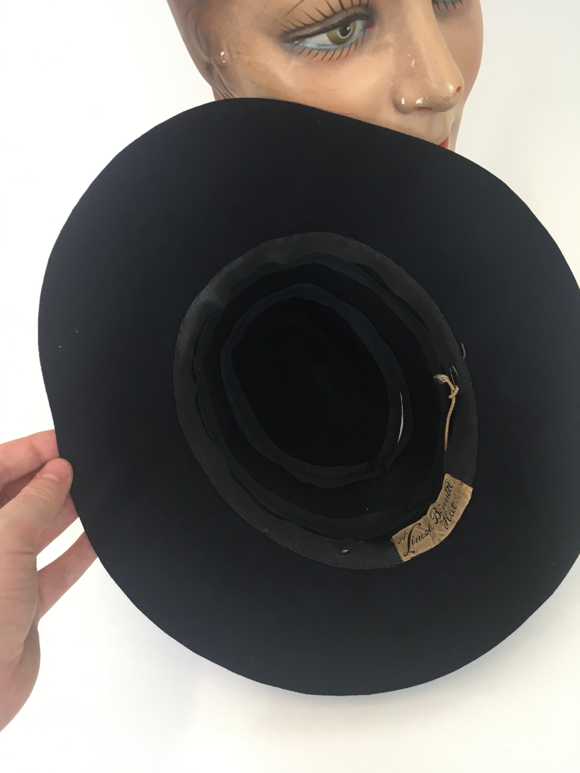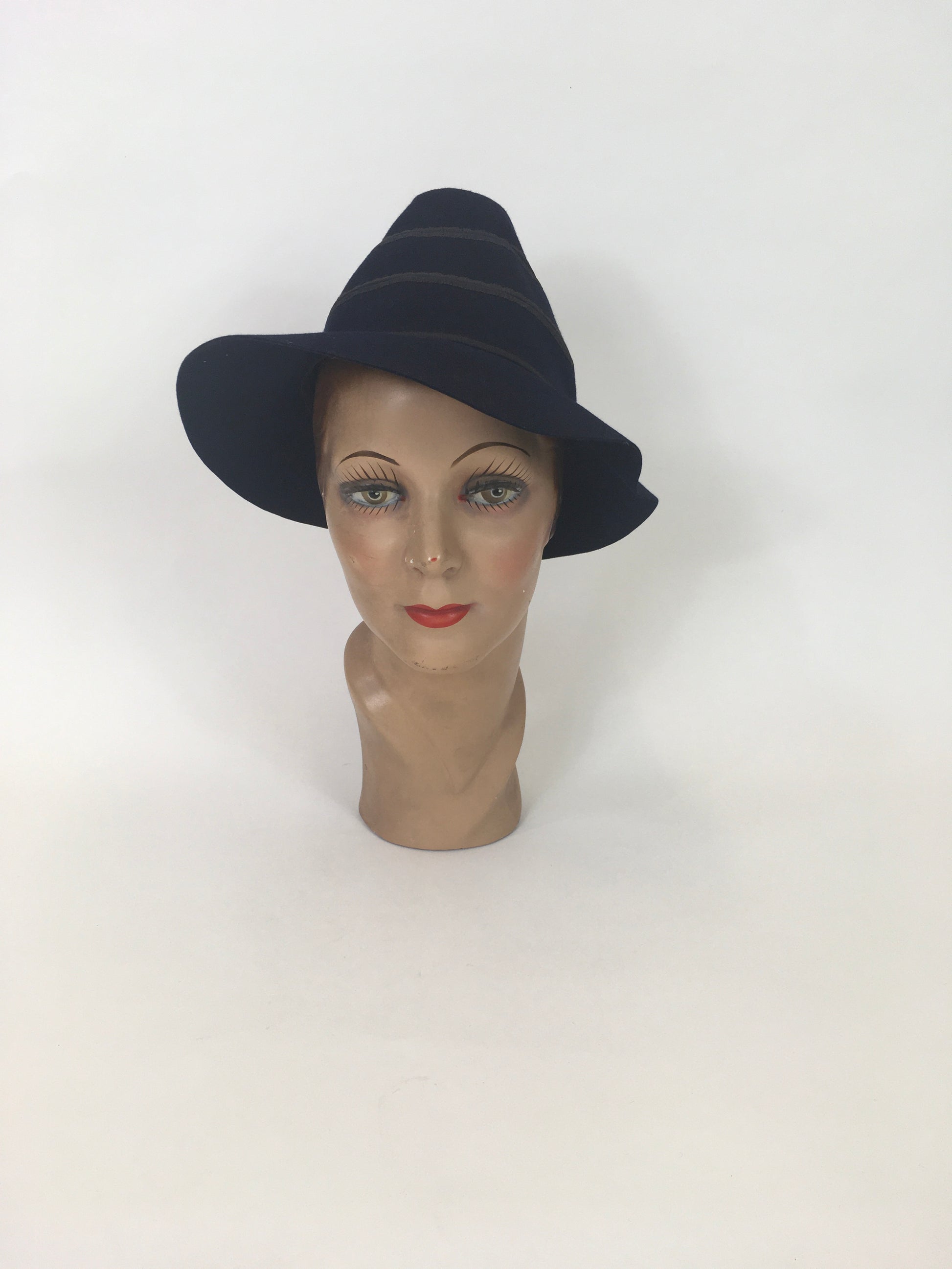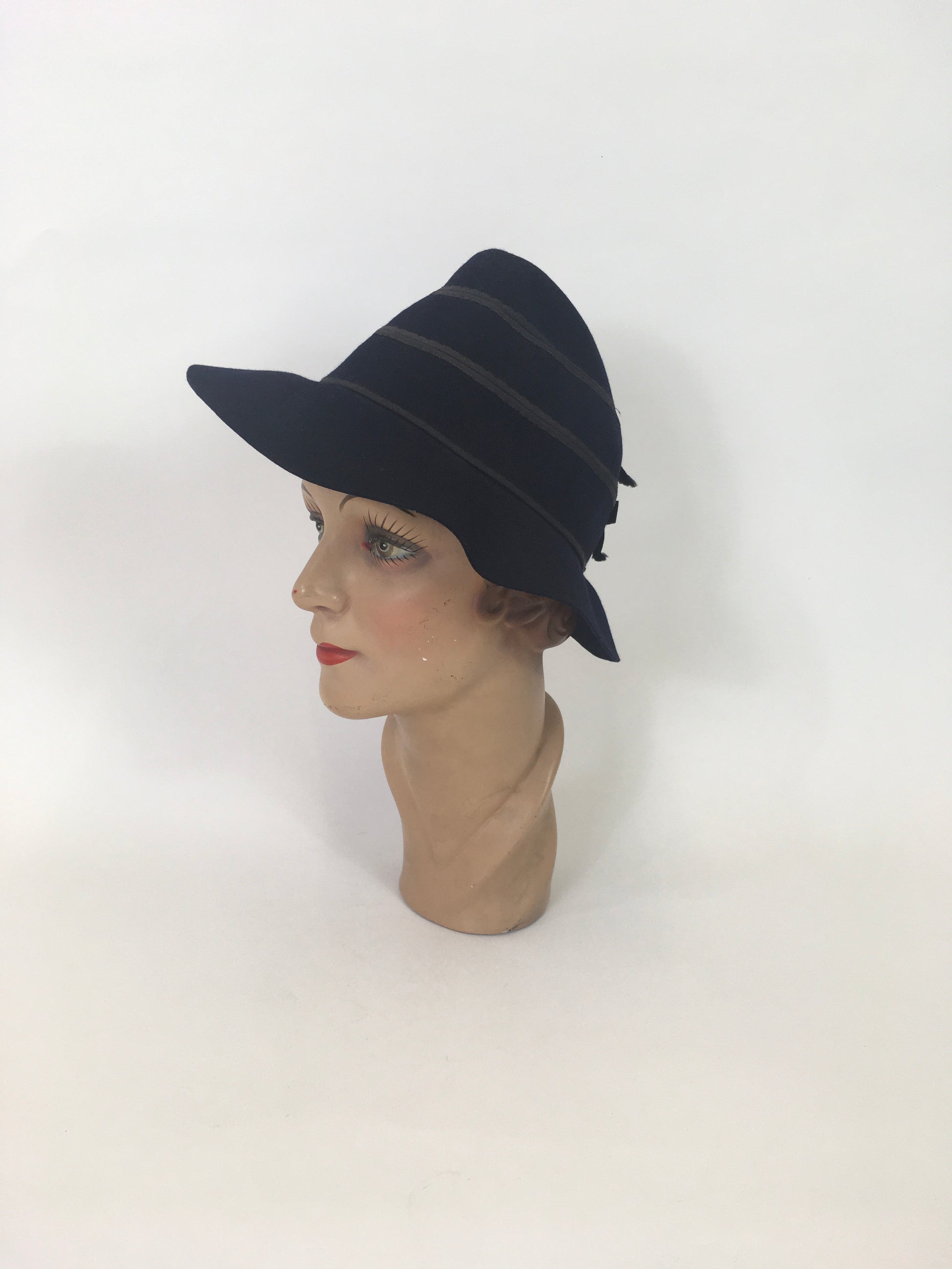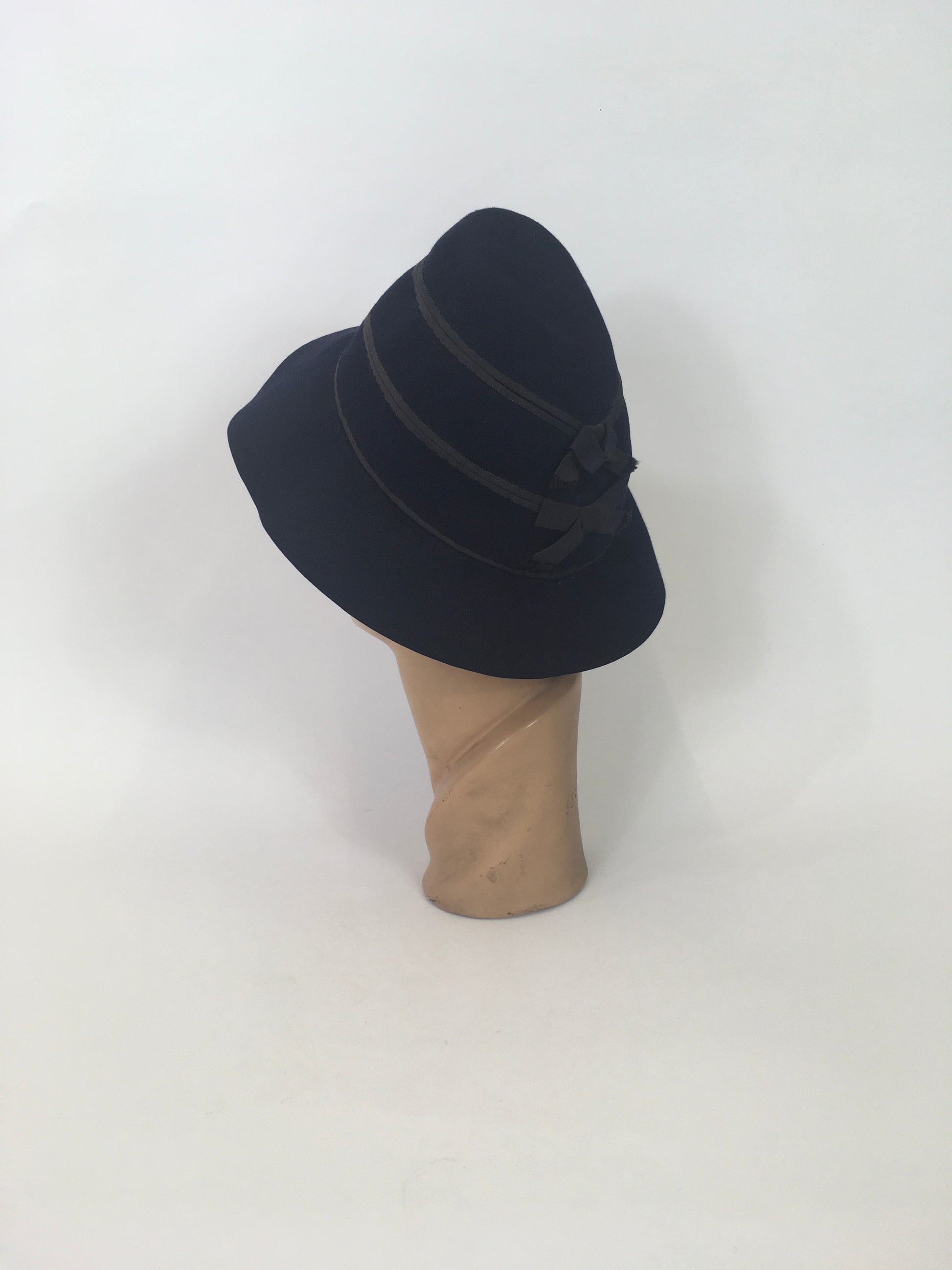 Vintage 1930’s / 1940’s fedora hat with bow detailing in a deep navy blue. This piece is a sublime example from the era and showcases an iconic and must have silhouette. Intricately sectioned with 3 tiers stitched together and adorned with bows this hat has a label by ‘ A Lincoln Bennet’ .