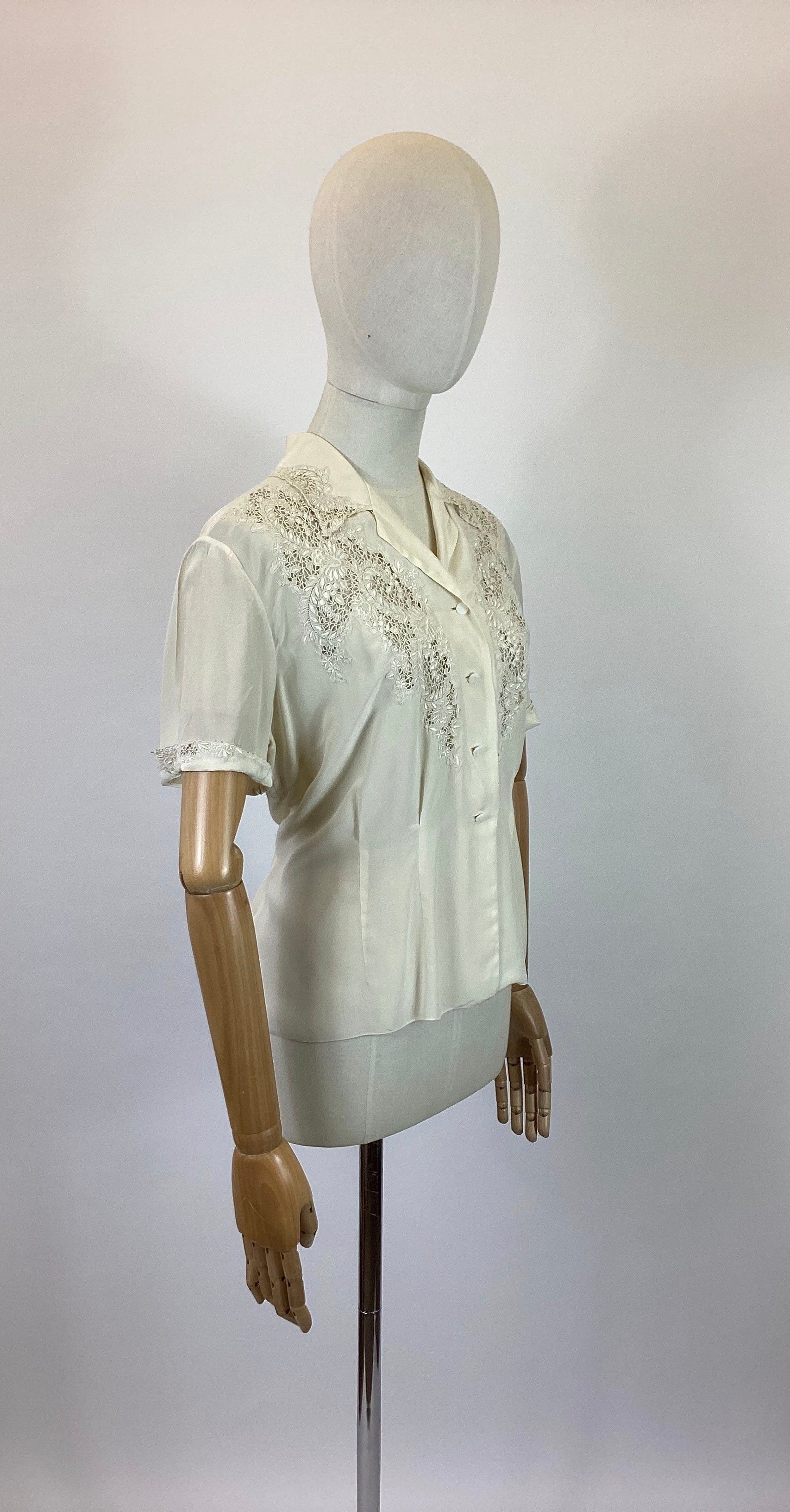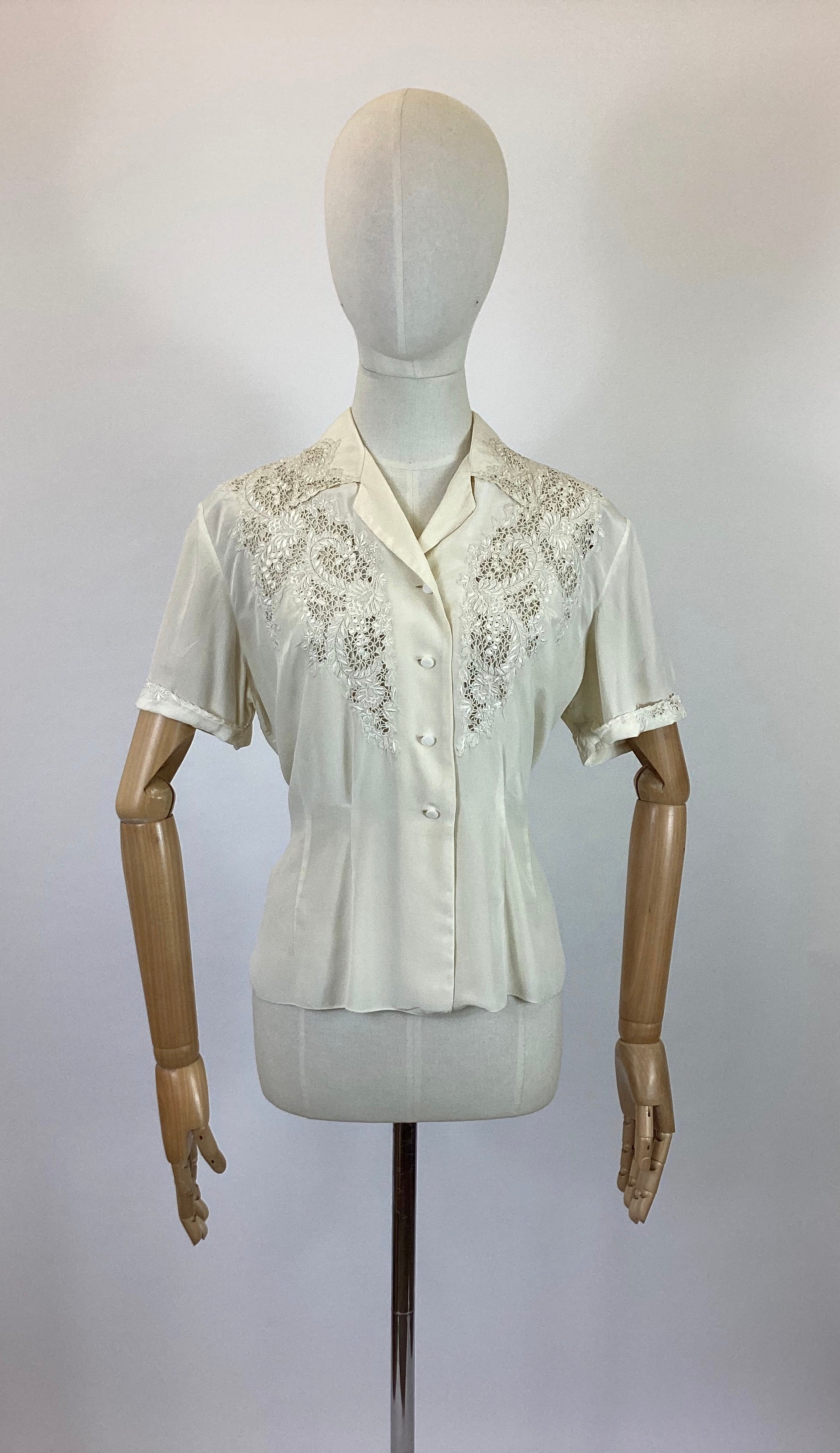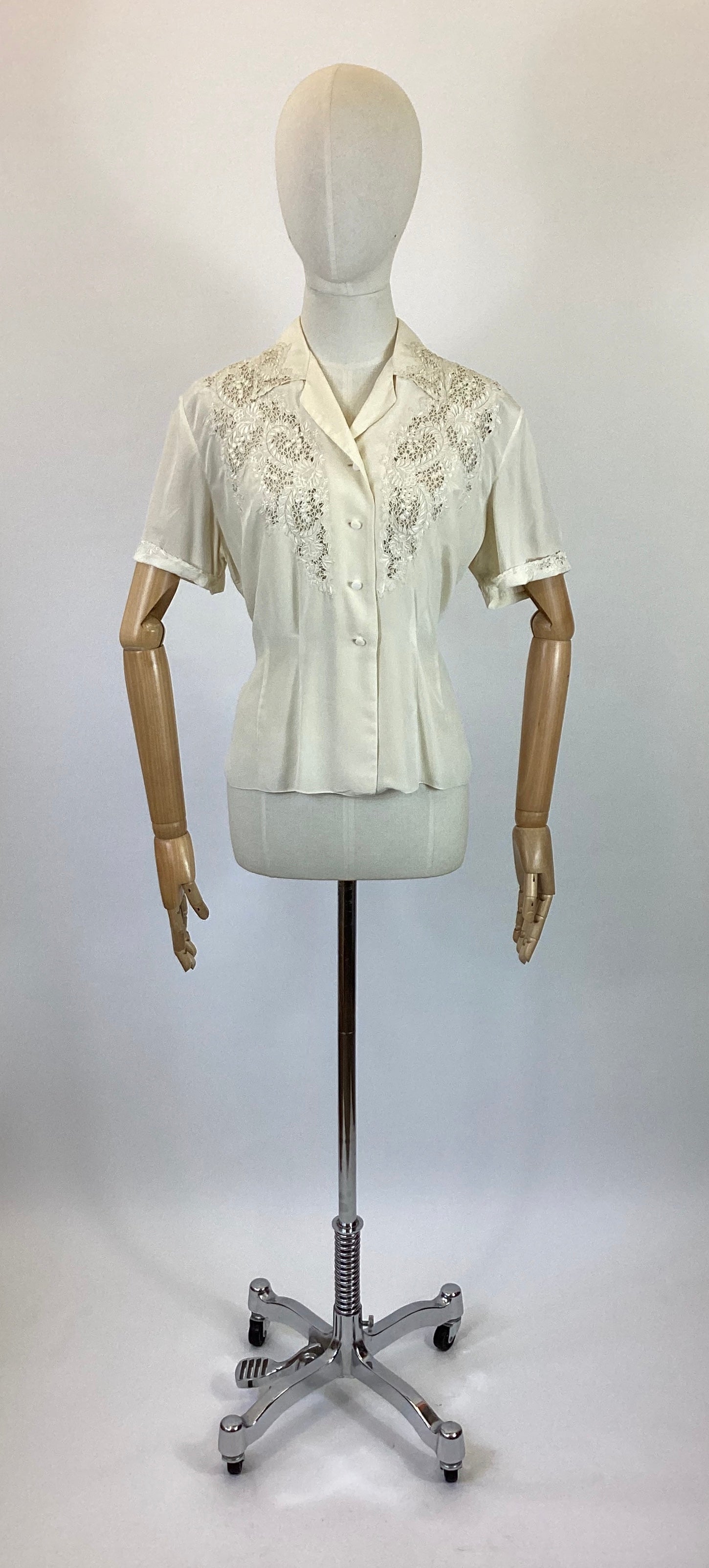 Delicately embroidery over collar and front yoke and corresponding cuff, on its short sleeves. With bust darts and double waist darts to the front and again darts to the back for that all important 40’s nipped in waist look. 4 x button opening to front.