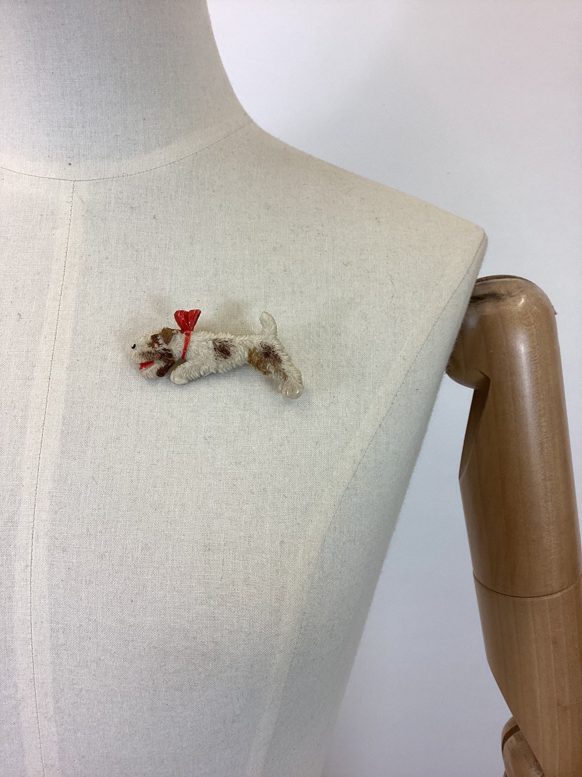 such a handsome Chappie. Cream and brown wearing a cute red collar. Looks like he is making a run for it. Secure and strong pin to back.