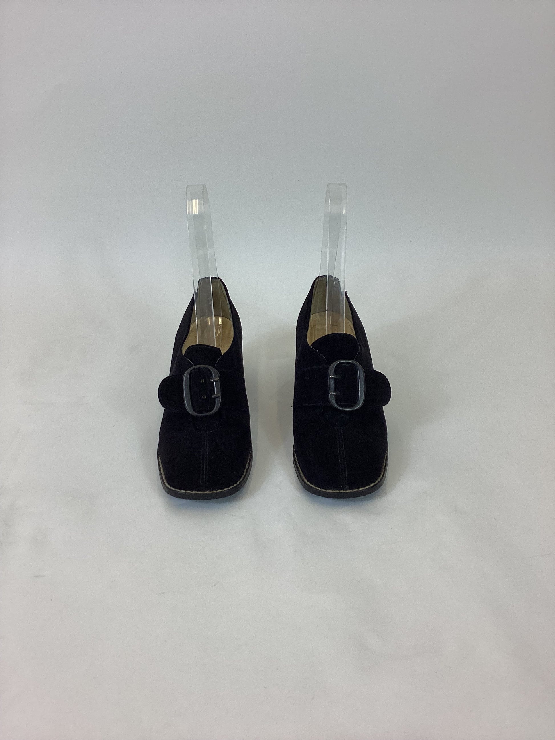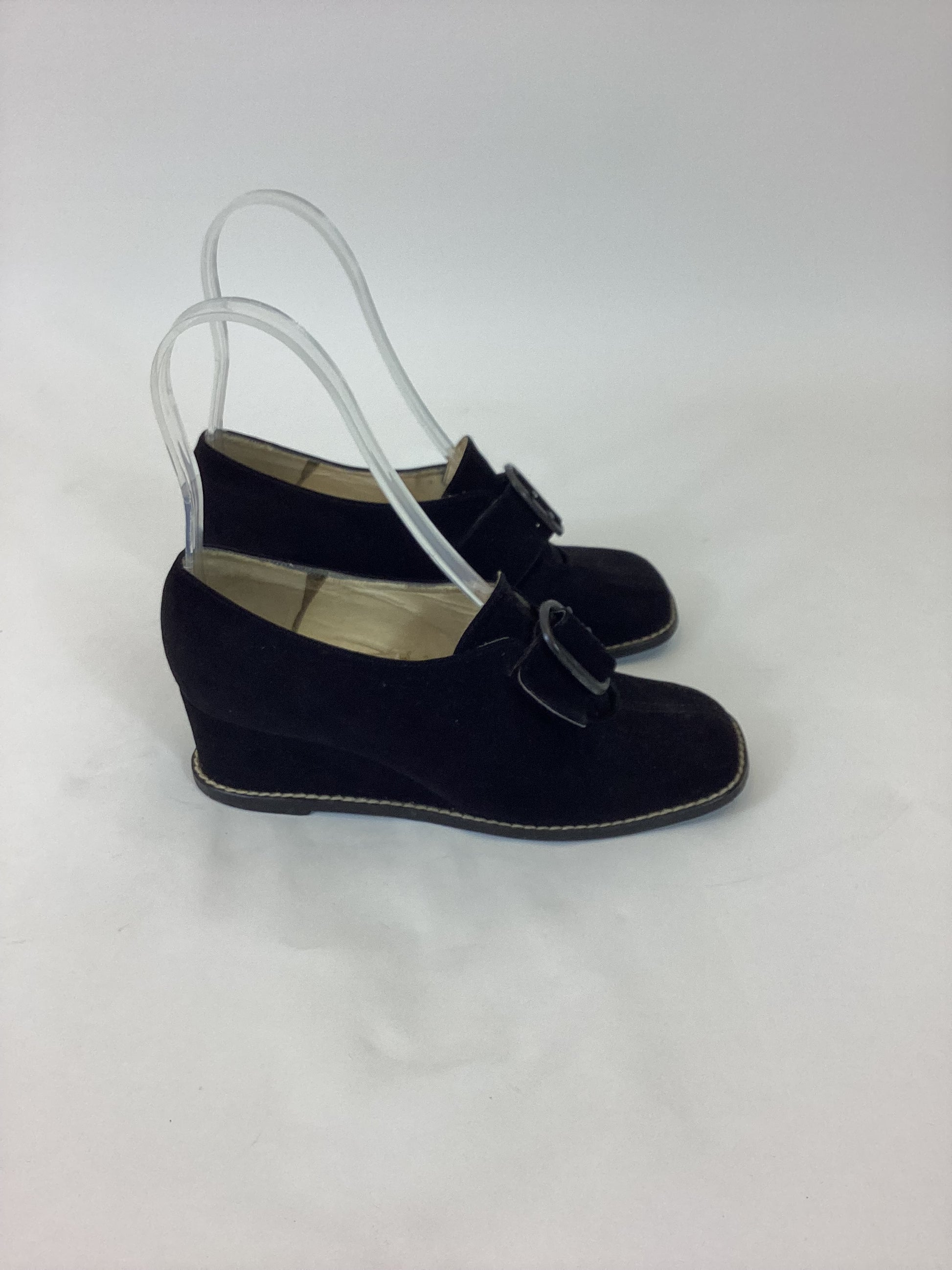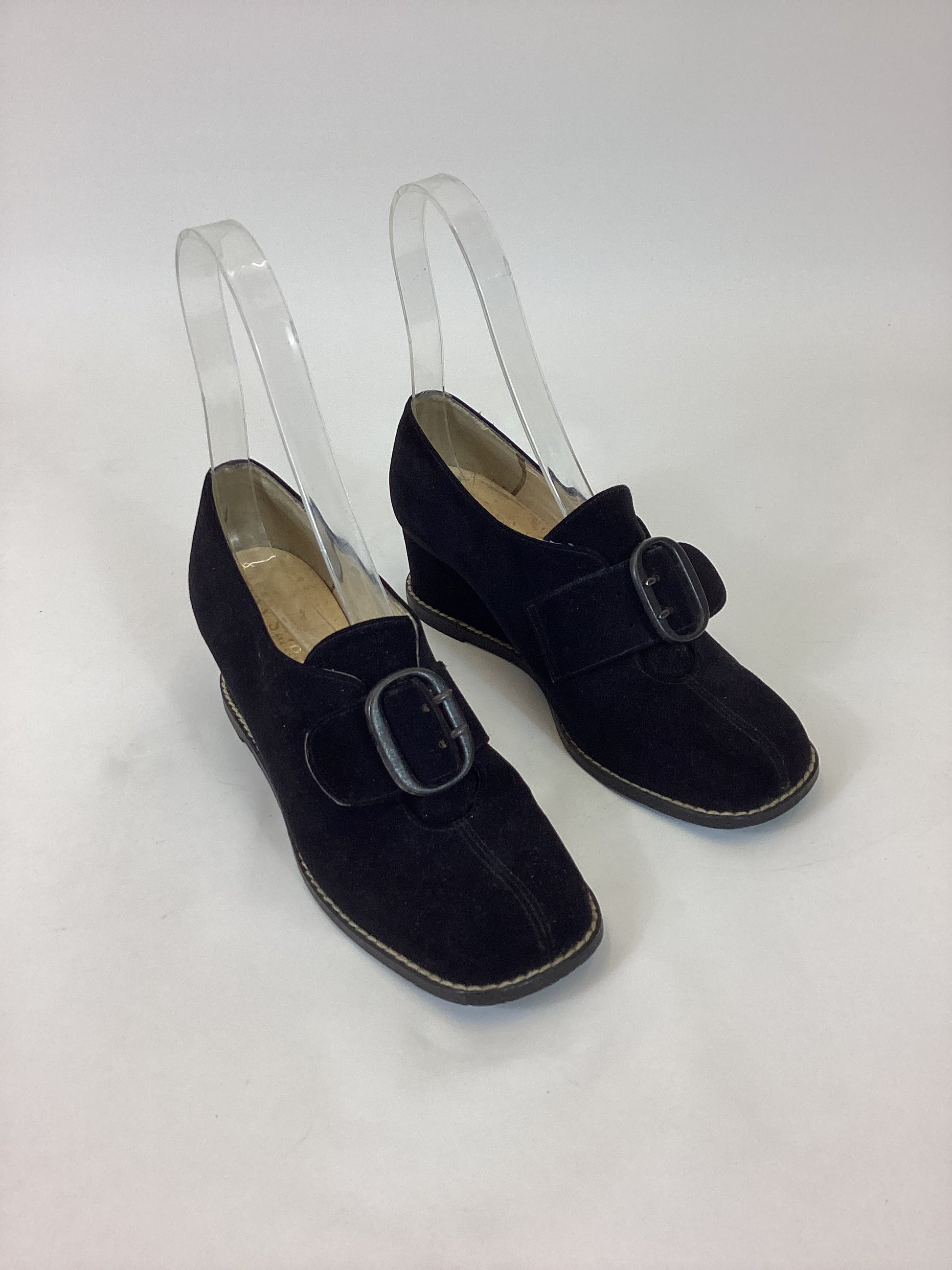 Vintage 1940’s gorgeous wedge shoes in black suede. Such a fabulous pair of shoes with a good comfortable 2” heel/wedge. Predominantly Black suede with contrast cream stitching to shoe base.. good quality “Elliott Paris” France stamped. On the front there is a buckle, not just for decoration, It can be adjusted slightly for foot width. My guessing only worn a few times, the suede body of both shoes is in very good condition.
