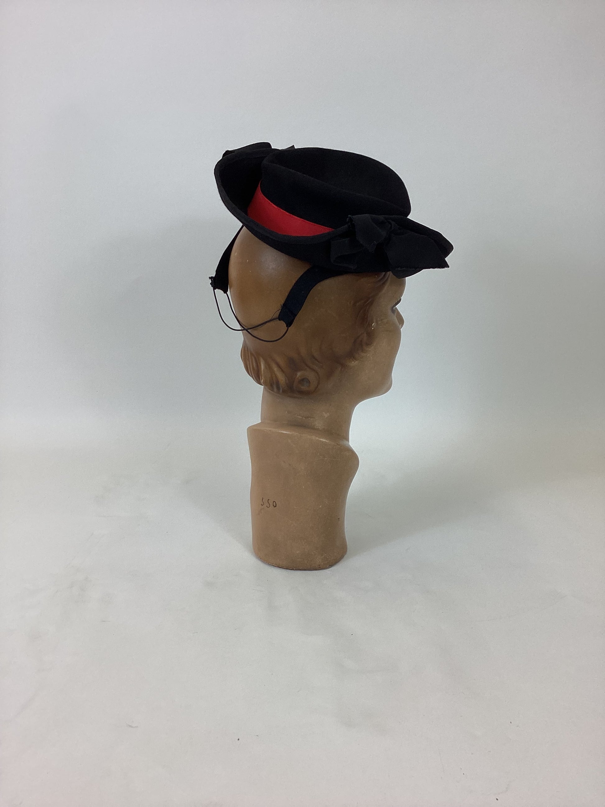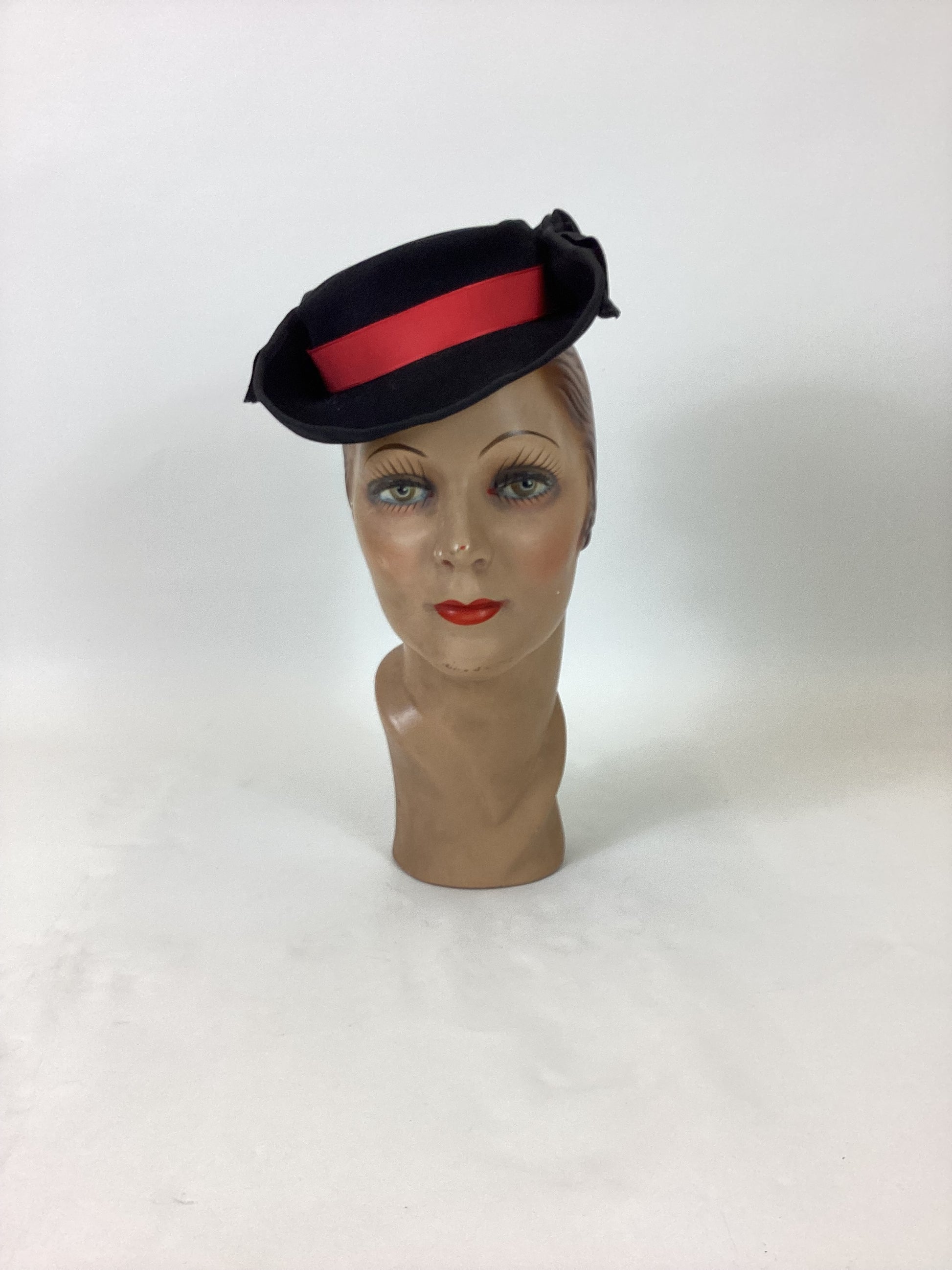 Vintage 40’s gorgeous small topper in Black / Red combination. Unlabelled but certainly an American beauty. Black felt structured with upturned sides, shallow crown adorned with contrast red 1” deep ribbon. Black gross grain ribbon bows to each side adds more intricate detailing. Internal felt and elastic band to help secure on head.