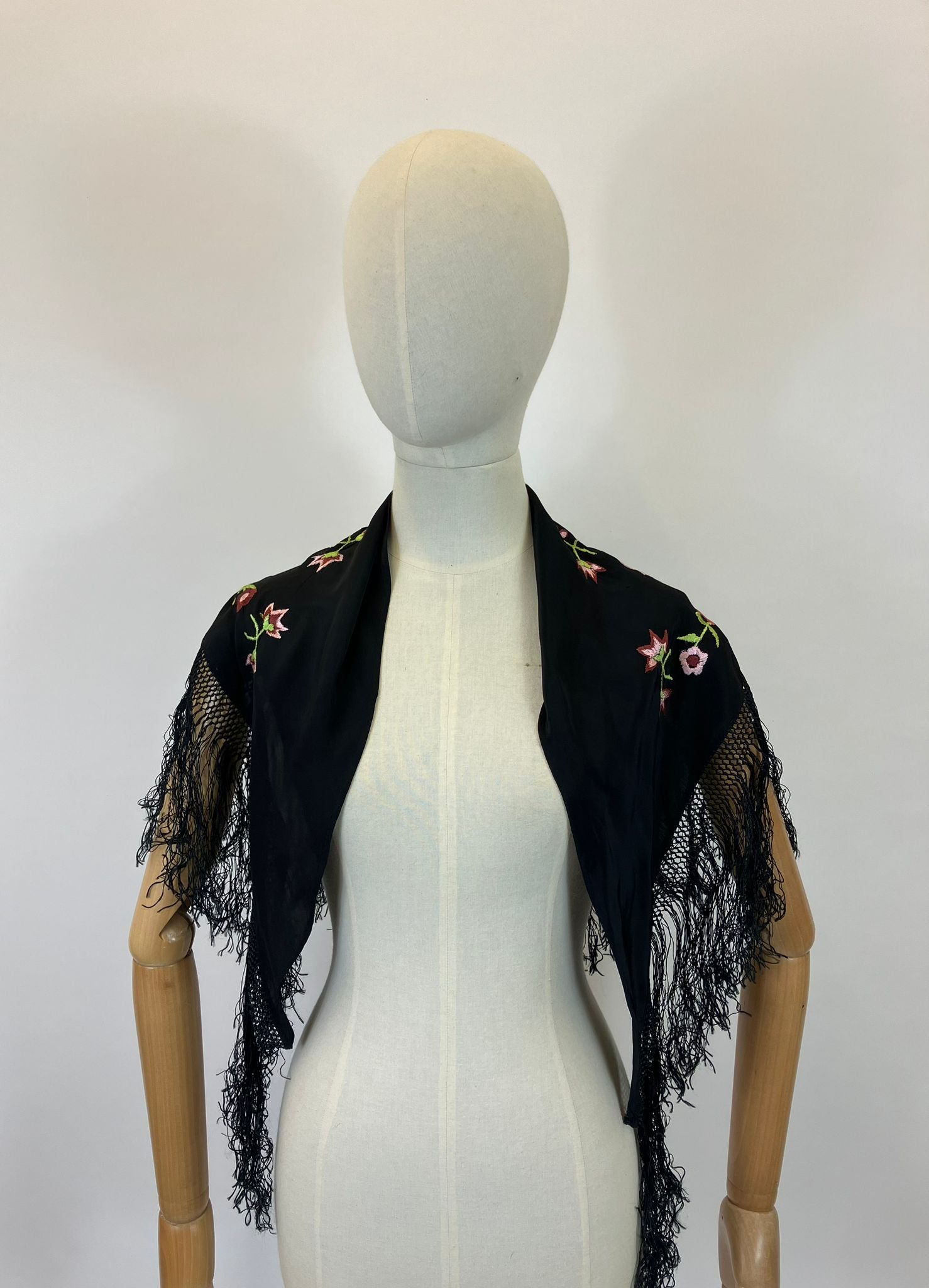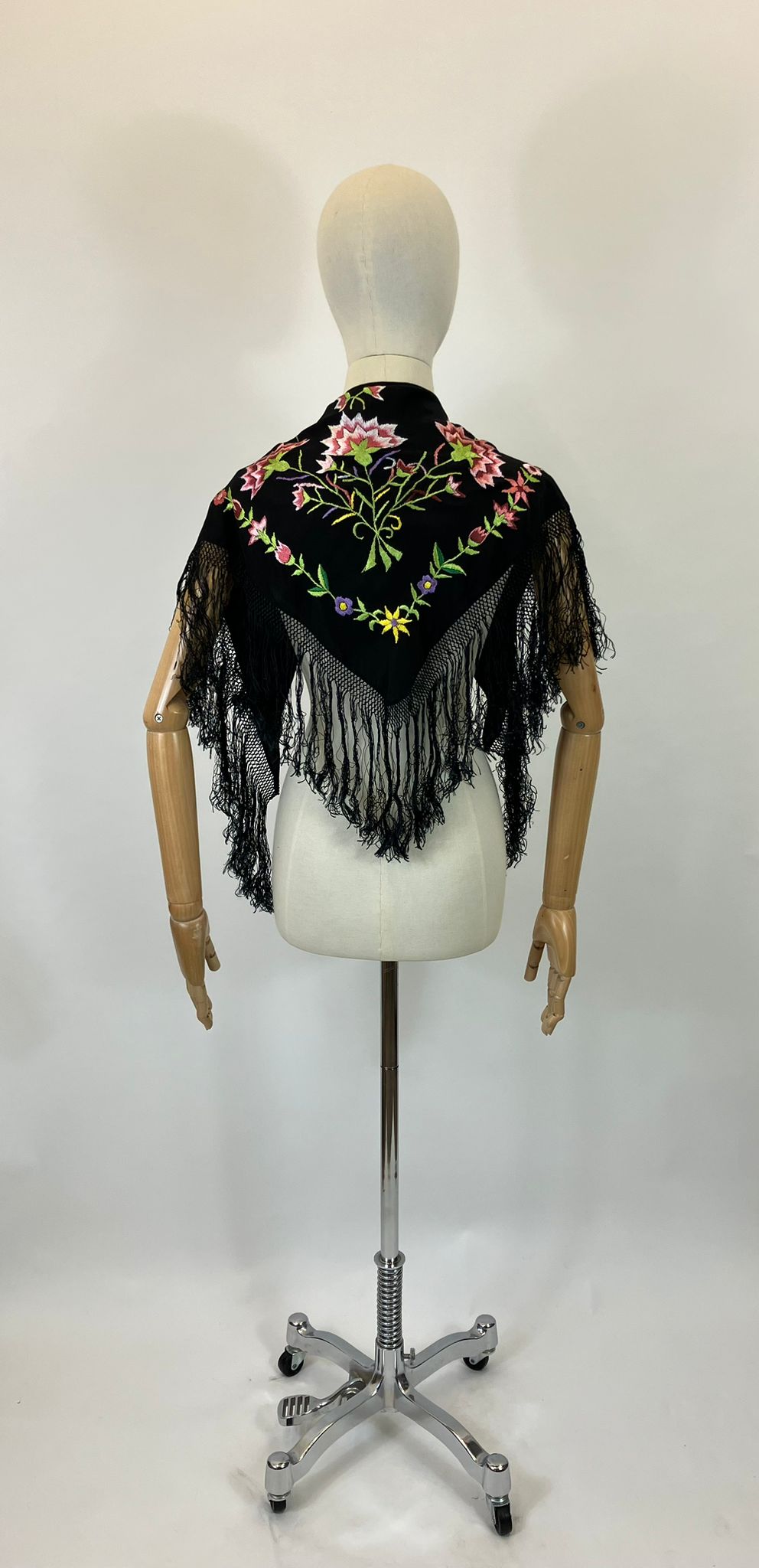 Vintage Fabulous Early Shawl - hand embroidered to a high standard and quality.  Lovely shades of purples, pinks, yellows and green bouquet to middle and with delicate flowers embroidered around the edges on a simple black background. With lovely tassels at 7” this is a handy shawl to wraparound your shoulders over a simple black cocktail / day dress.