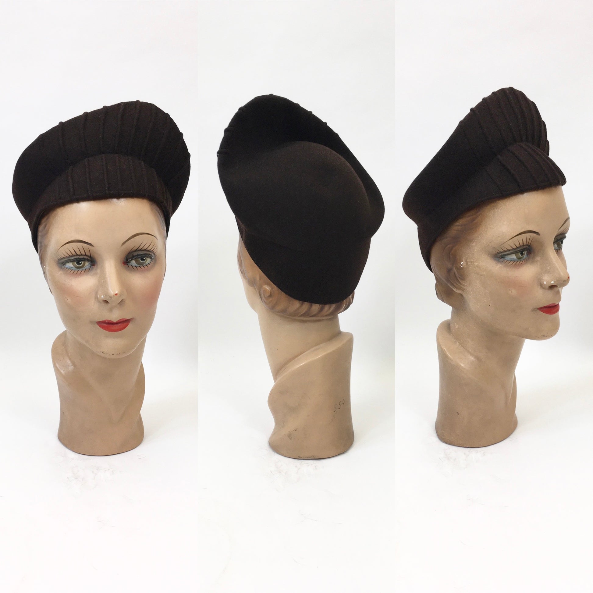 Vintage 1940’s amazing hat in chocolate brown colour. Structured to the front section, with an asymmetrical appearance to one side, with a sewn pleating detail only to the front. Made of felt. Sewn bias binding to the inner rim. The front fades down to frame your face. Shallow crown at 4” with upturn at front raising above this.