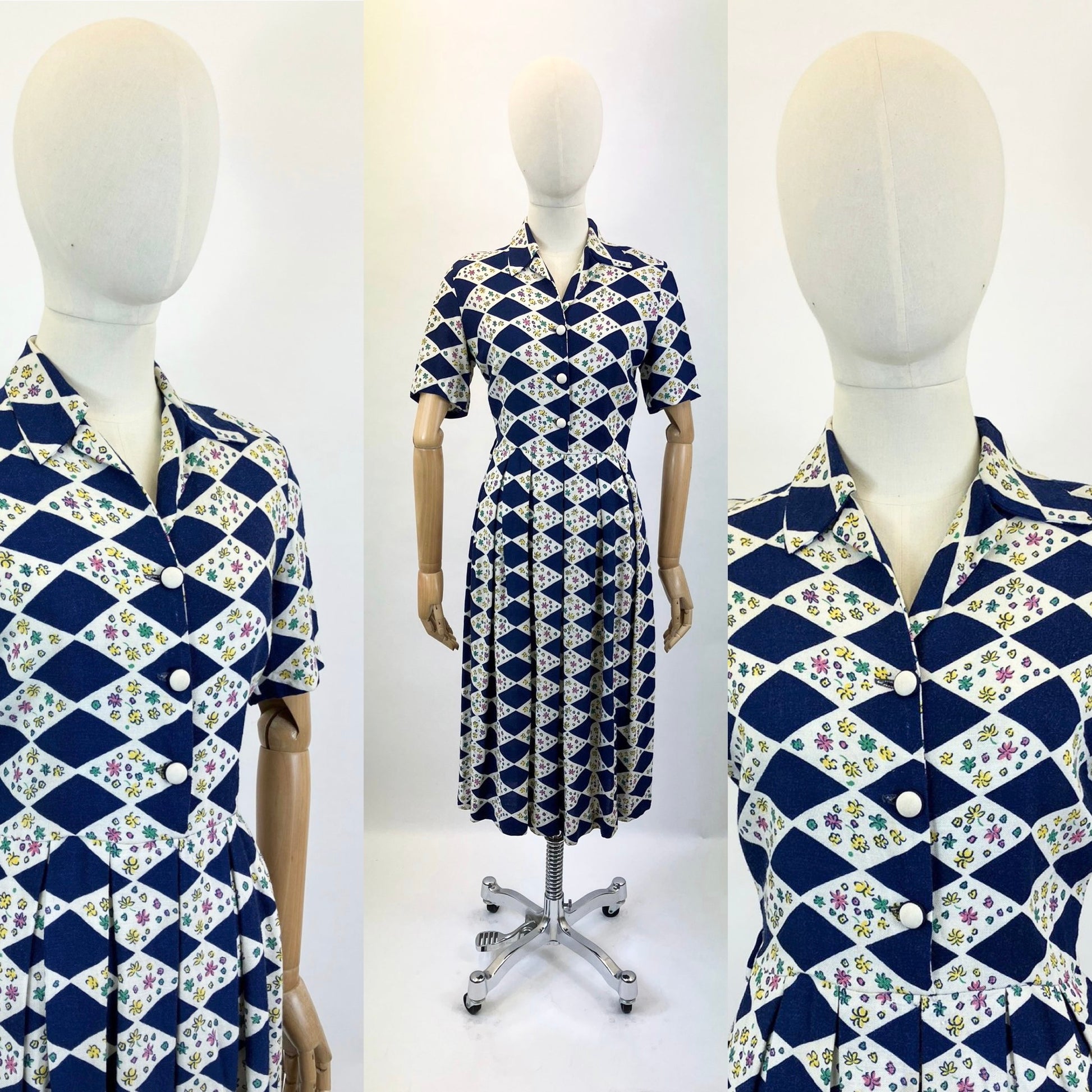 Vintage 1940’s Moygashel linen dress with Harlequin / diamond pattern. Royal Navy and White with dainty flowers of yellow, pink and green. Small collar, good shoulder pads. Covered buttons to the waist . Side opening with press studs. Short sleeves and pleats to the skirt. No labels on this but well made. Sadly no belt, but belt loops still in place.