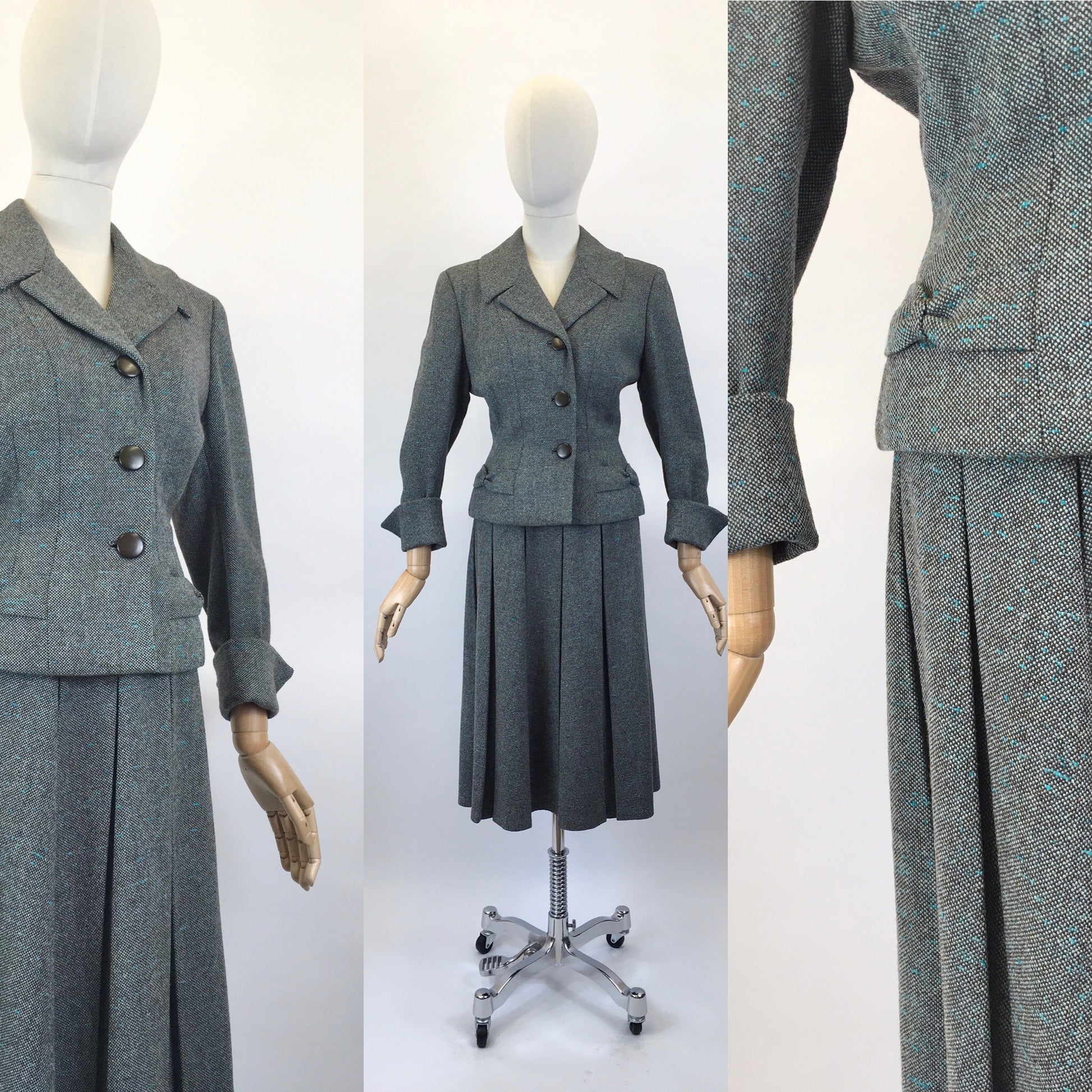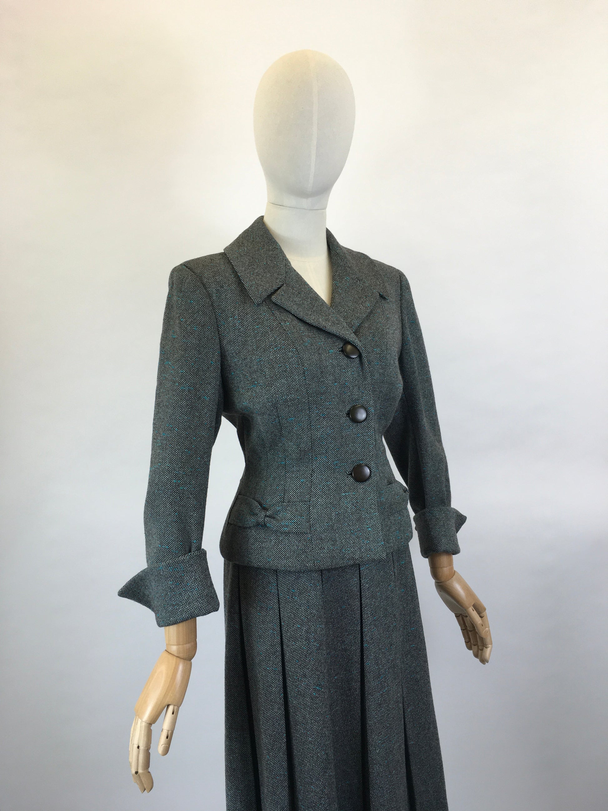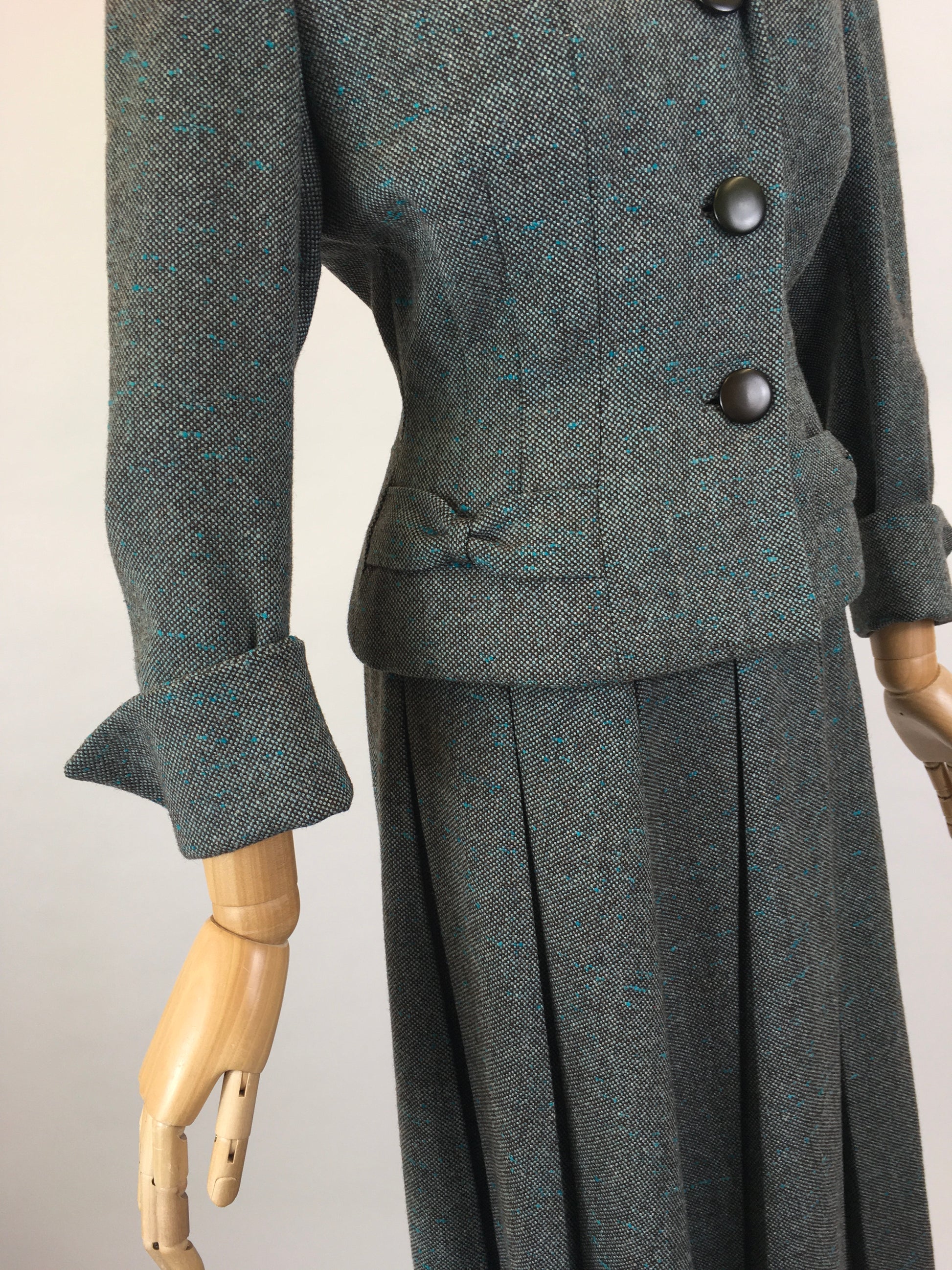 Original late 1940’s Woollen 2pc suit by ‘ Harella’ in a beautiful grey toned wool with a bright teal fleck. This suit features a classic shapely silhouette. The jacket has a strong shoulder line, pointed collar with 3 button front, 3/4 length sleeve and bow adornments to the pockets. The skirt fastens with a metal side zip and features box pleats which oozes wartime fashion styling. This suit looks lovely worn as a 2 piece or equally as nice as separates with other garments for varying ensembles.