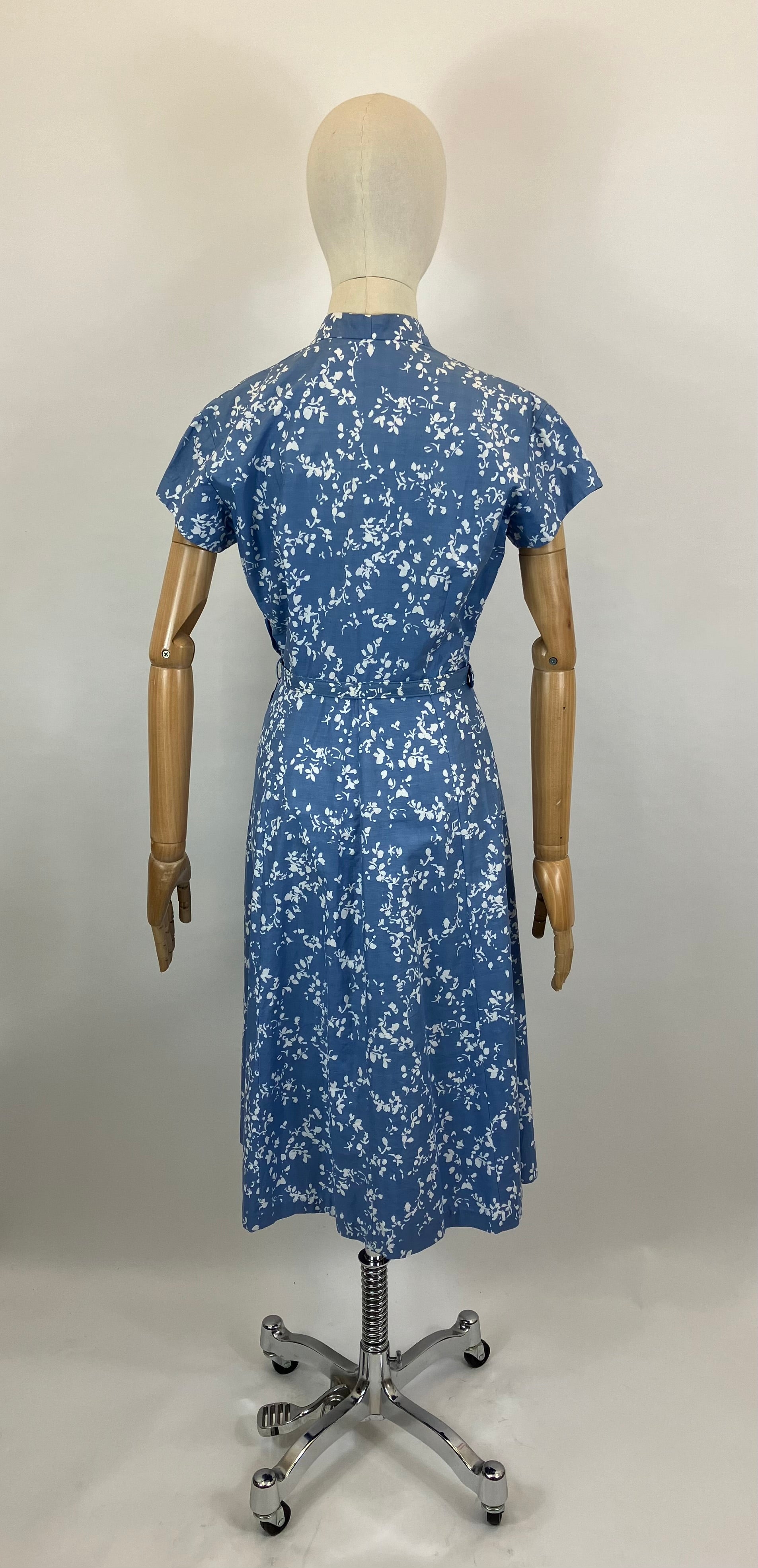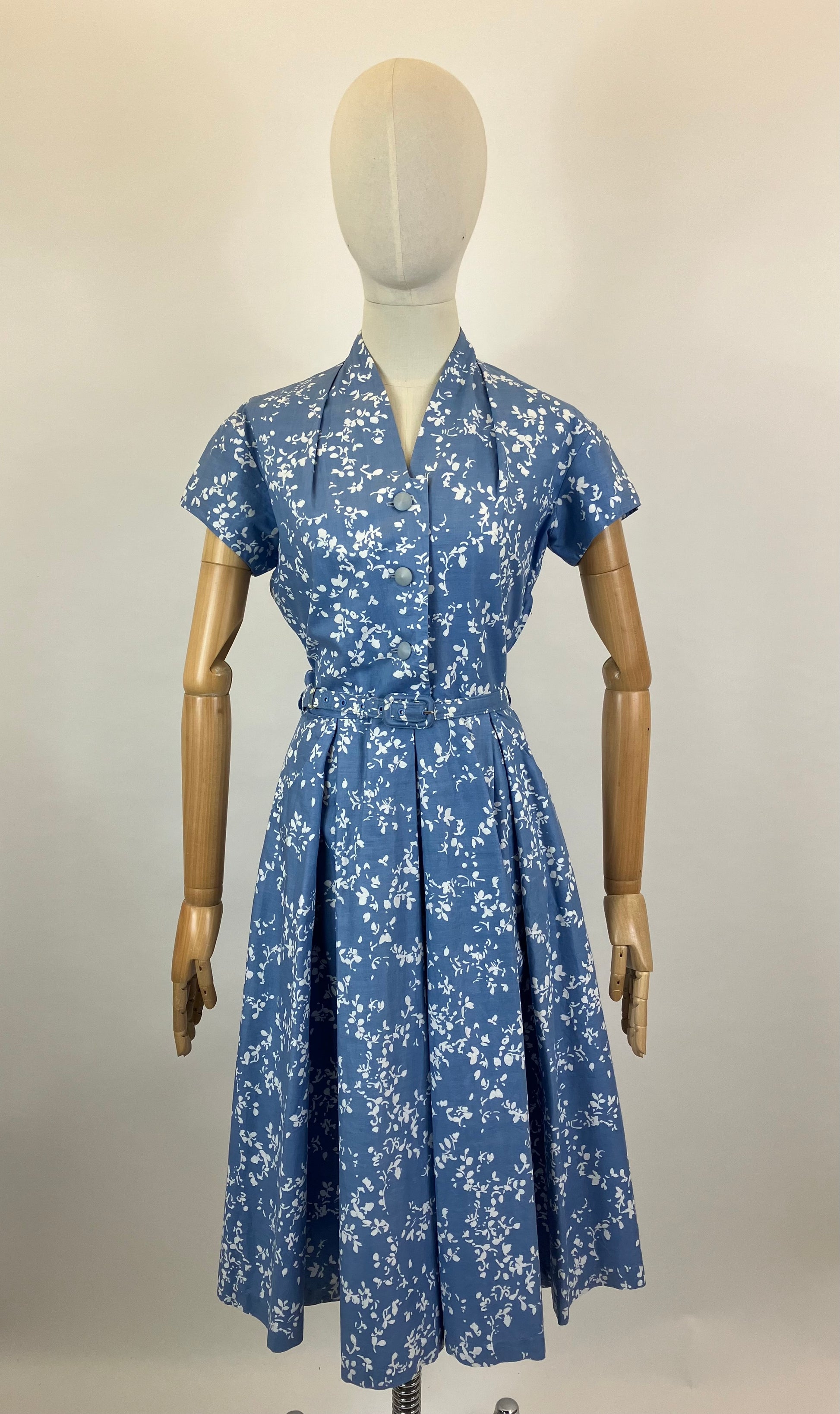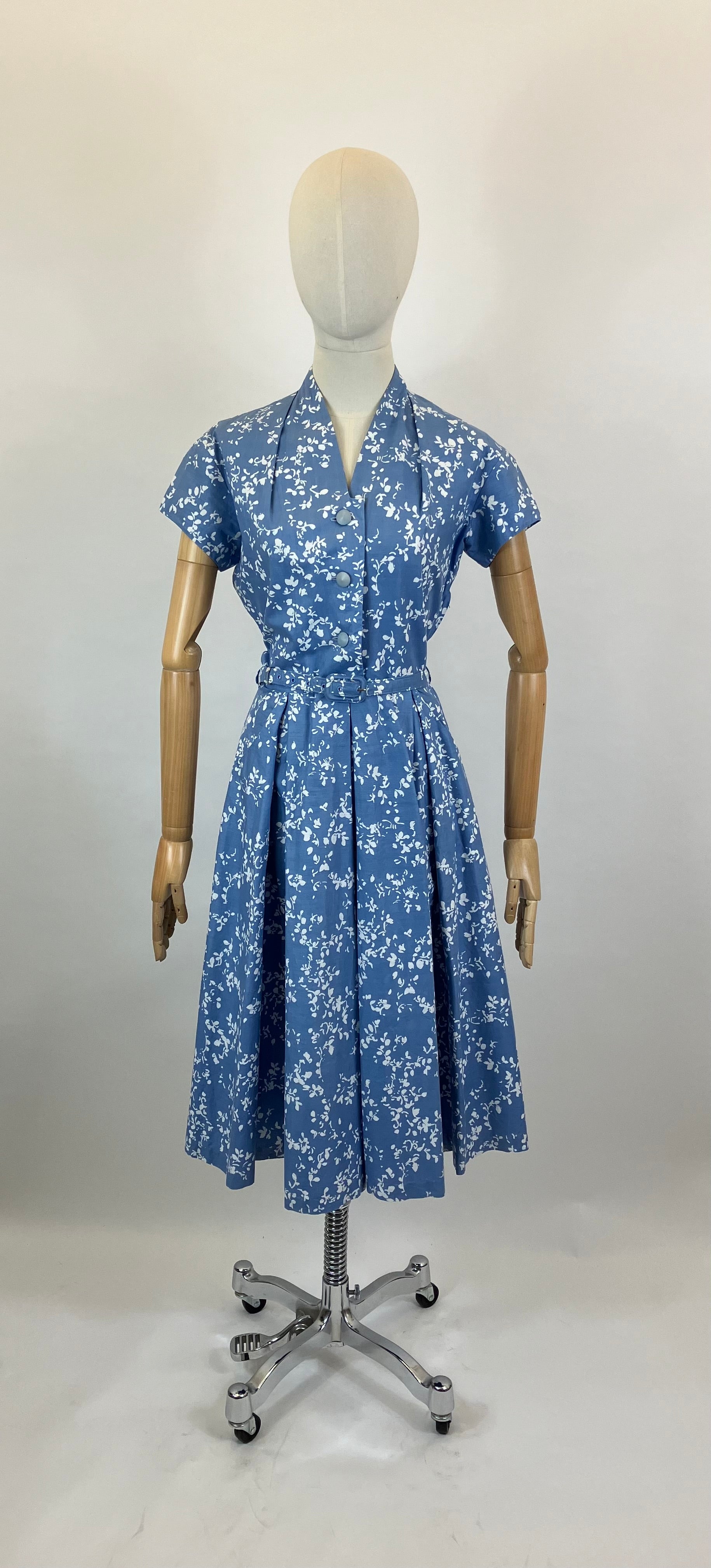 Vintage 1940’s/1950’s cotton day dress in Powder Blue. Certainly a beauty. Gorgeous cotton dress with “Cleggs “ of Manchester label. She has a floral abstract print with 3 x centre button opening along with side metal zip. Sweetheart neckline, collarless with wide pleats to the skirt and fabulous pockets. It still has its original belt.