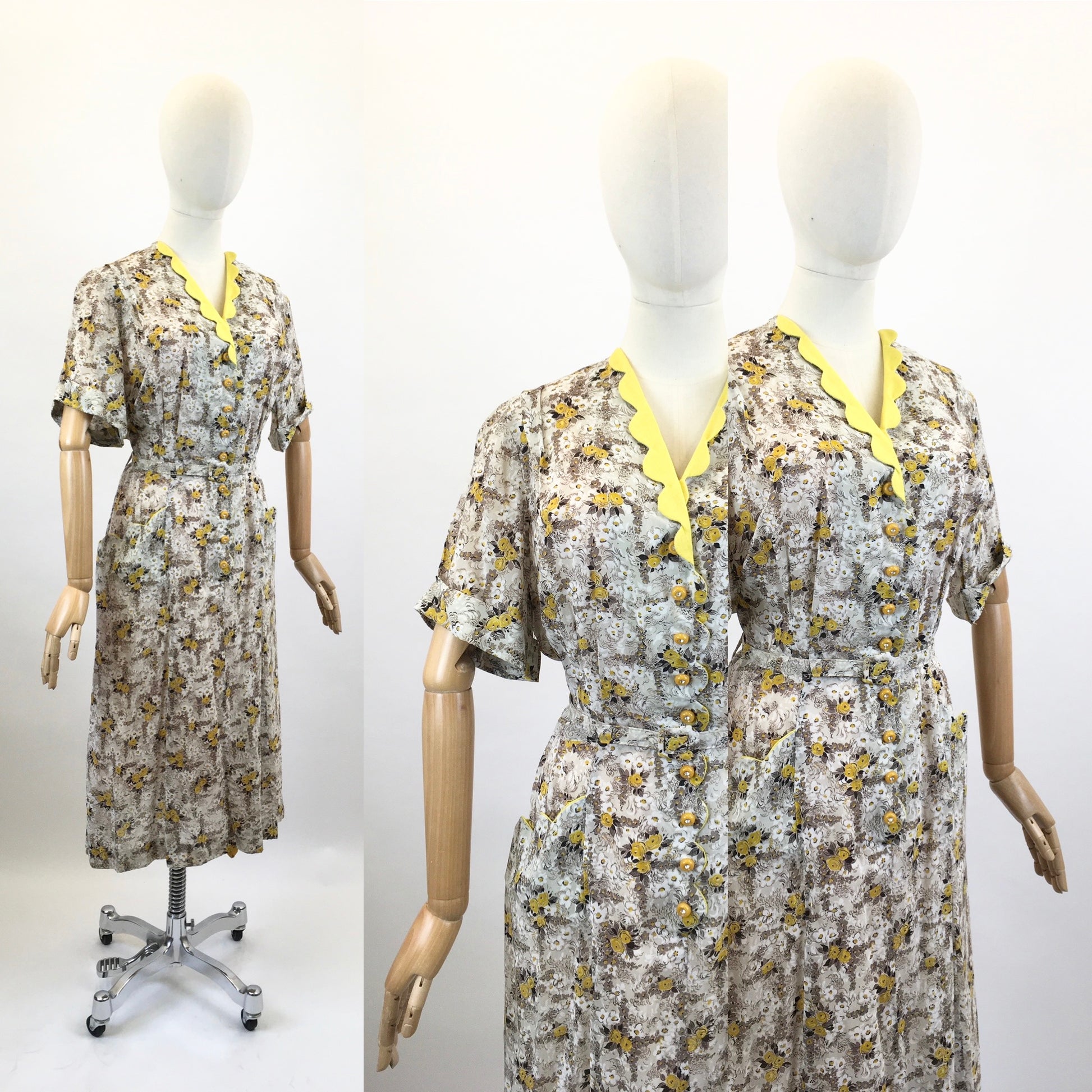 Such a beautiful dress , made of sheer rayon and with its original tag and original belt. The belt is backed. The dress features contrast yellow scalloped detailing to the neckline and edge of pockets . The contrast is made from linen and backs the above detailing. Button down front with scalloped edging. Fabulous pockets. Short sleeves with a slight turned up cuff. The buttons are paste jewell in the centre. "Enka Sheers all Rayon dress" label with care label and paper label sits within the back of the nape indicating ( 20.5) No shoulder pads but some could easily be put in. A slight pleat to the shoulders draping to the front bust.