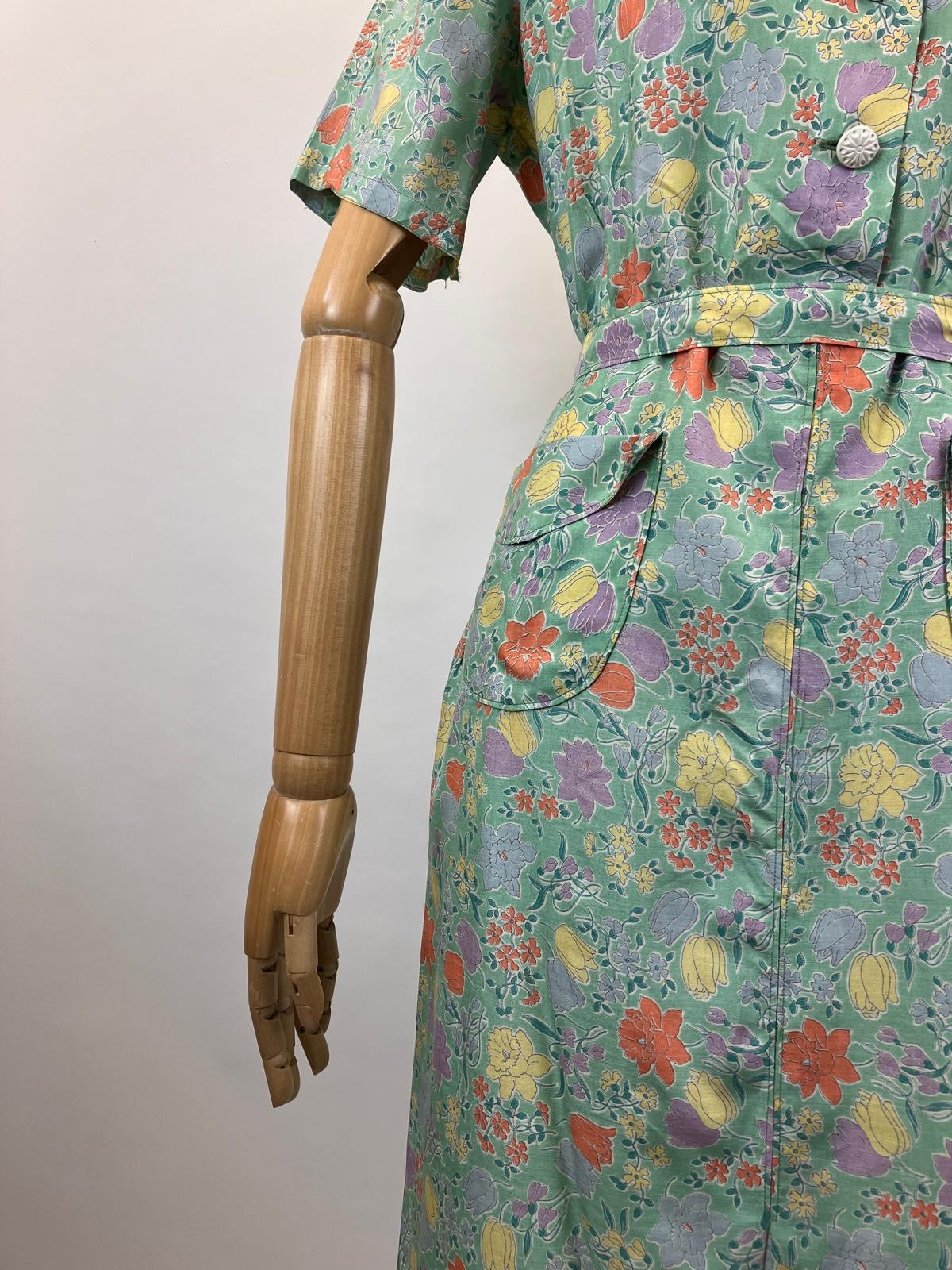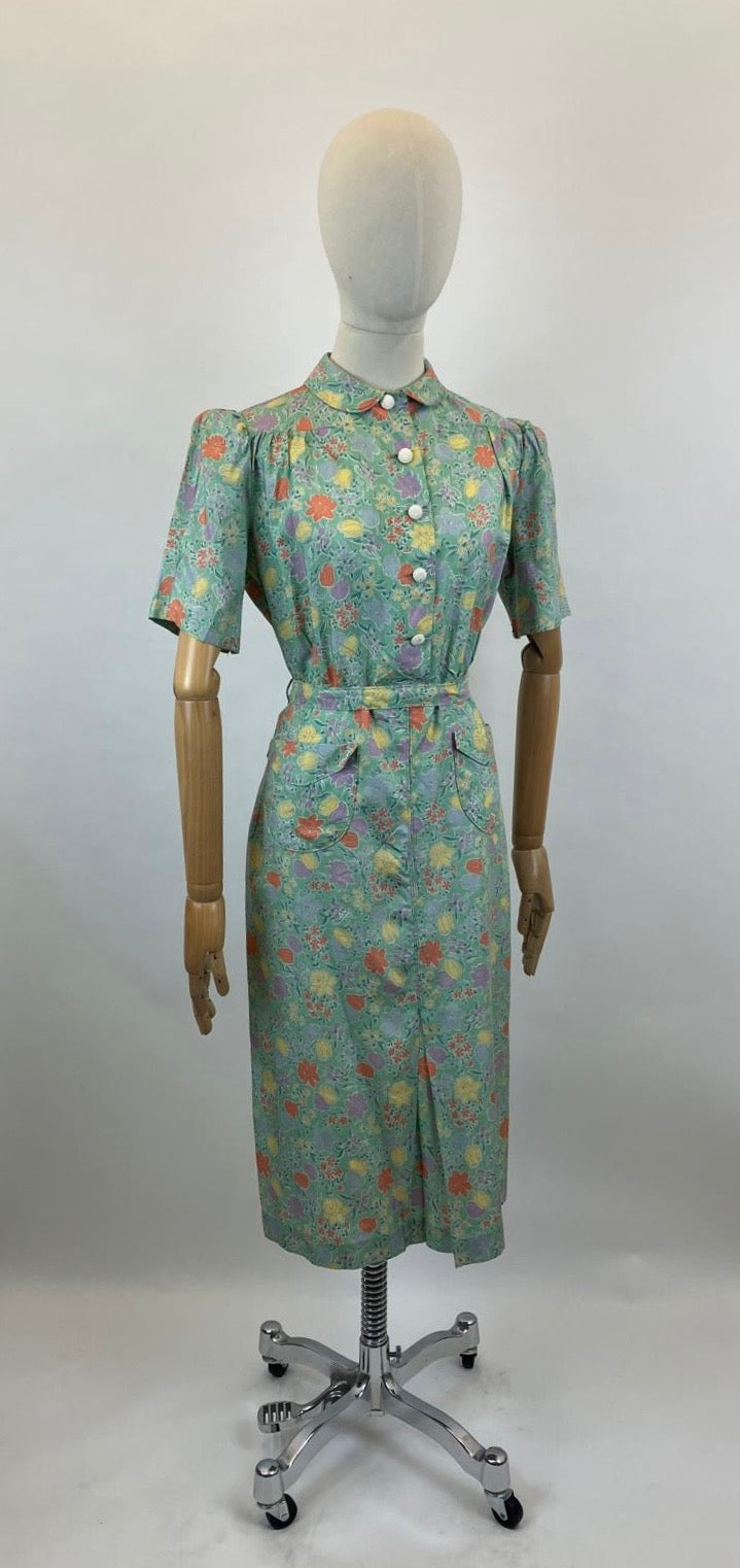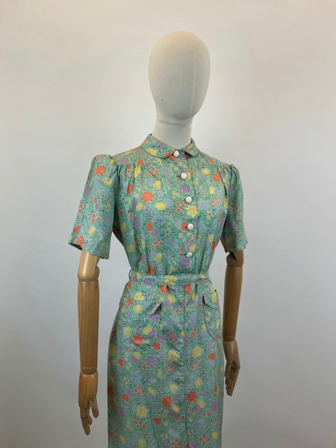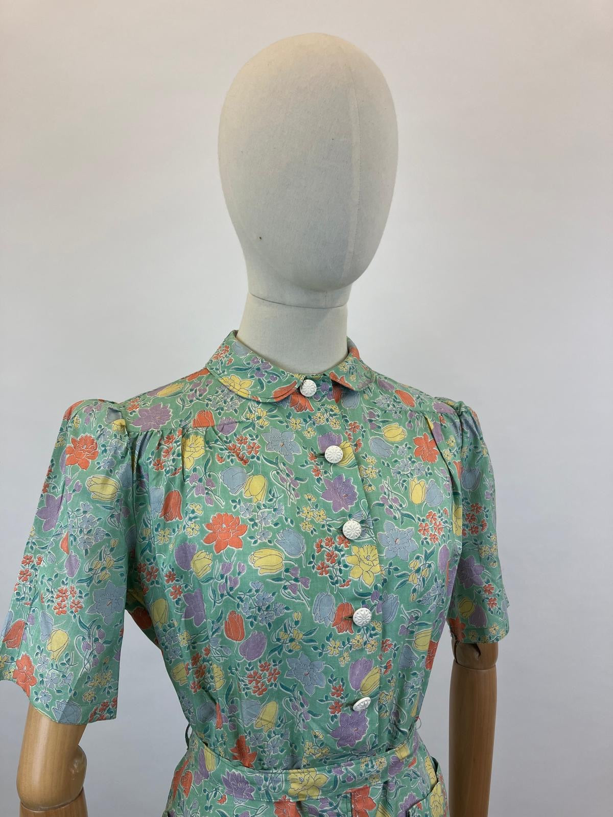 Vintage 1940's silk pretty floral dress in Celedon Green, Orange, Yellow, lilac and mauve. A fabulous Deadstock item, never been worn. Small and perfectly formed collar, 5 x opening button front to waistline ( please note no other opening ). Short sleeves and gorgeous pockets with overlap front. Kick pleats to front and back hem skirt detail. Slight shoulder pads and slight gathers to the shoulders. Self tie belt, can be worn to front or back. No makers label but very high quality.