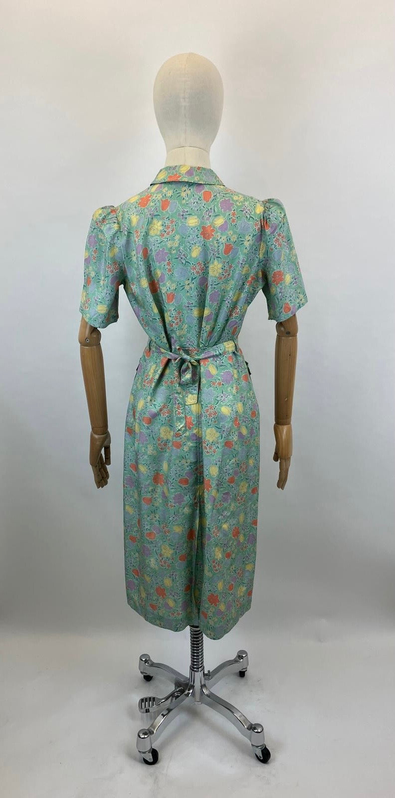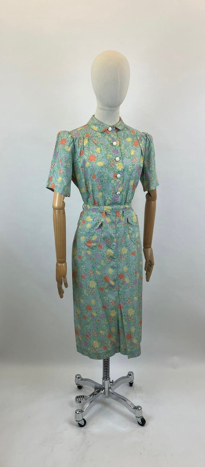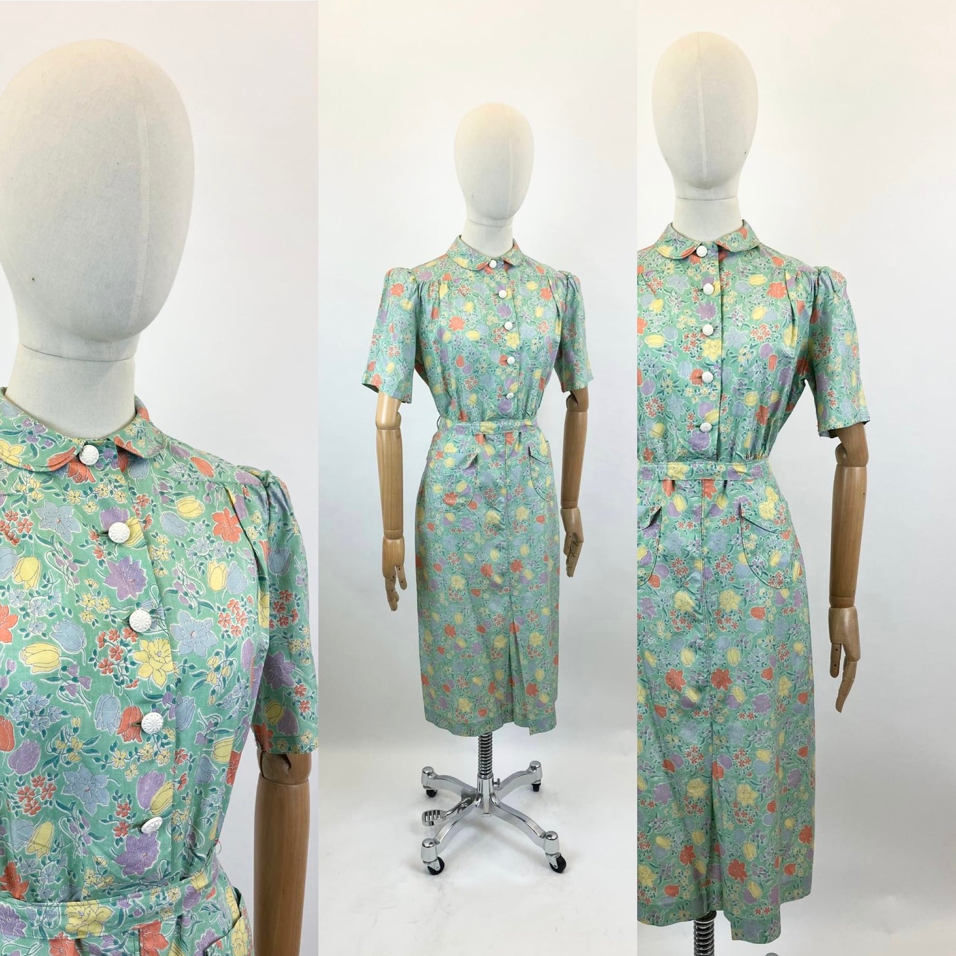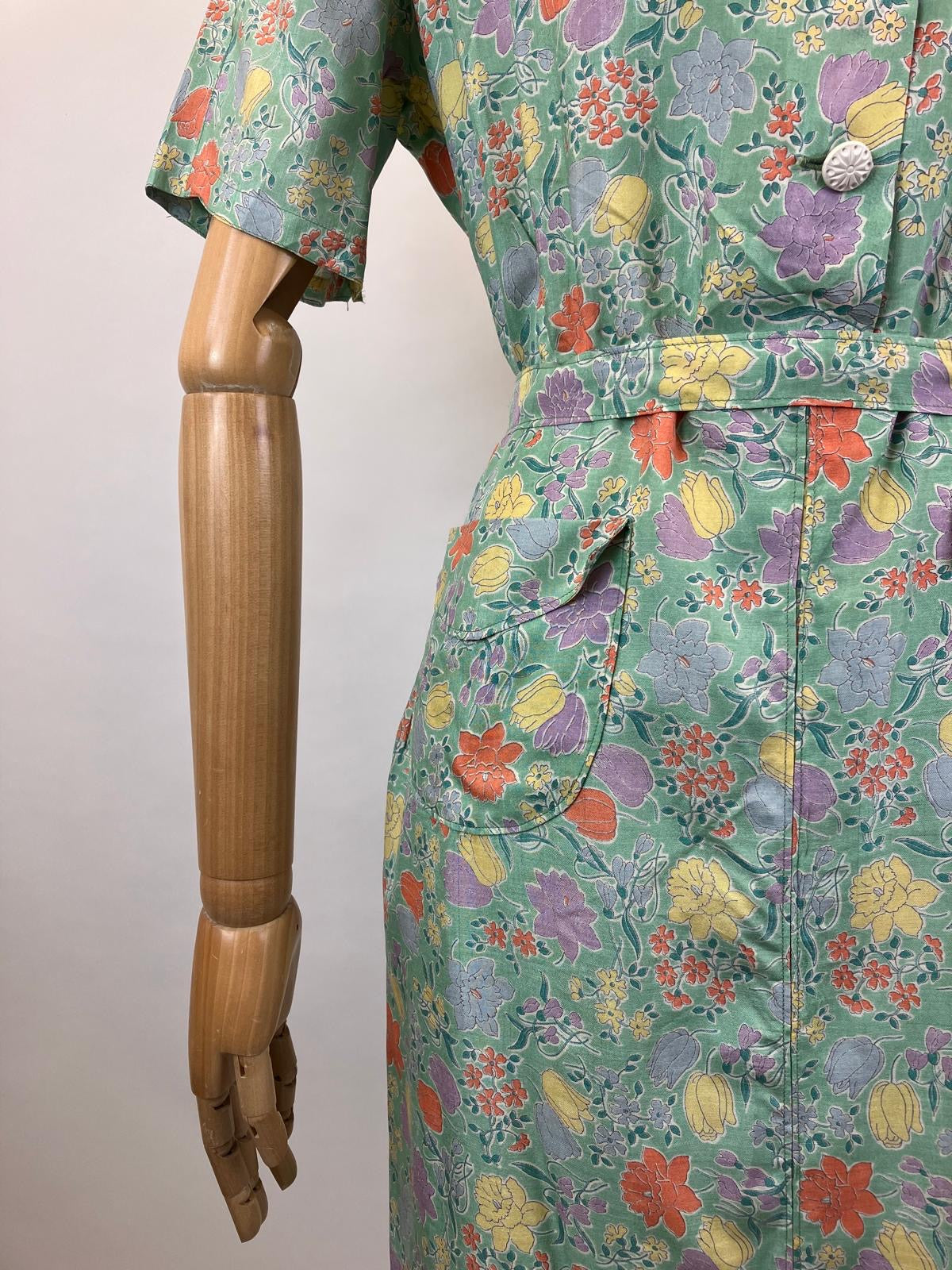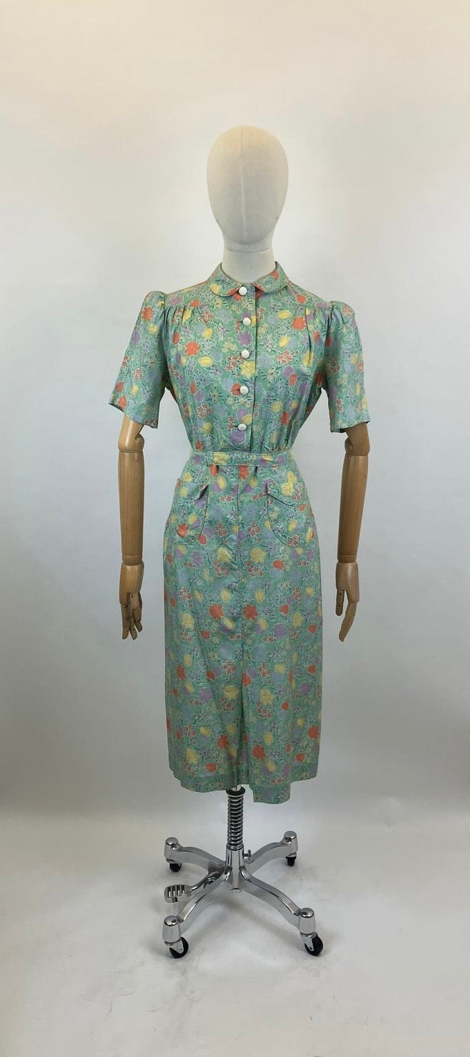 Vintage 1940's silk pretty floral dress in Celedon Green, Orange, Yellow, lilac and mauve. A fabulous Deadstock item, never been worn. Small and perfectly formed collar, 5 x opening button front to waistline ( please note no other opening ). Short sleeves and gorgeous pockets with overlap front. Kick pleats to front and back hem skirt detail. Slight shoulder pads and slight gathers to the shoulders. Self tie belt, can be worn to front or back. No makers label but very high quality.