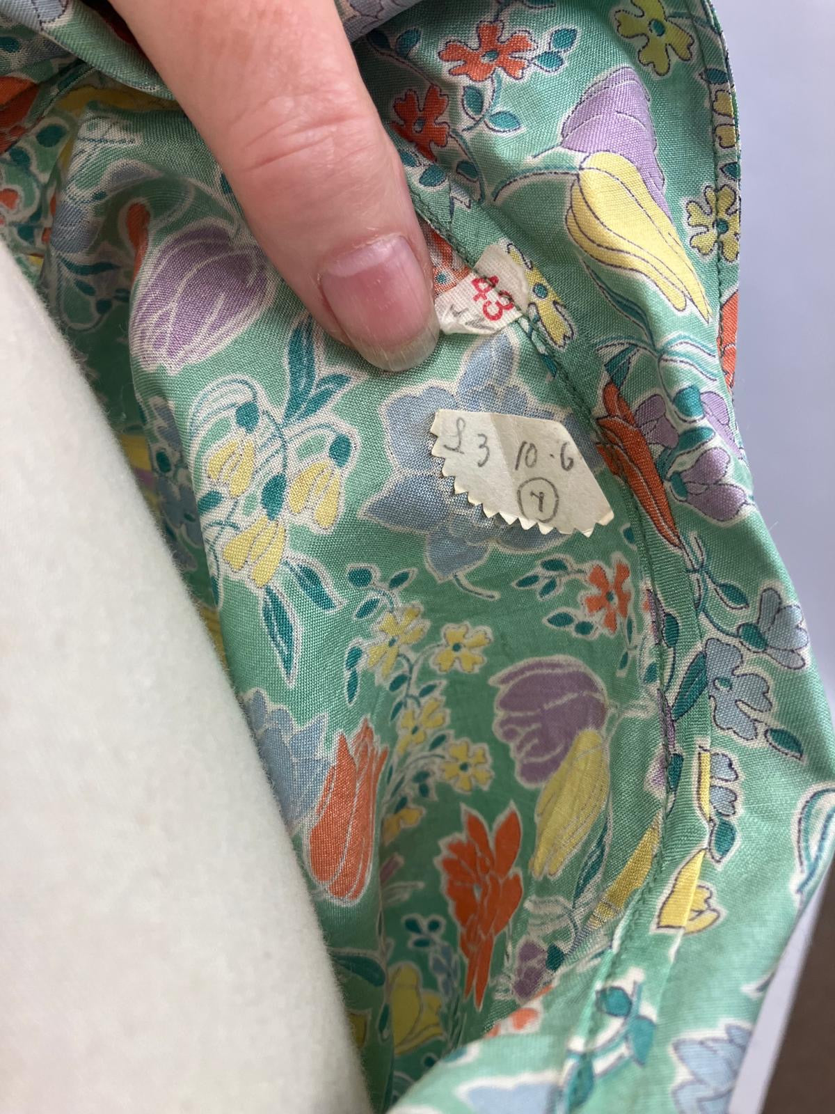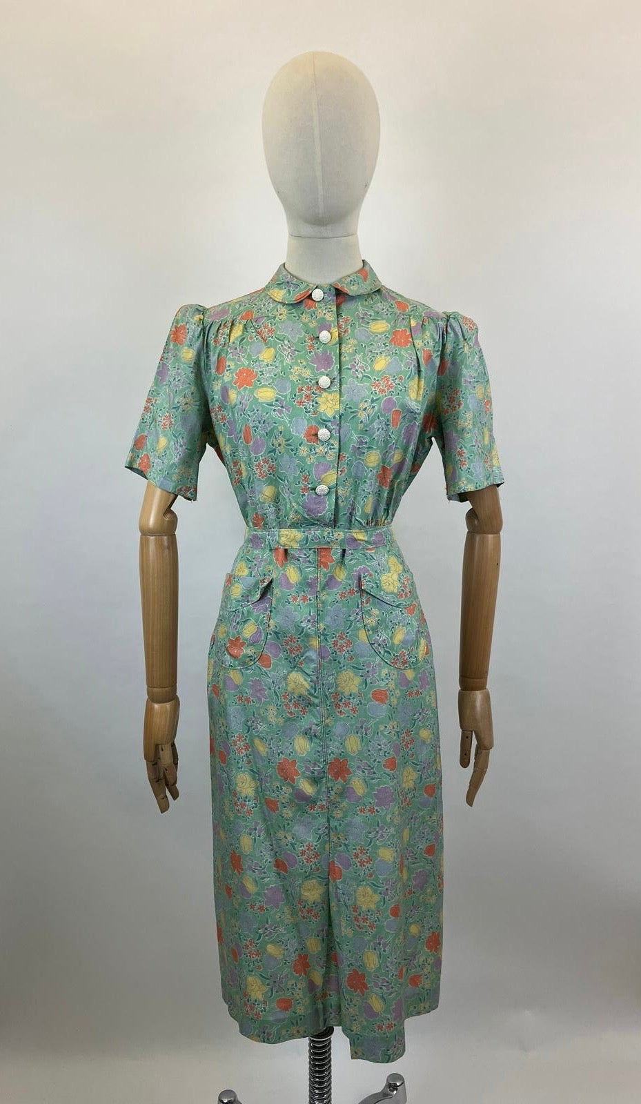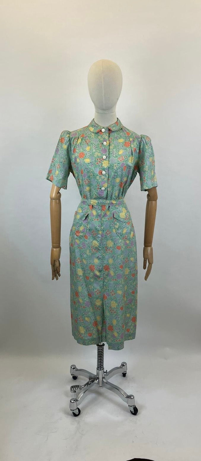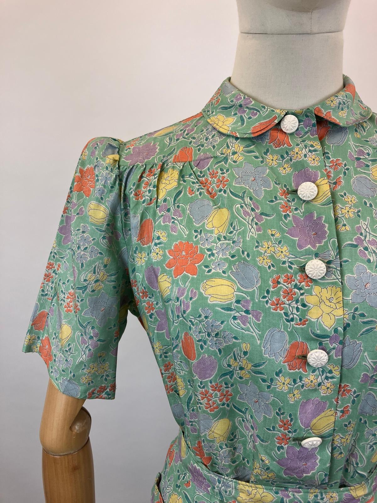 Vintage 1940's silk pretty floral dress in Celedon Green, Orange, Yellow, lilac and mauve. A fabulous Deadstock item, never been worn. Small and perfectly formed collar, 5 x opening button front to waistline ( please note no other opening ). Short sleeves and gorgeous pockets with overlap front. Kick pleats to front and back hem skirt detail. Slight shoulder pads and slight gathers to the shoulders. Self tie belt, can be worn to front or back. No makers label but very high quality.