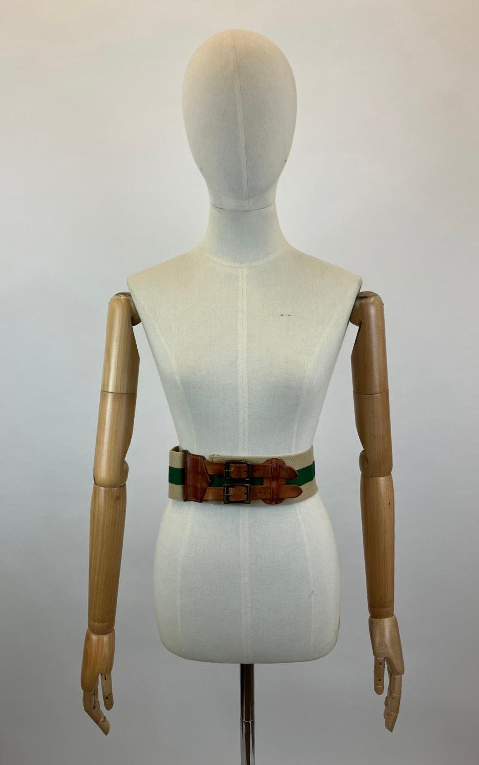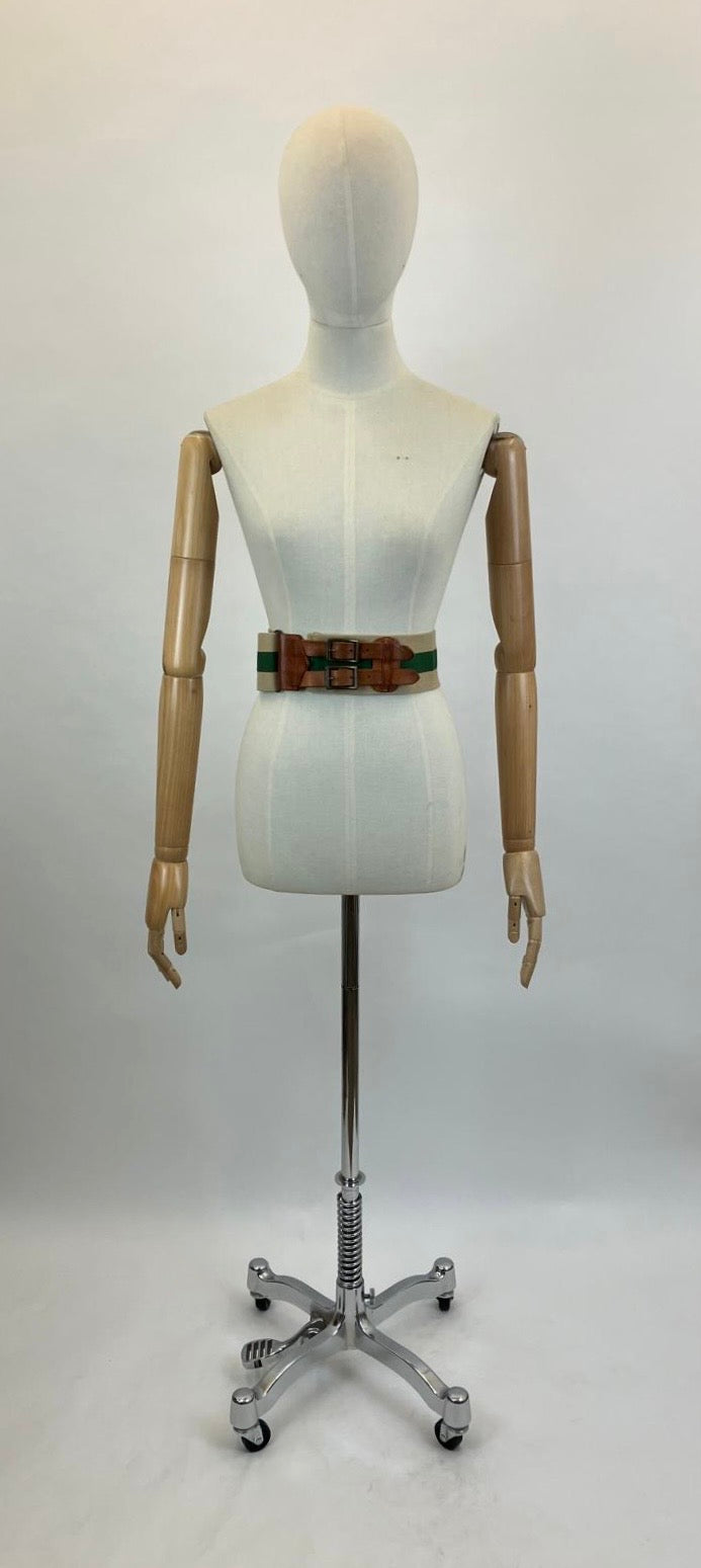 Vintage 30's/40's canvas / leather belt in green and natural colourway. Lovely belt of a natural colour tight weave , being a good depth of 7 cm deep. Running through the middle is a gorgeous forest green, which heightens the natural. Gorgeous leatherwork in the form of a double buckle. Leather is supple and of nice patina, very good condition, sturdy and strong and no reals signs of wear. It of course has a slider so can be adjustable depending upon size or clothing you wear it over, be it dresses or winter jumpers.