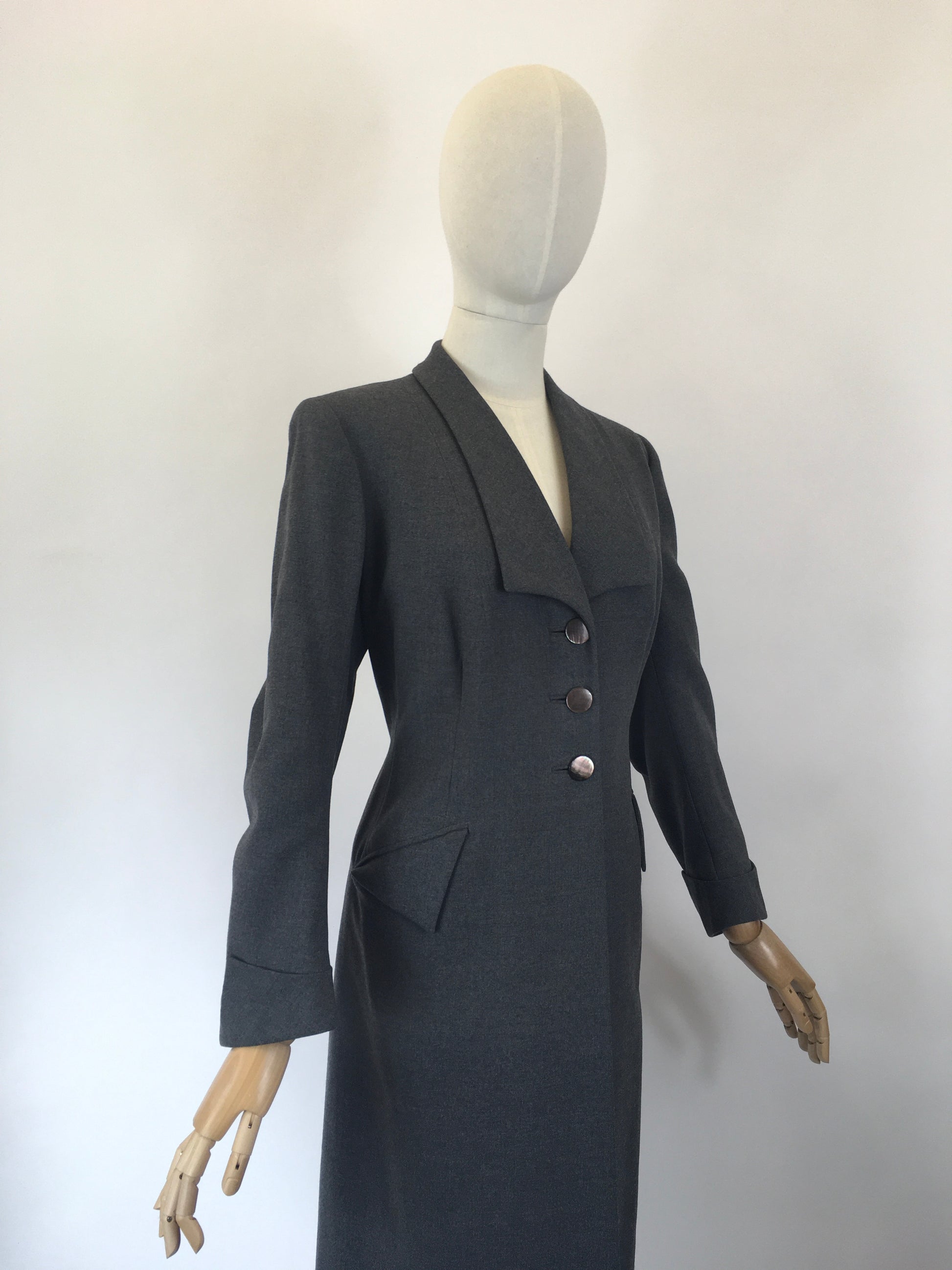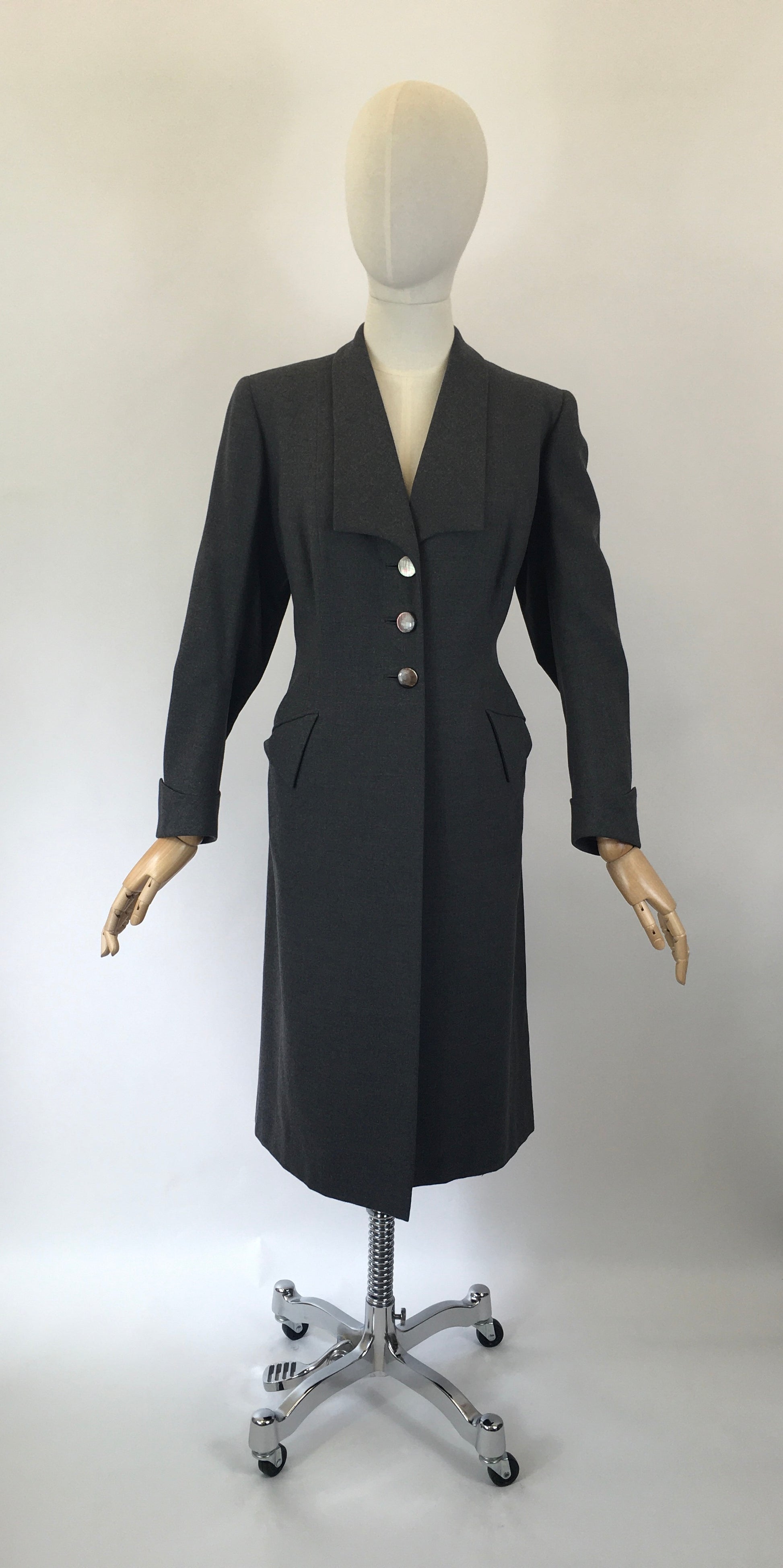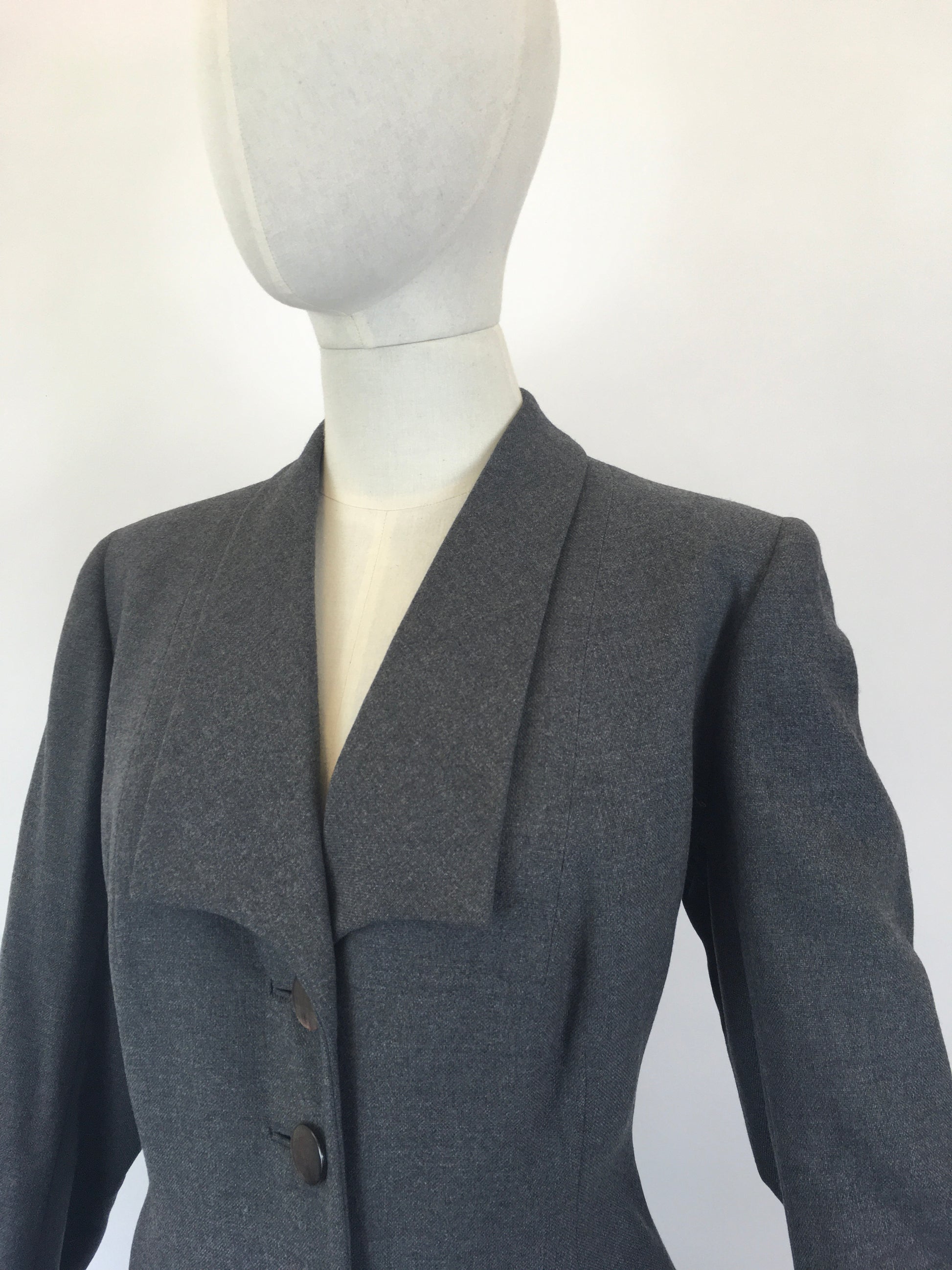 Vintage 1930’s tailored spring weight coat in grey. This piece is in excellent condition and appears barely worn. The piece has such a fabulous late 1930’s shape and features a strong shoulder line, shaped collar, full length sleeves, 3 button front fastening, pockets and a stunning pleated back shaping. To the interior there is a fabulous label which reads ‘ By Appointment to the King, Bernard Wetherill Ltd ‘. This piece is great for layering over the top of suits , dresses or separates and is a great piece for dressing up or dressing down ensembles.