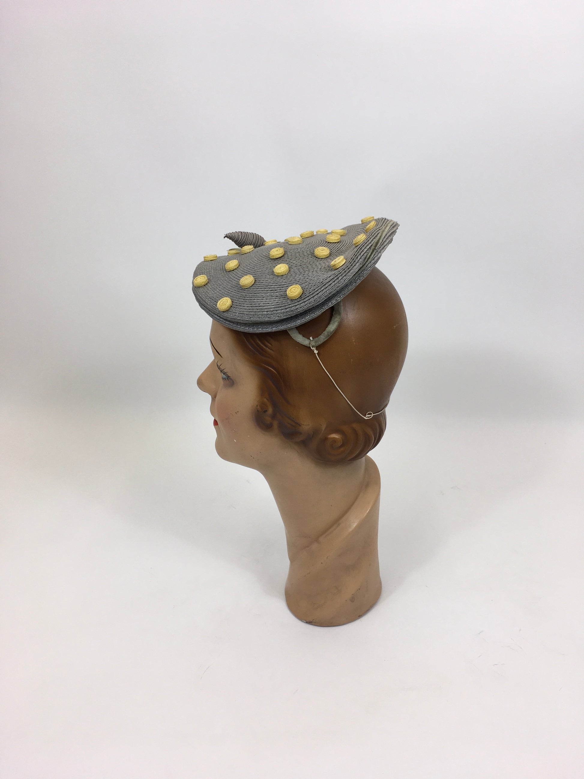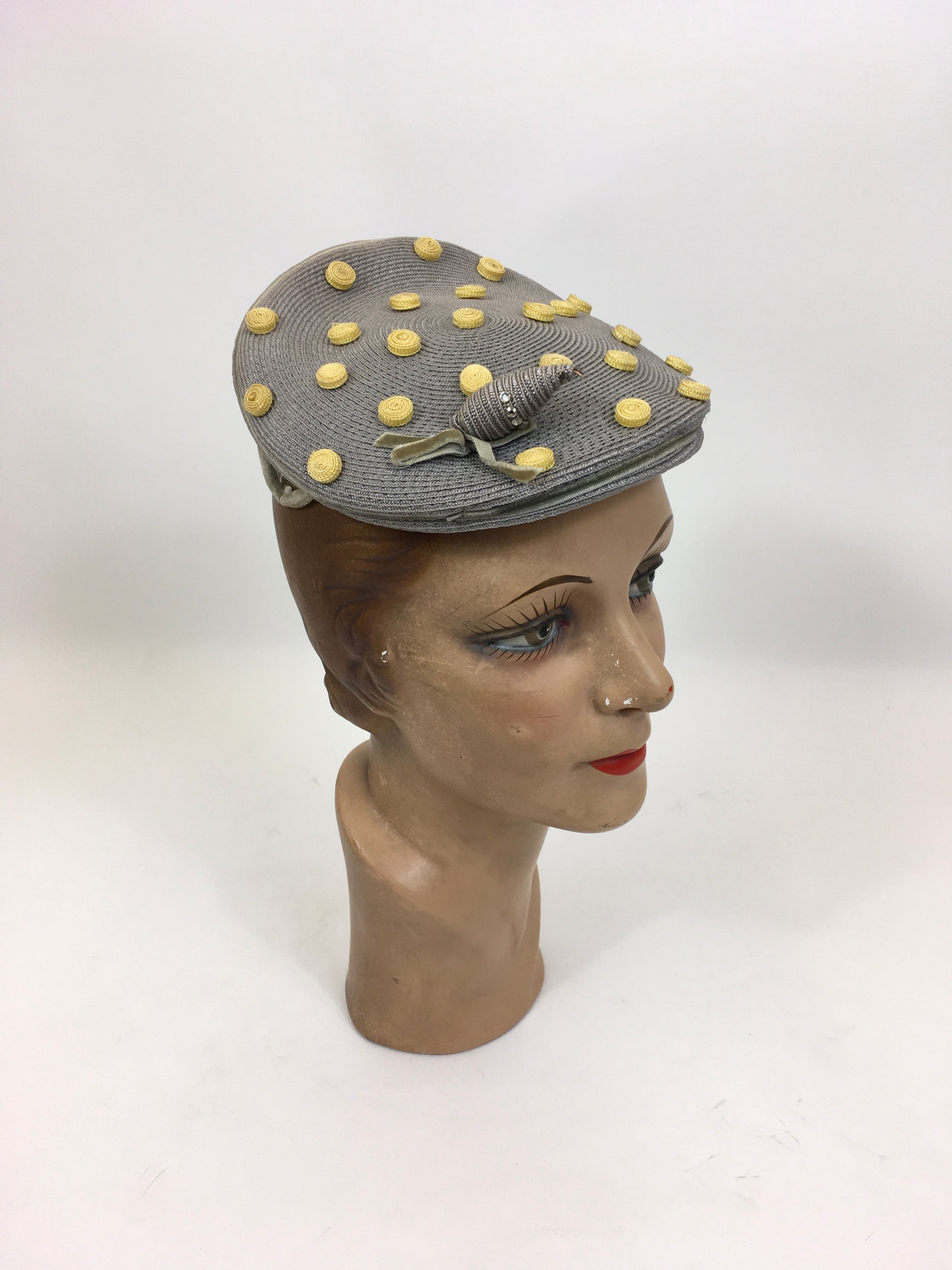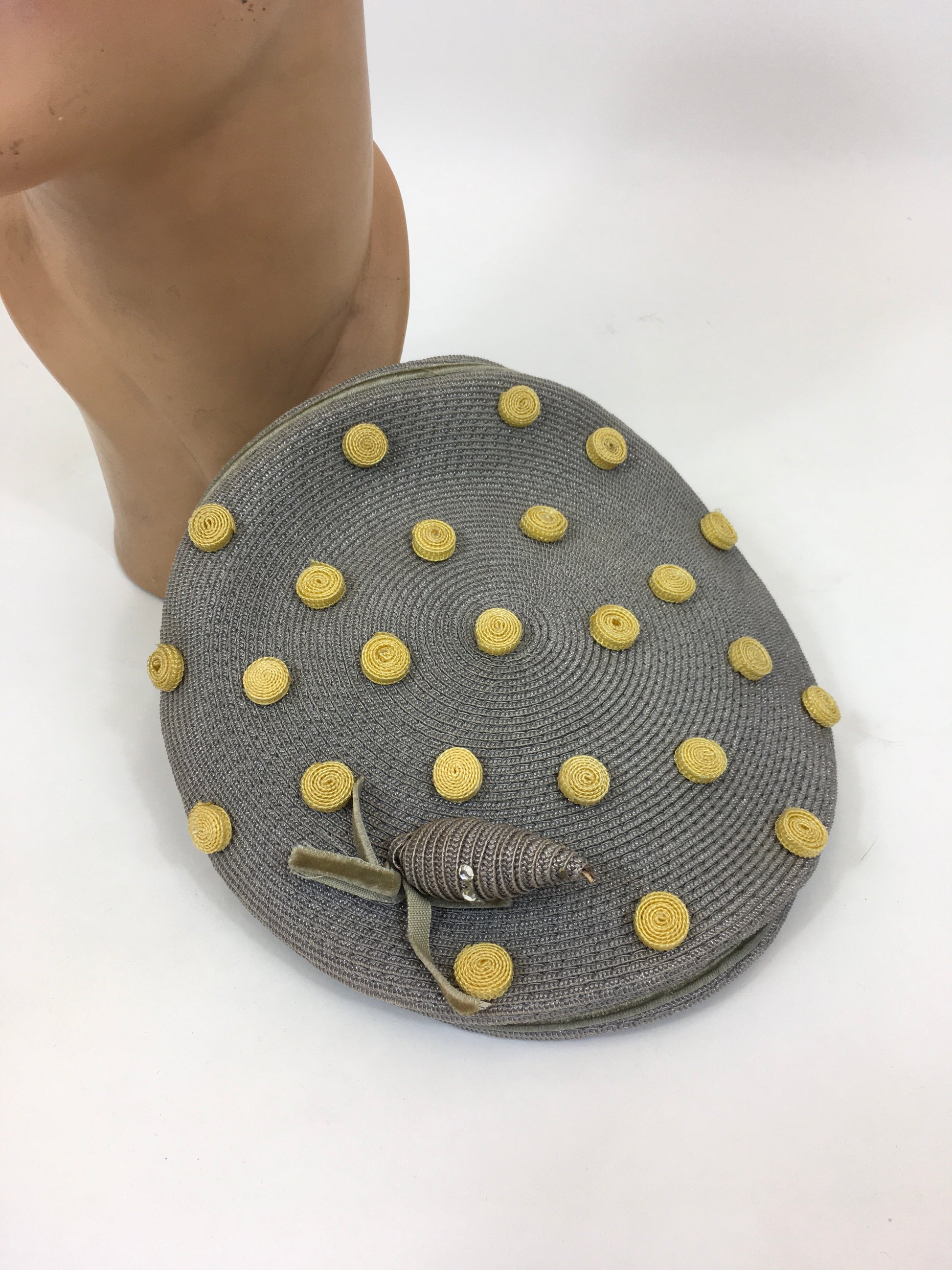 Vintage late 1940's Stunning headpiece in the most beautiful colorway of powdered grey and primrose yellow. The hat is American in origin and features an 'Adele Claire, New York' Fashion label. This hat has the most beautiful shape and can be sat and shaped on the head in numerous ways for varying hairstyles. It features primrose yellow swirled polka dots and a matching grey acorn adornment with decorative paste stones. It has little v sections covered in velvet to the underside to help sit on the head. A must have piece for any 1940's or 1950's loving lady in a rare colorway.