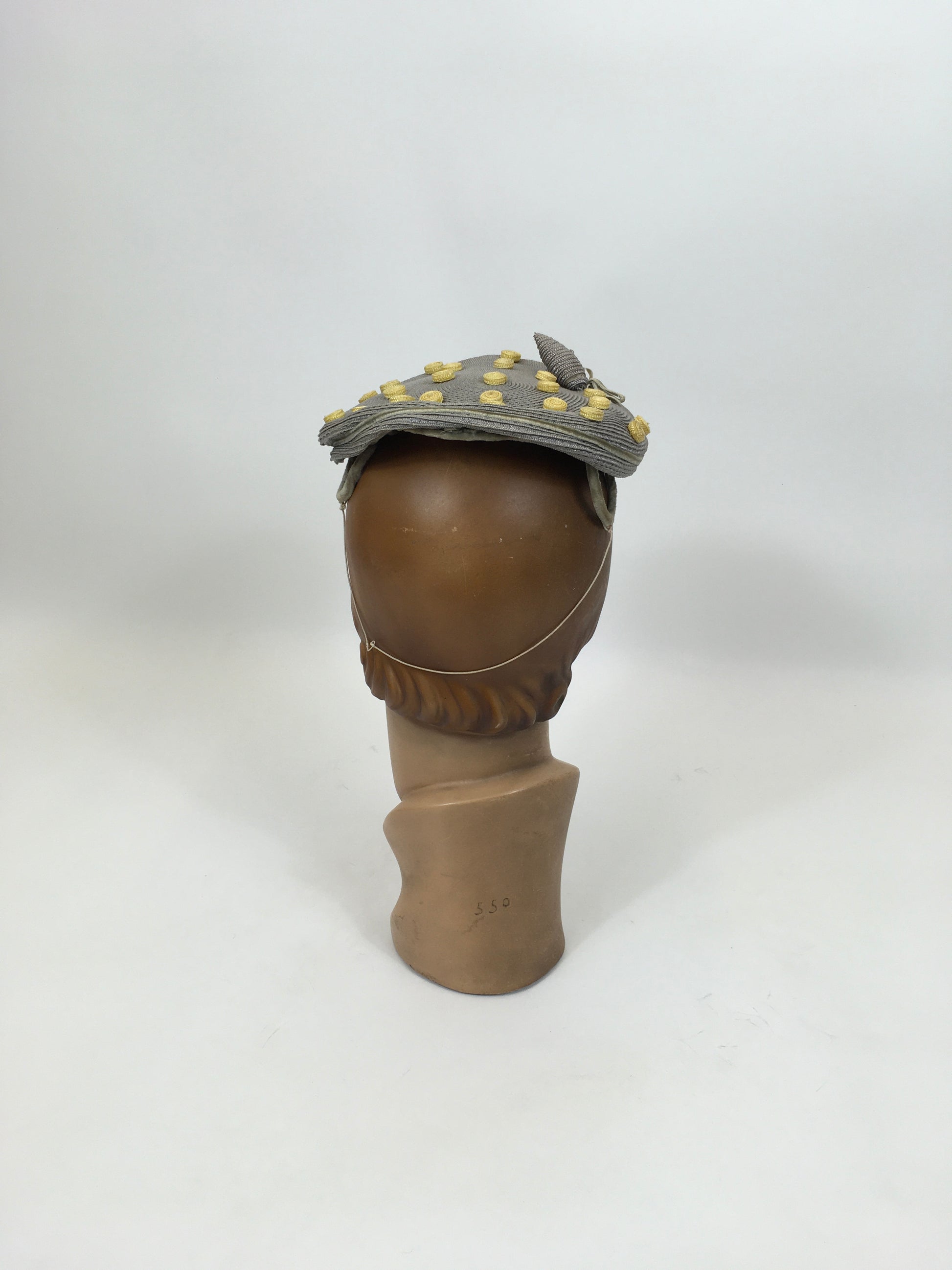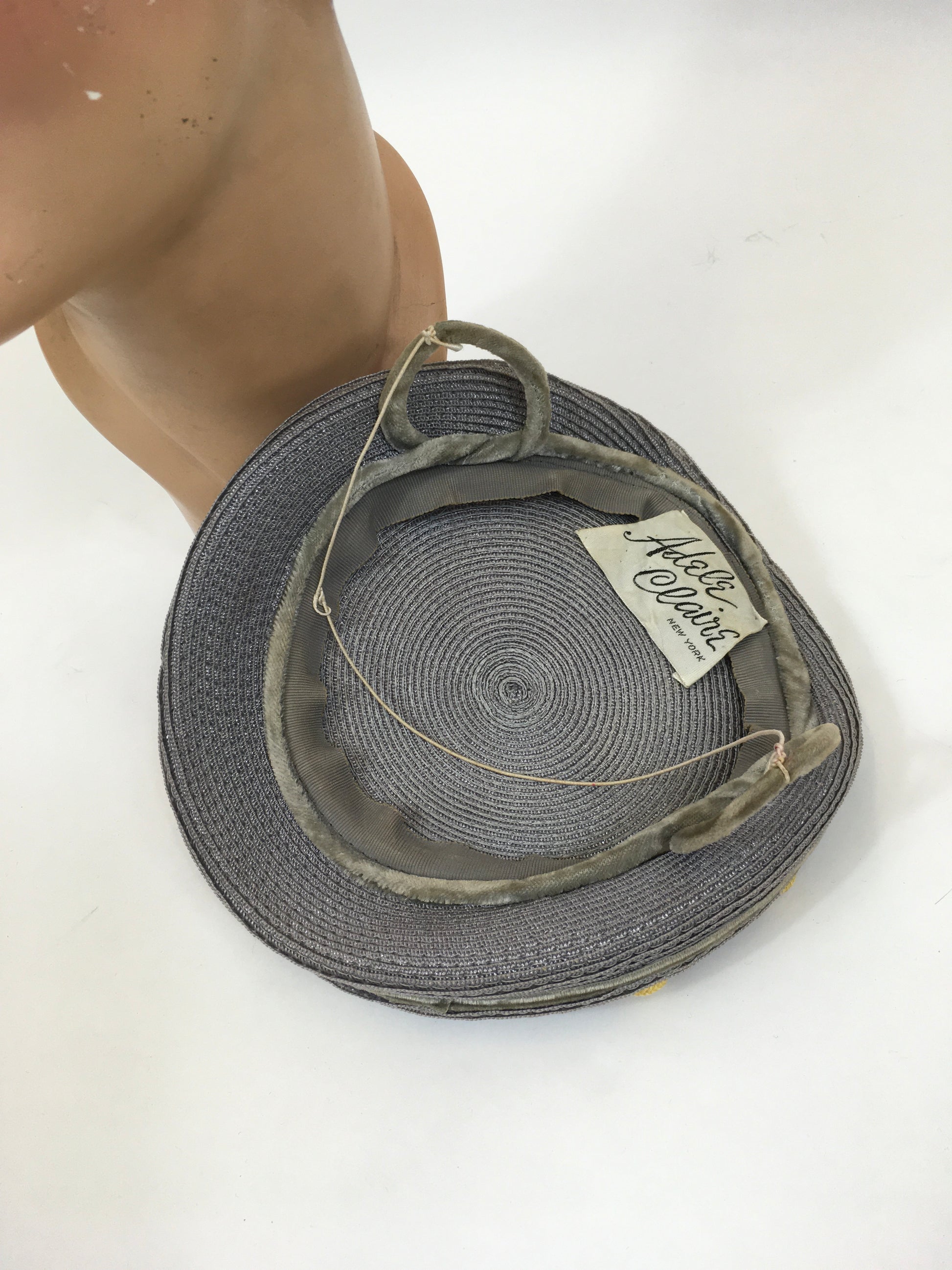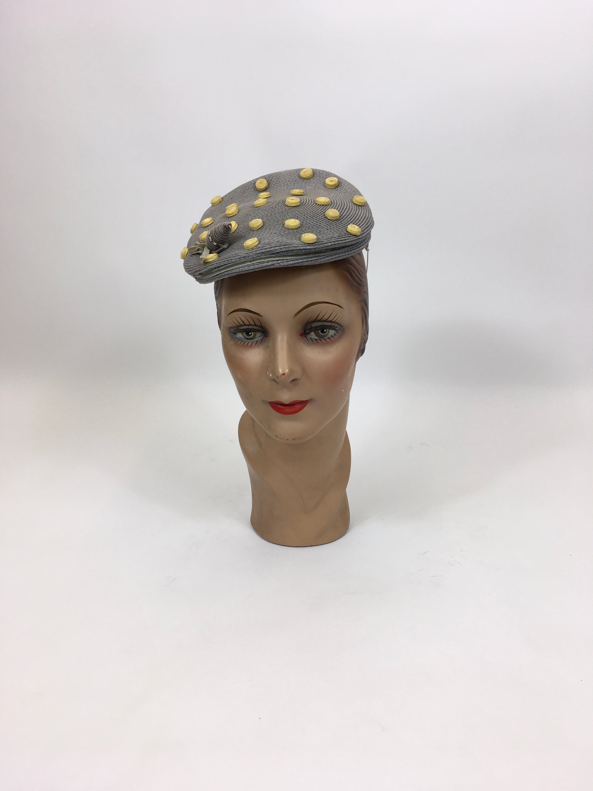 Vintage late 1940's Stunning headpiece in the most beautiful colorway of powdered grey and primrose yellow. The hat is American in origin and features an 'Adele Claire, New York' Fashion label. This hat has the most beautiful shape and can be sat and shaped on the head in numerous ways for varying hairstyles. It features primrose yellow swirled polka dots and a matching grey acorn adornment with decorative paste stones. It has little v sections covered in velvet to the underside to help sit on the head. A must have piece for any 1940's or 1950's loving lady in a rare colorway.