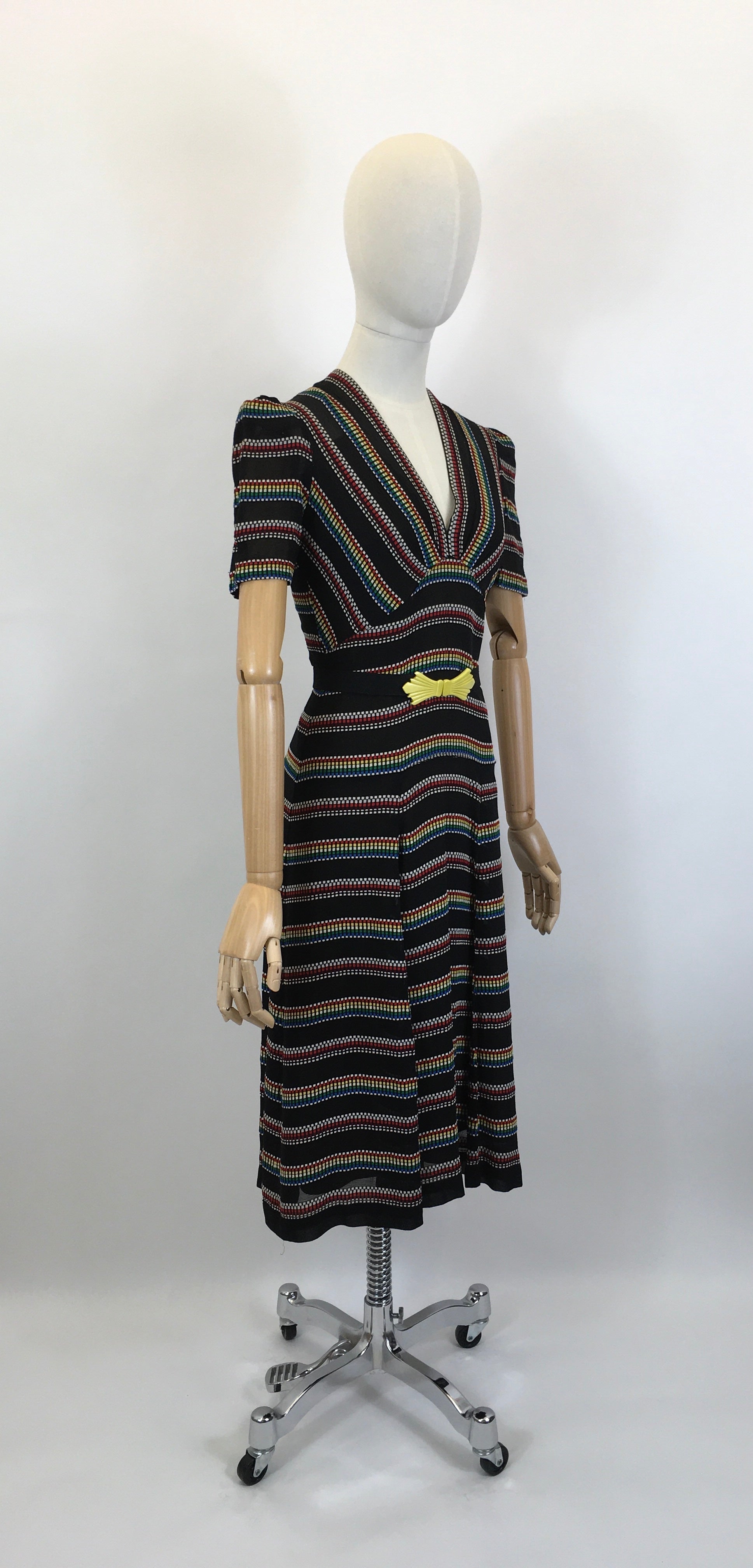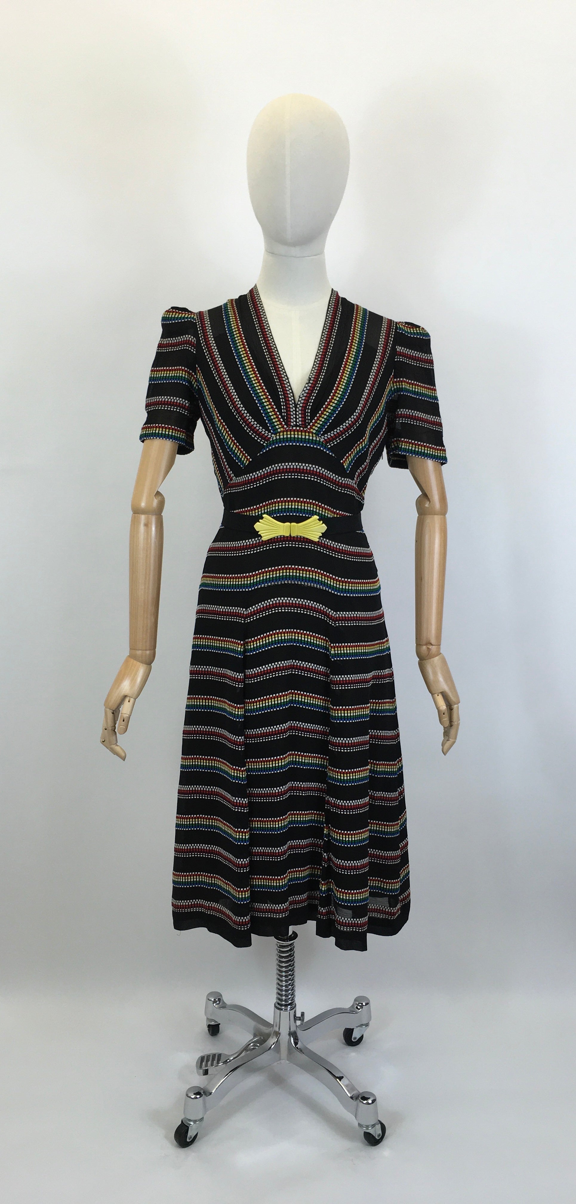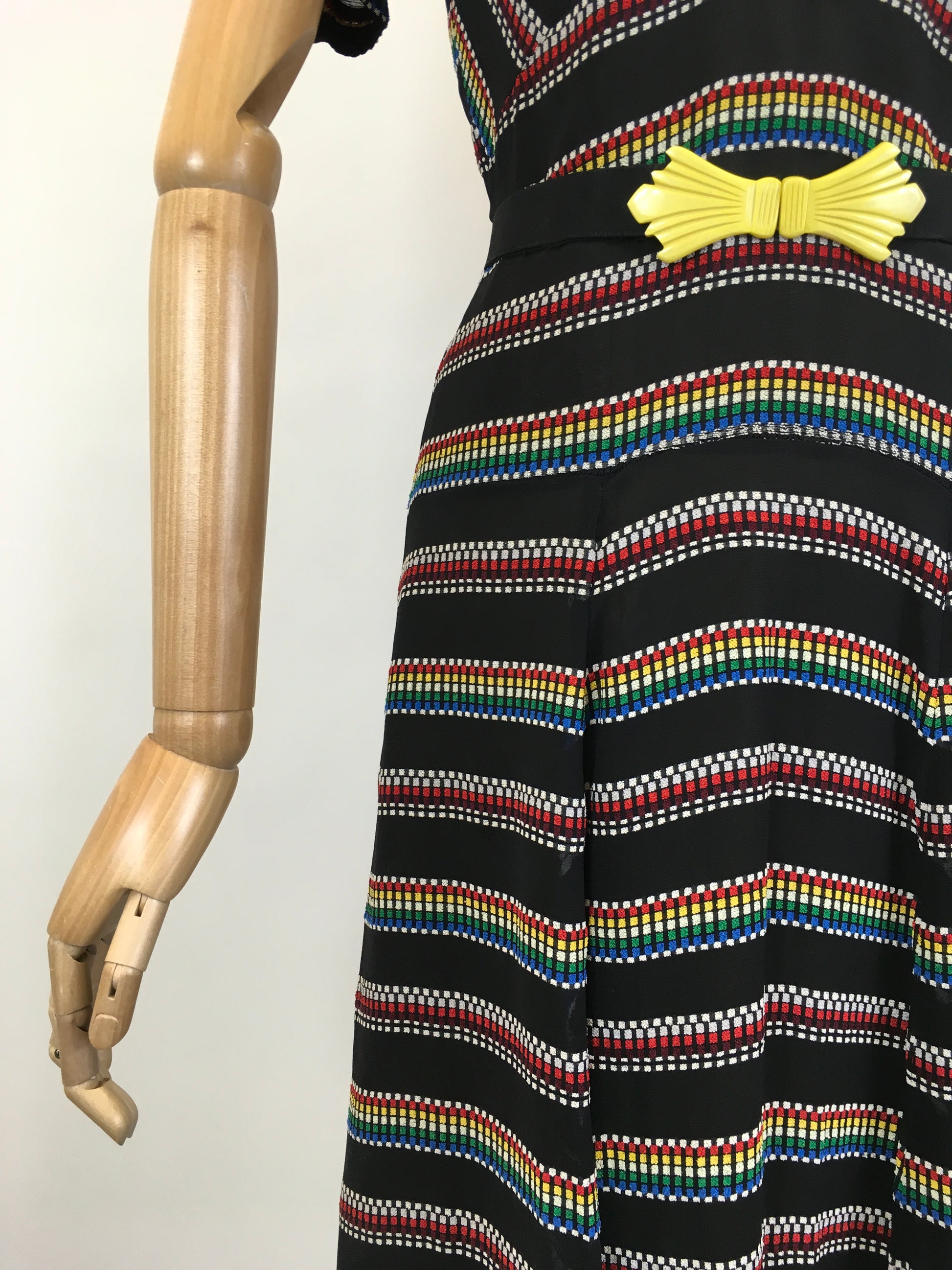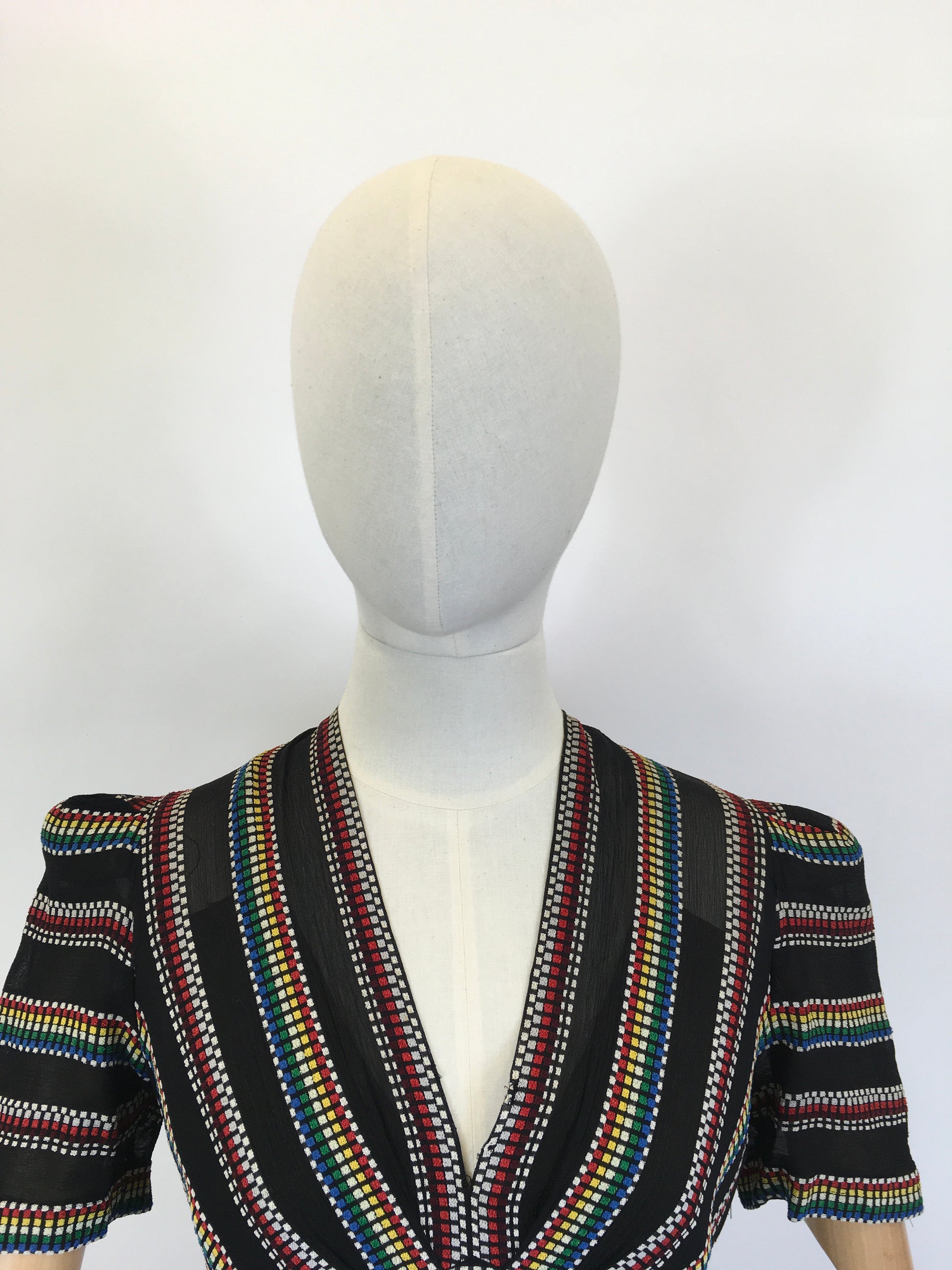 Vintage 1930’s stunning dress in a sheer crepe with a multicoloured embroidered weave. This dress has a stunning late 1930’s silhouette and features a full puff short sleeve, v neckline, dropped pleated to the skirt, under slip attached lining and fastens with a metal side zip. The piece is a real statement and has pops of red, white, green and blue weaved onto the black base. It’s a great versatile piece to wear as both day and evening wear with many options for colourful accessories.