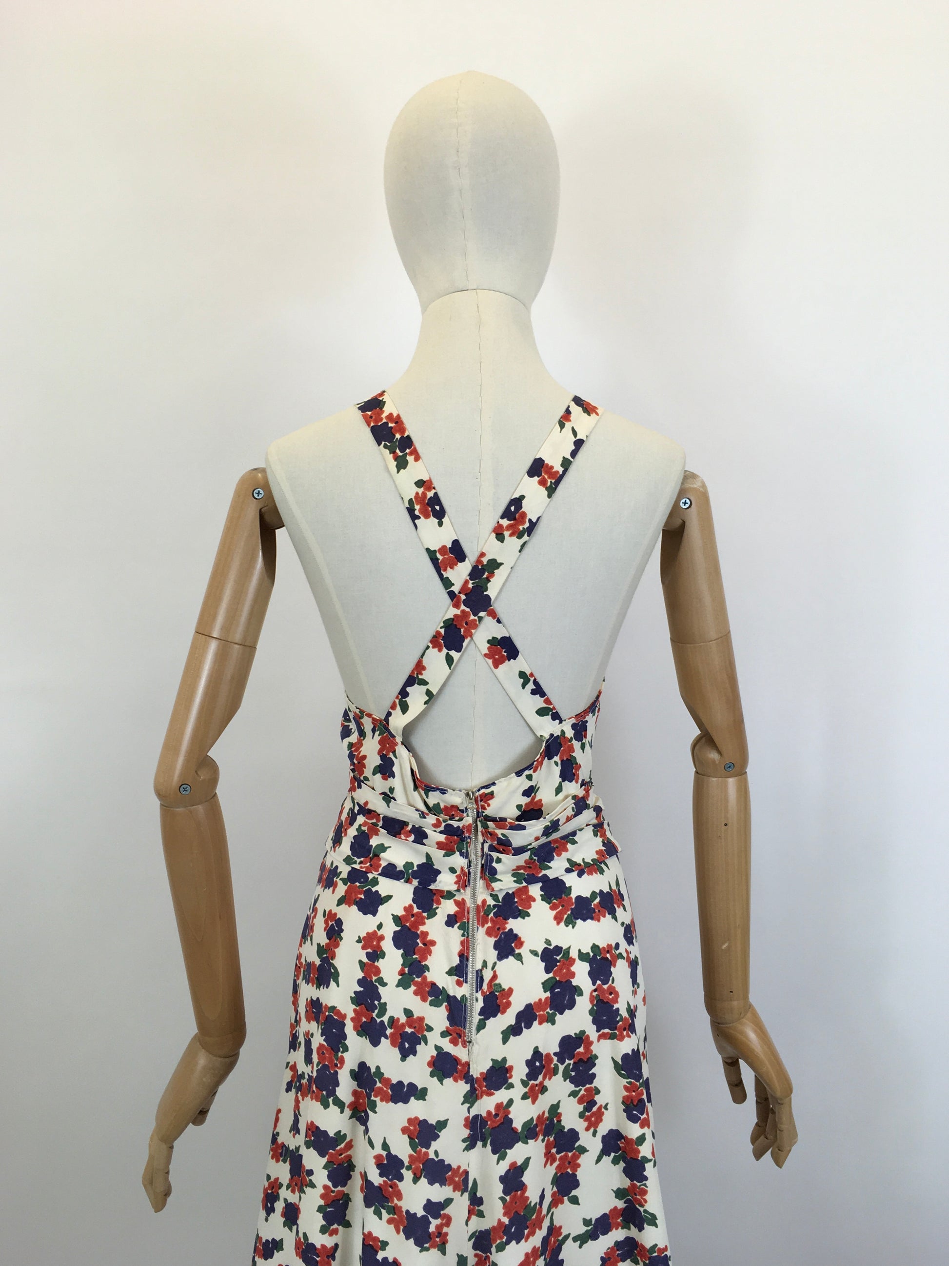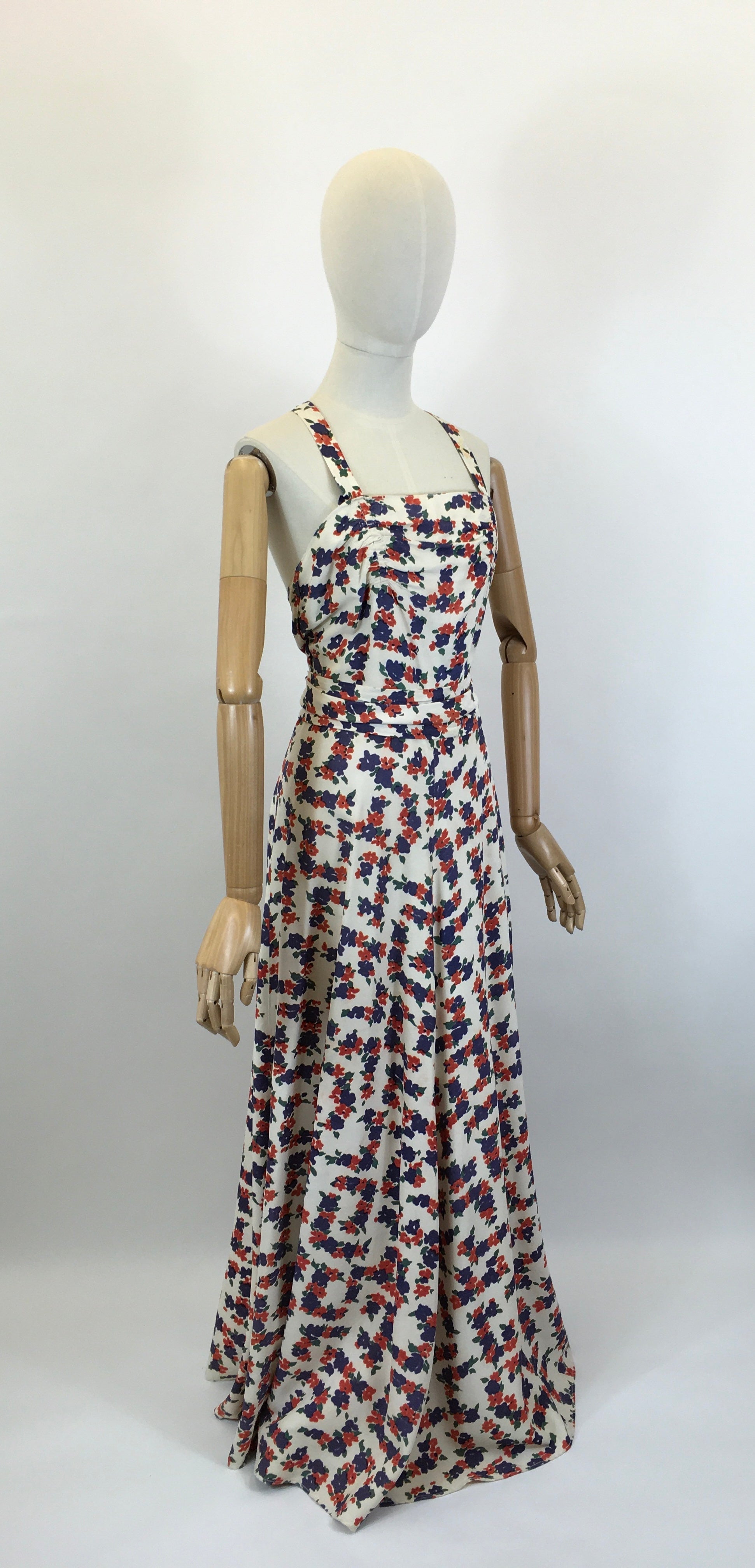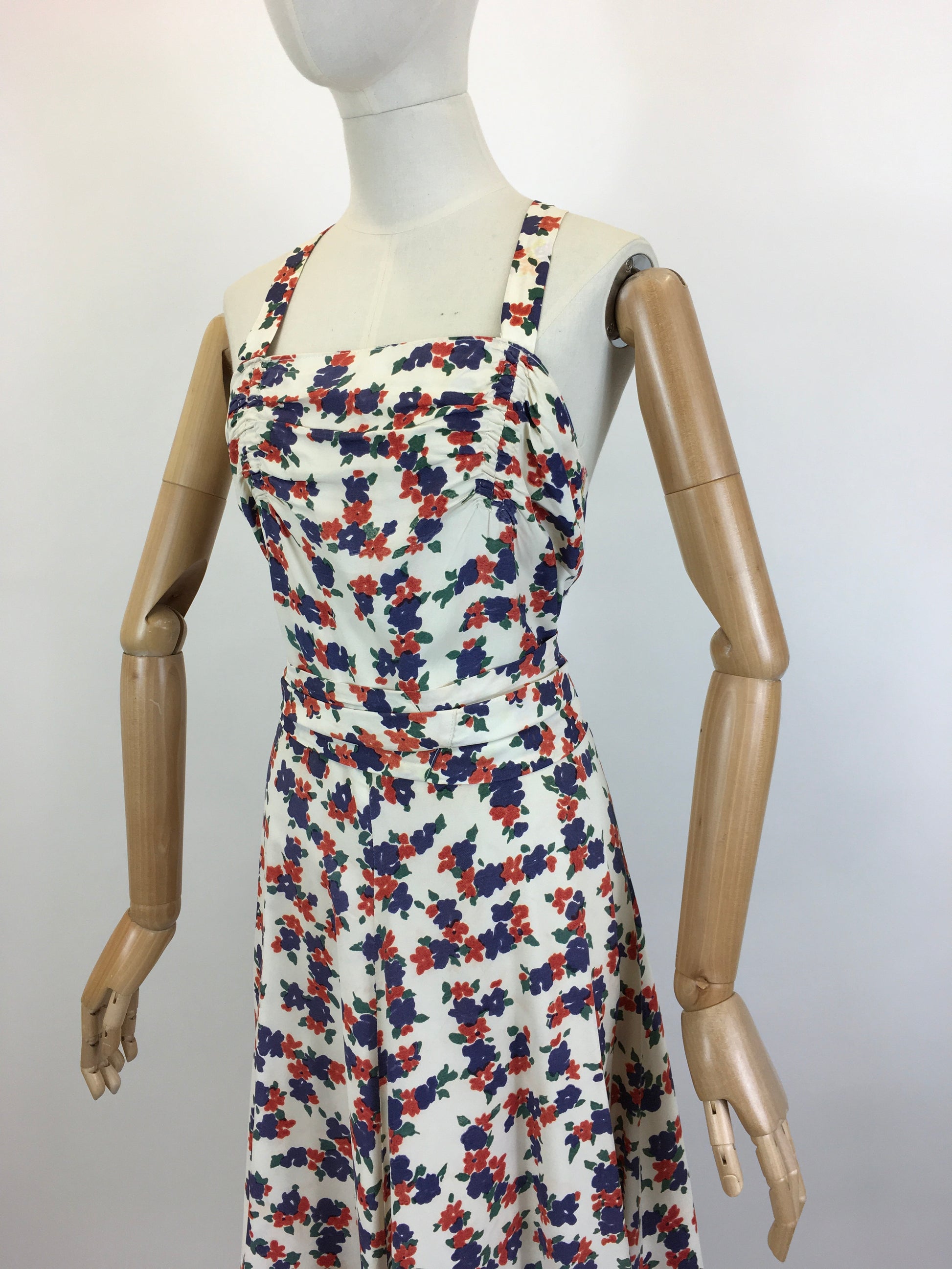 Vintage late 1930’s stunning evening gown in a delightful navy and coral red floral on a cream rayon. This is a lovely piece which we believe to be homemade. It has a beautiful silhouette and features a thin strap which crosses over at the back , pleated bodice with pleated over belt banding, full sweeping skirt and fastens with a back metal zip. This piece is beautiful for an evening occasion or summer daytime soirée.