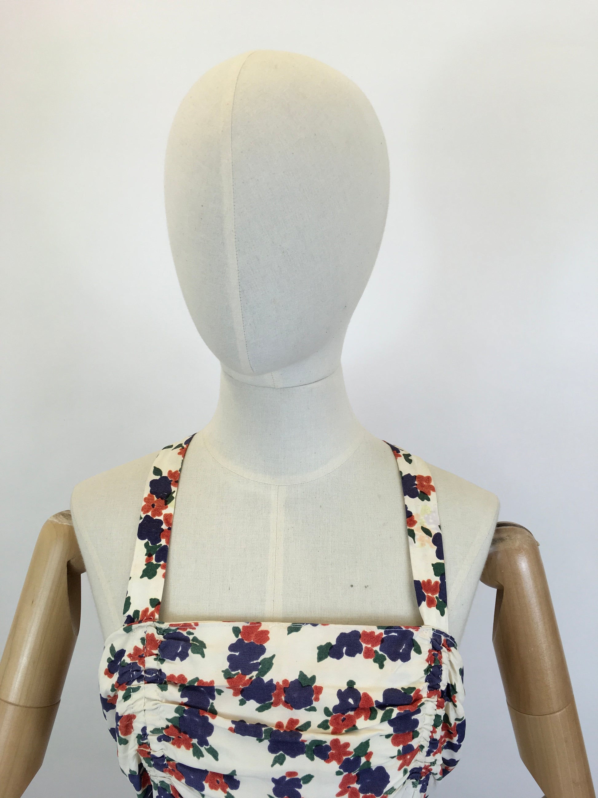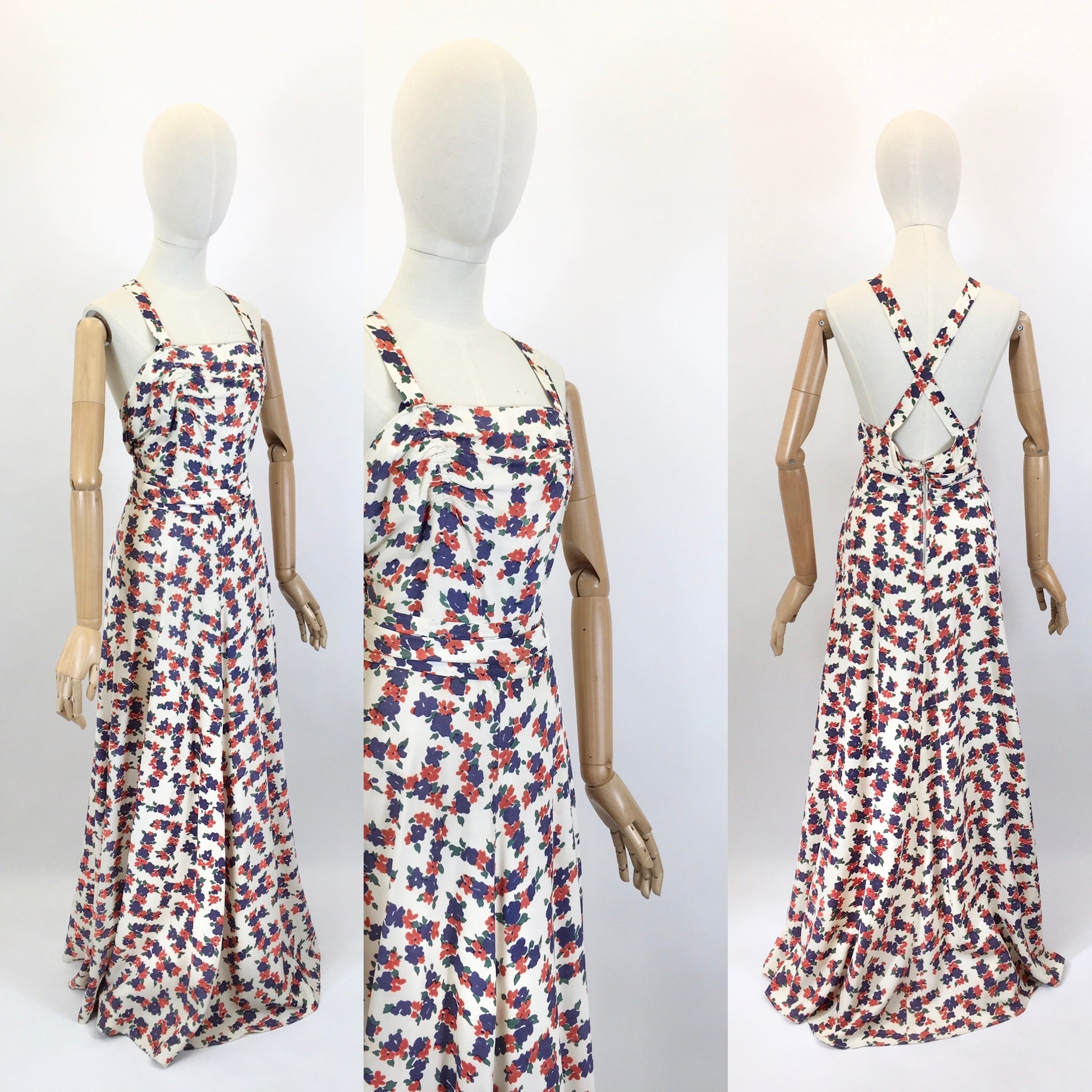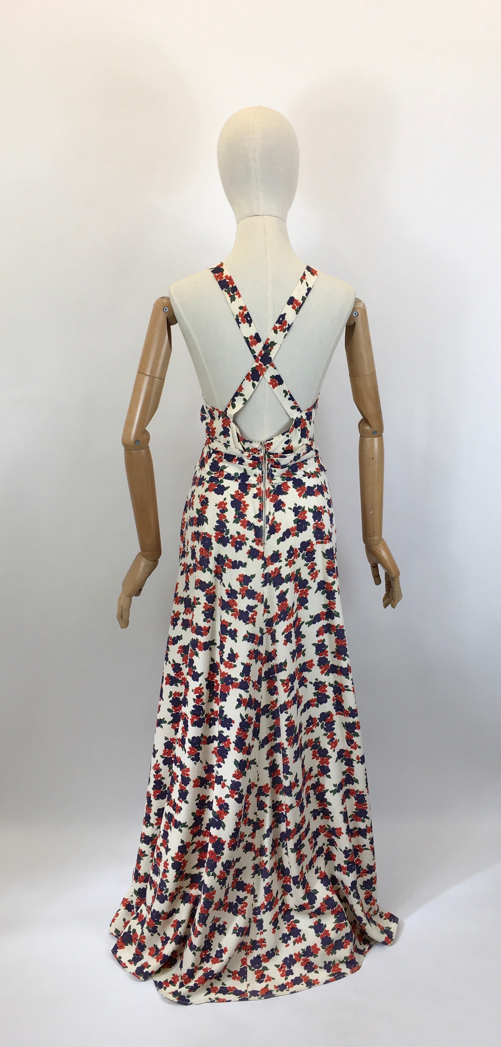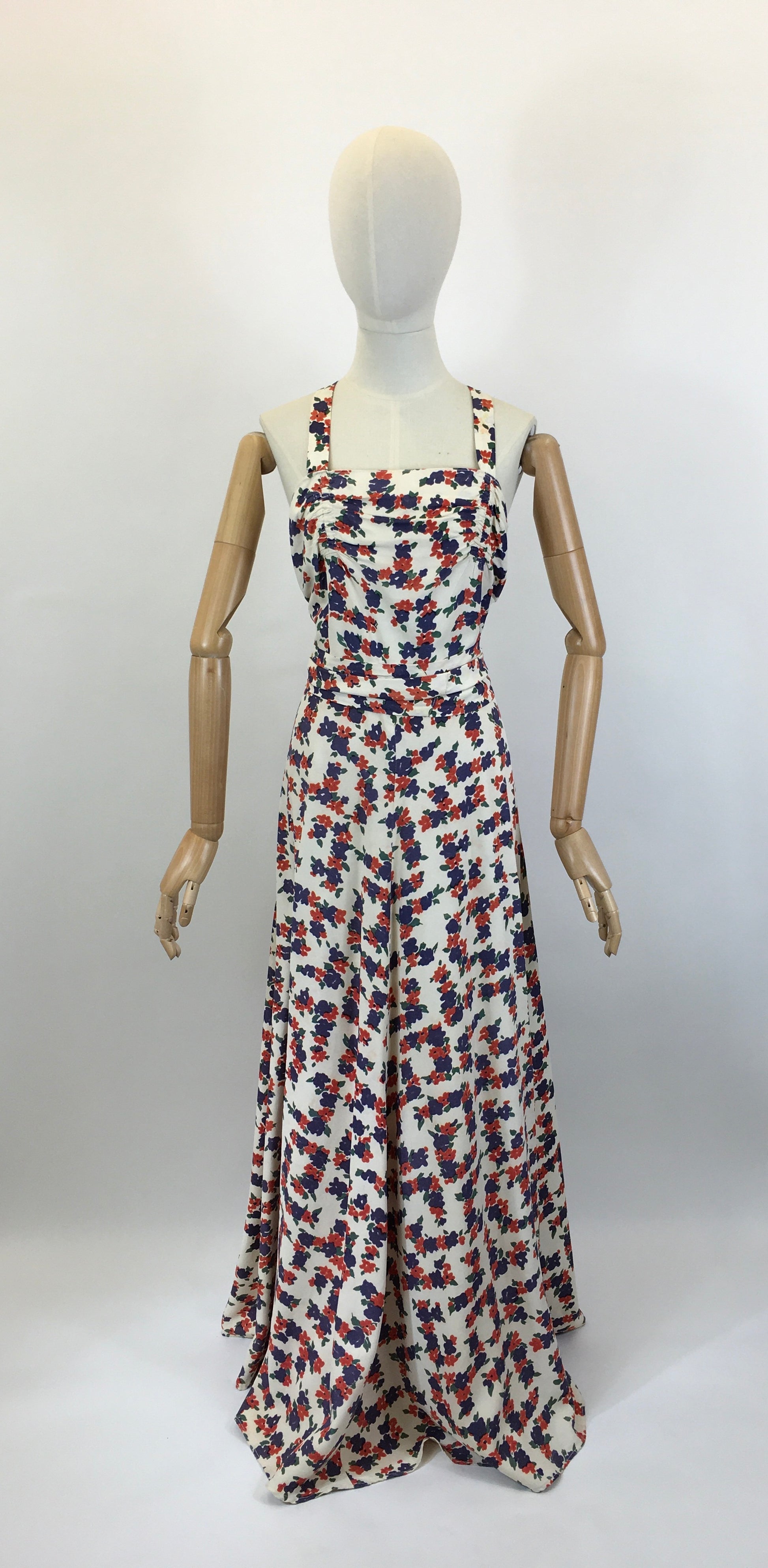 Vintage late 1930’s stunning evening gown in a delightful navy and coral red floral on a cream rayon. This is a lovely piece which we believe to be homemade. It has a beautiful silhouette and features a thin strap which crosses over at the back , pleated bodice with pleated over belt banding, full sweeping skirt and fastens with a back metal zip. This piece is beautiful for an evening occasion or summer daytime soirée.