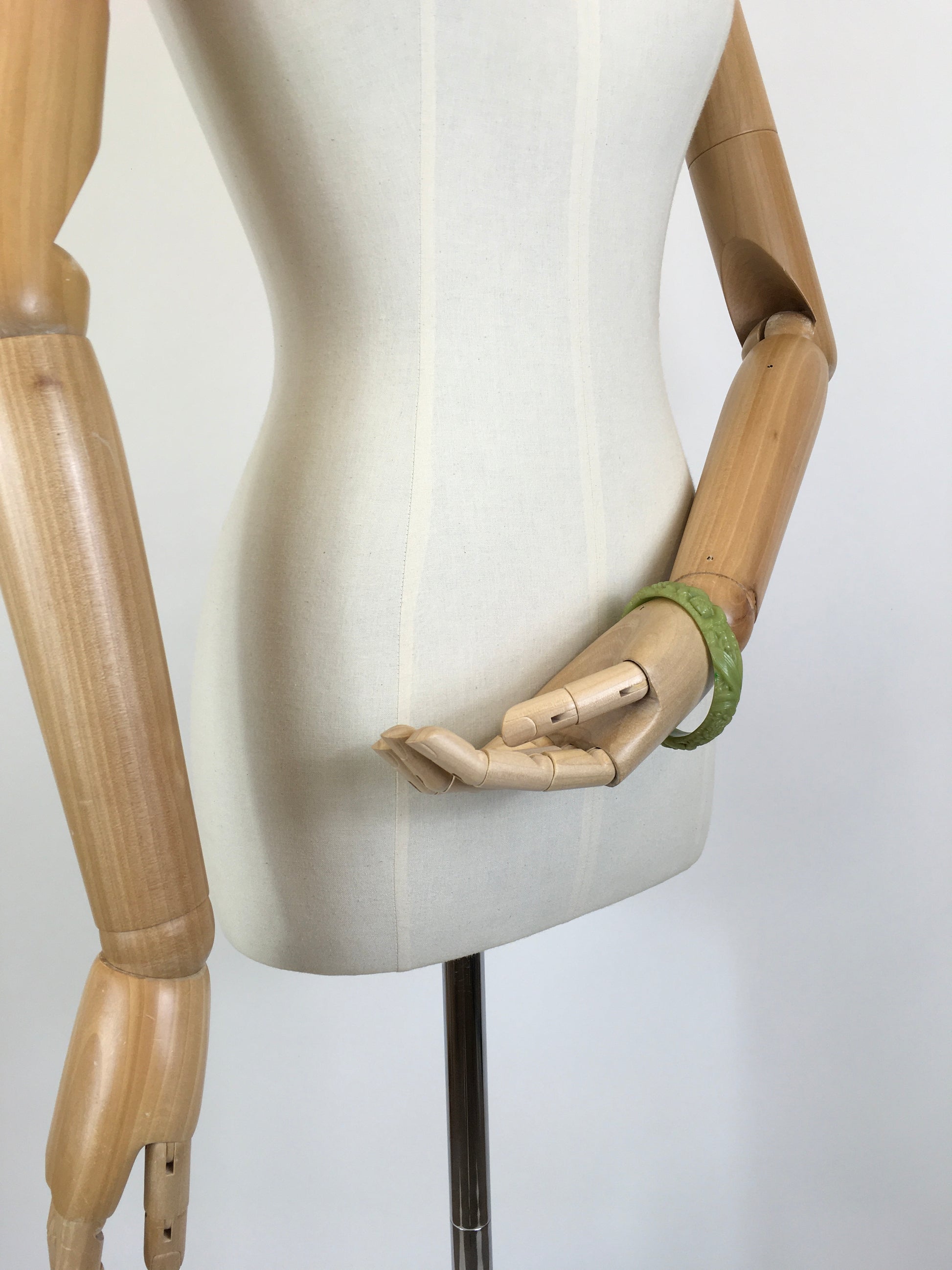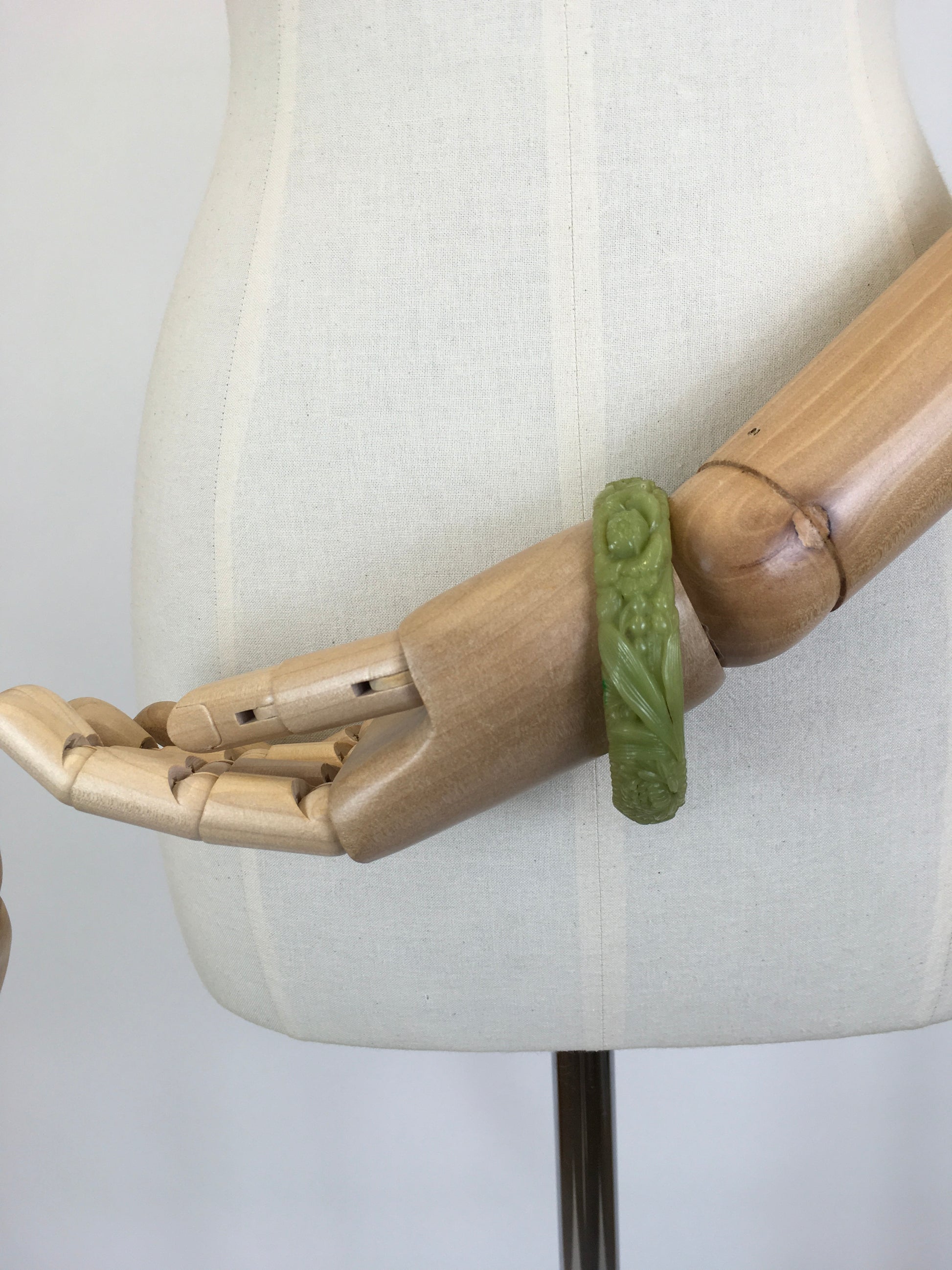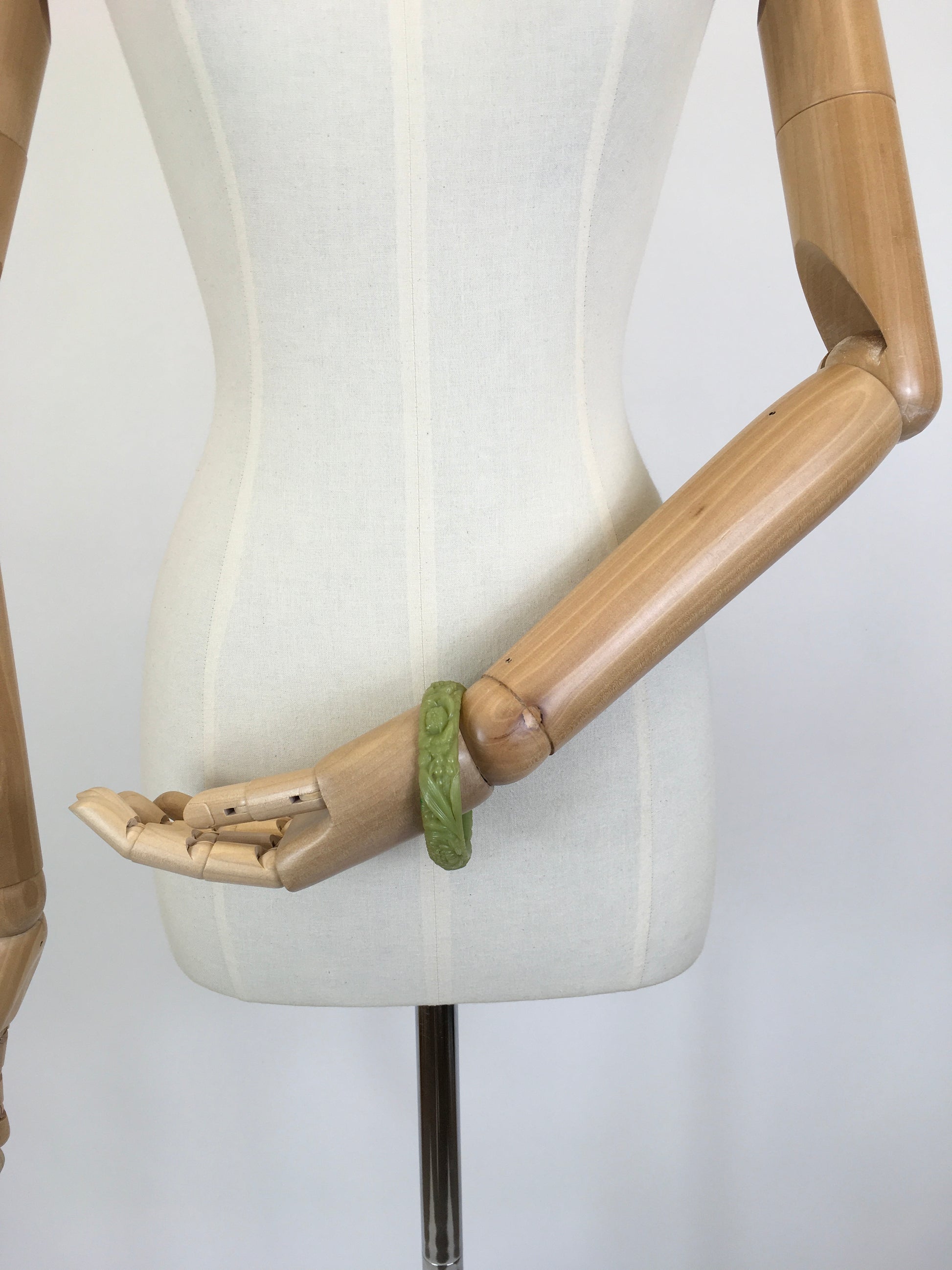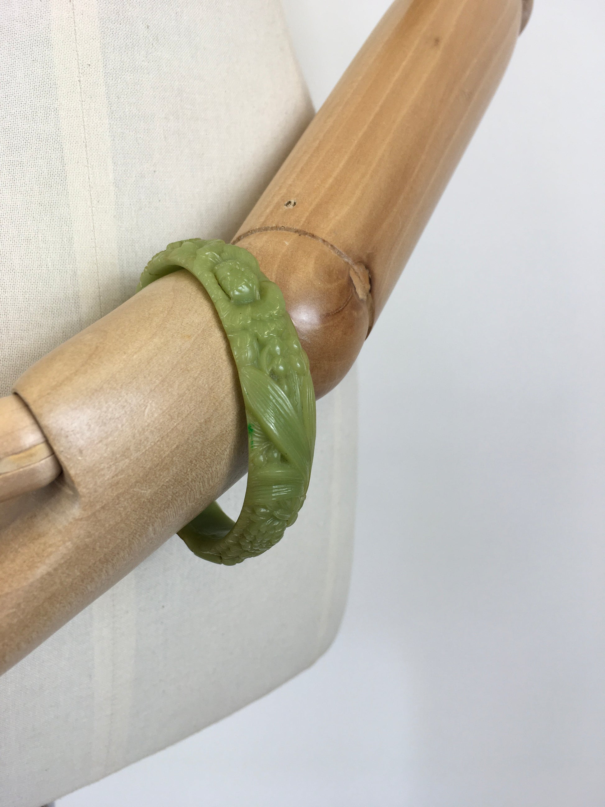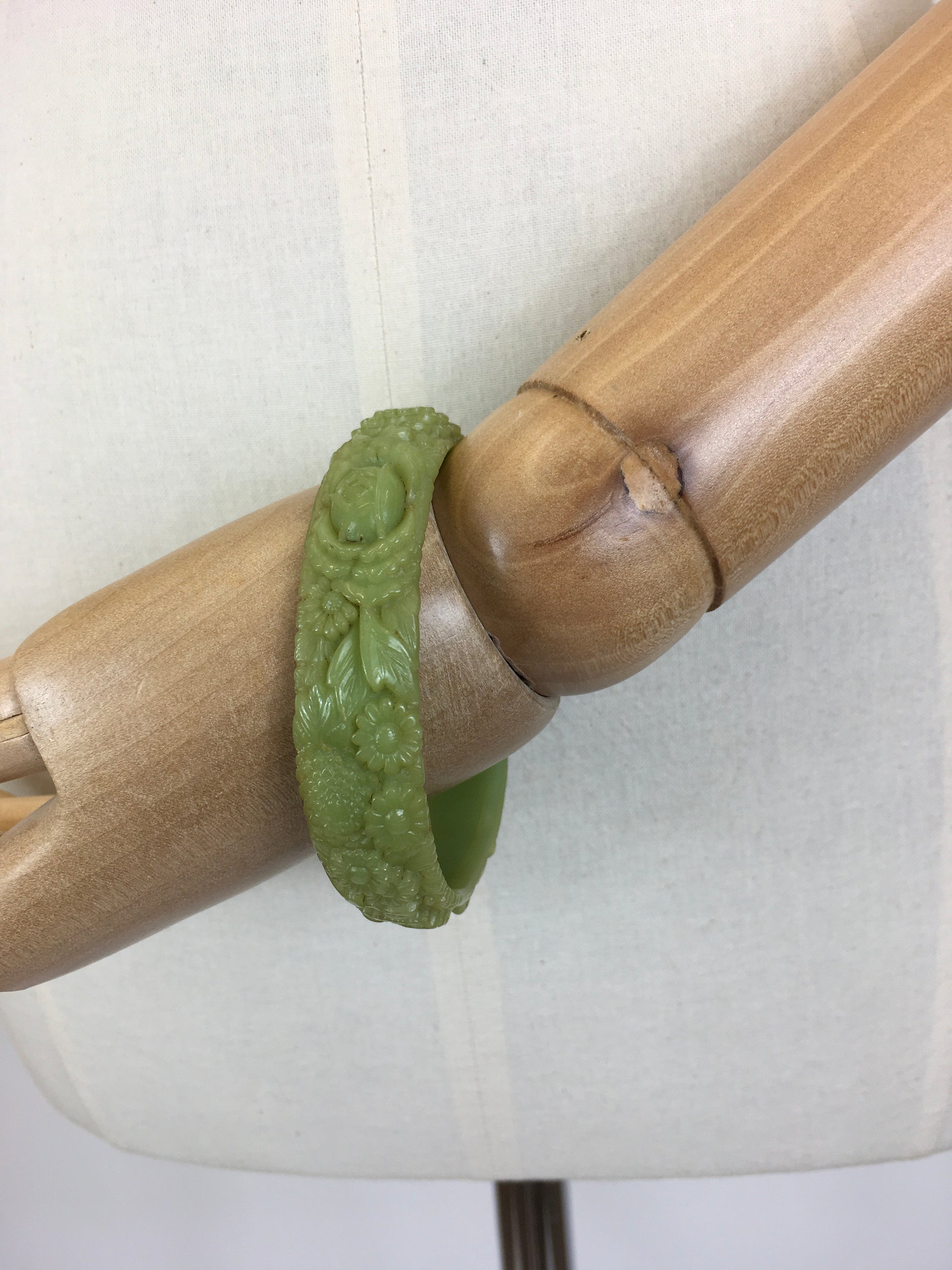 Original Late 1930’s Celluloid Bangle - Featuring Carved Florals in a Deco Green