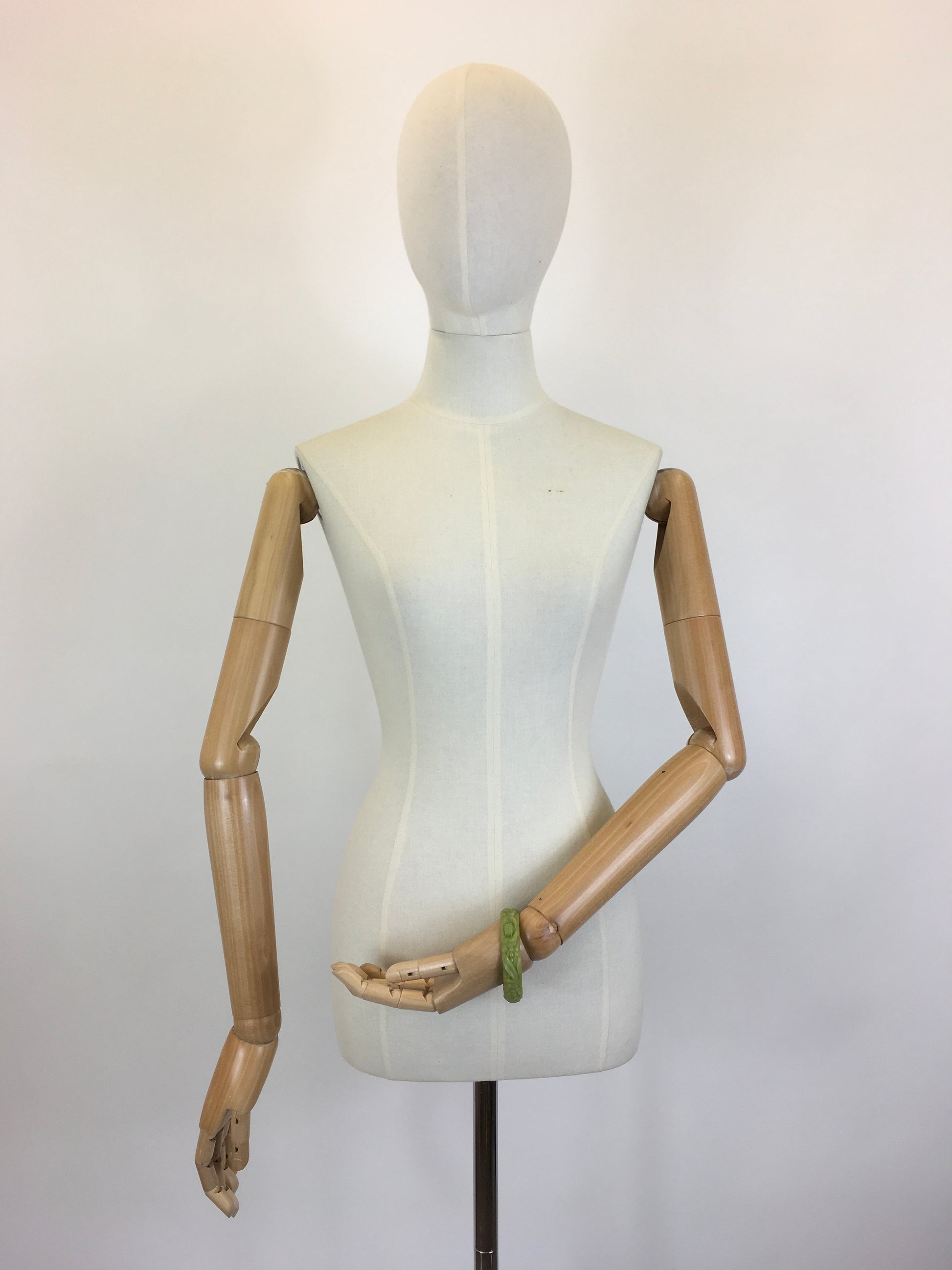 Vintage late 1930’s celluloid bangle featuring lovely carved florals in a deco green. Measuring 2.5’ diameter this sits lovely on the wrist. So intricately designed these pieces are a work of art. A lovely gift to yourself, friend or loved one.