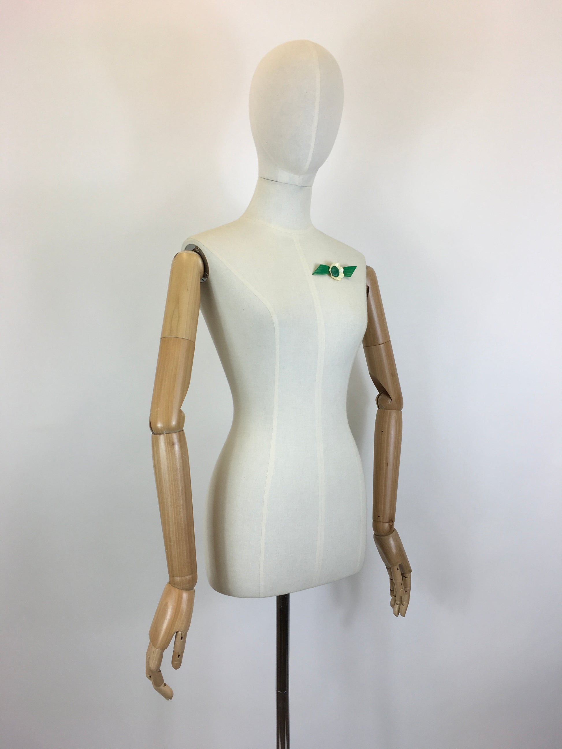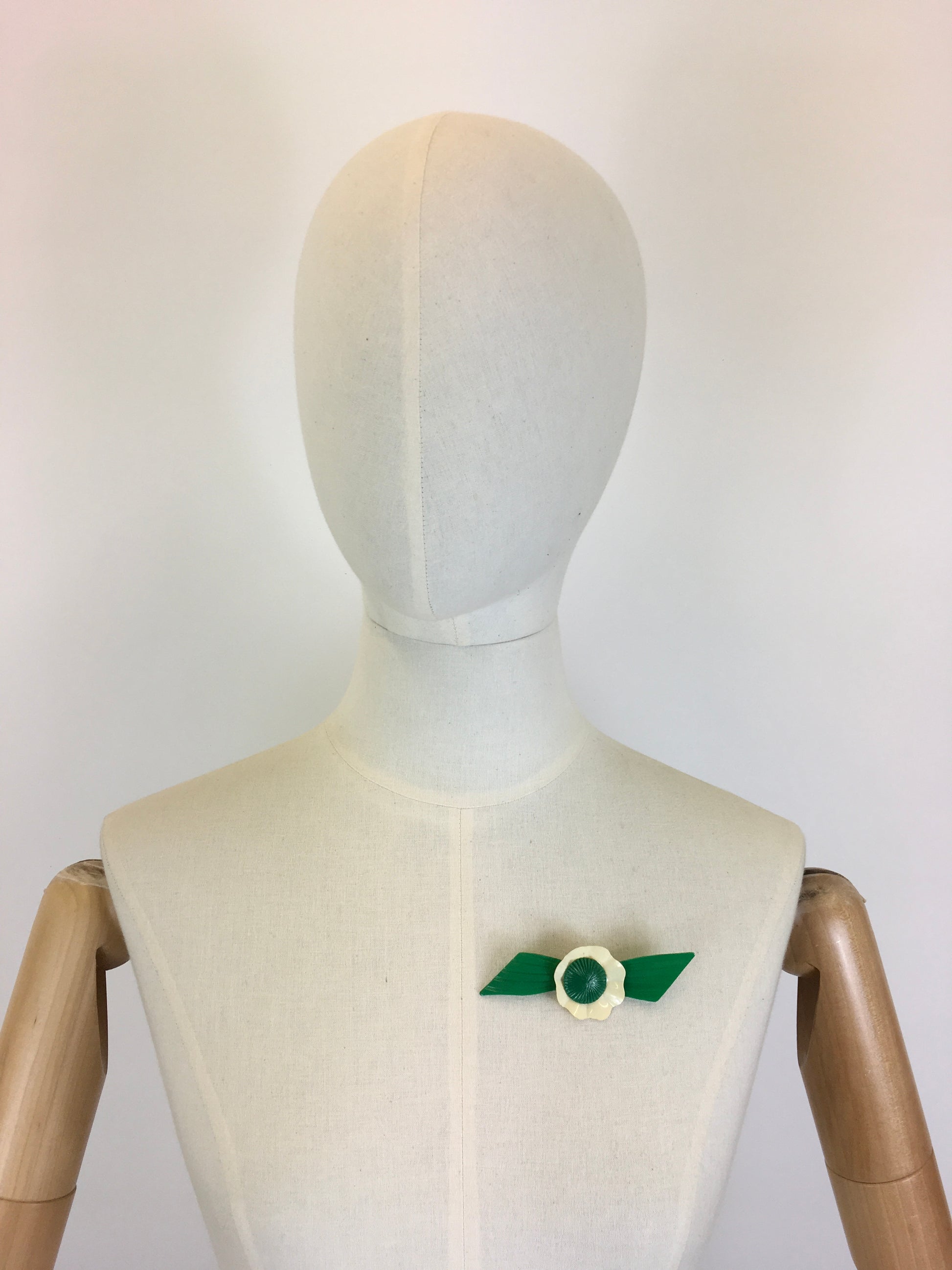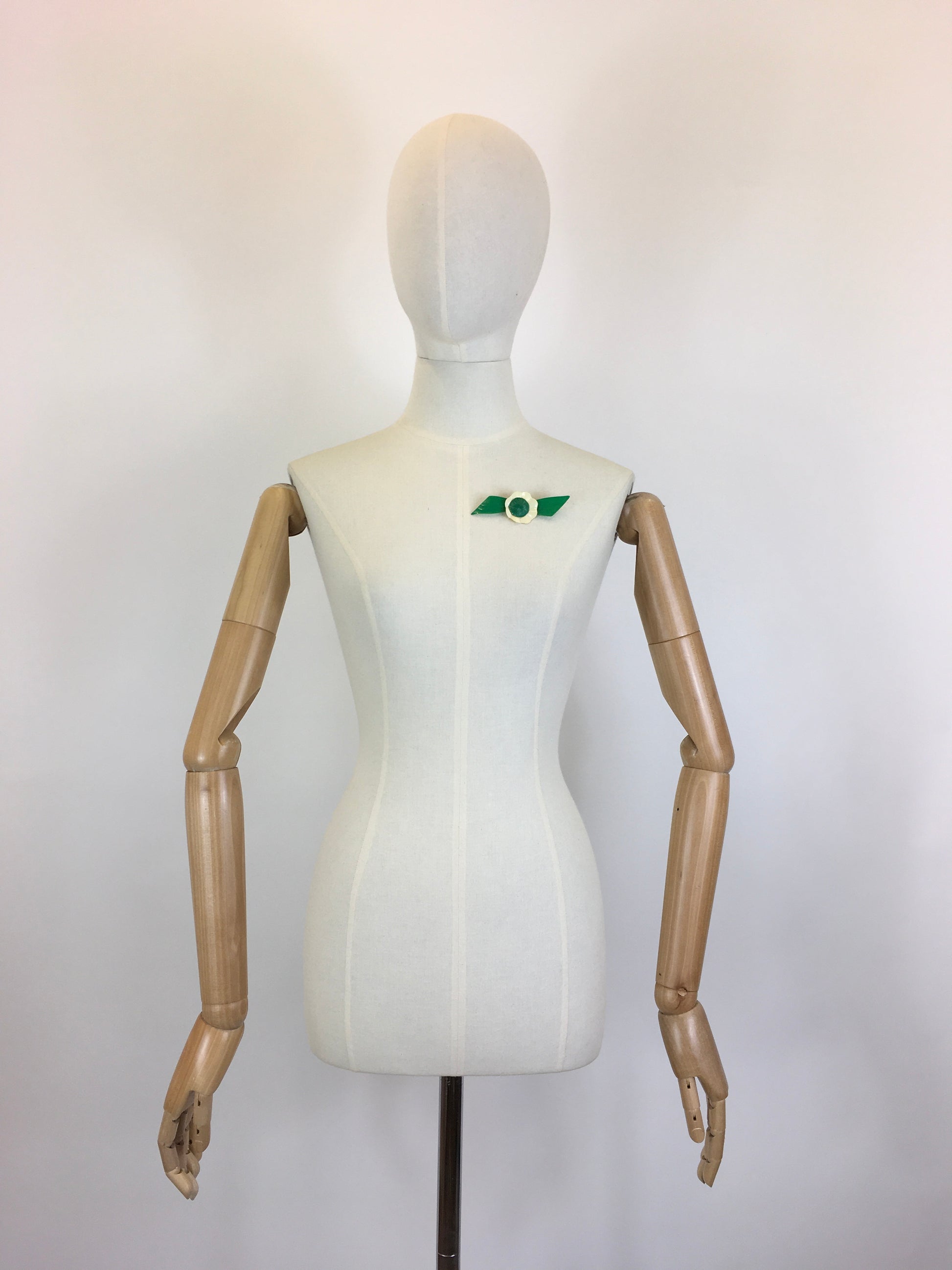 Vintage 1930’s celluloid bar brooch in a divine Art Deco colour way of cream and green. This is a beautiful piece in a fabulous size measuring 3.5’ x 1.25’, it makes a lovely statement On a coat, dress or knitwear set.