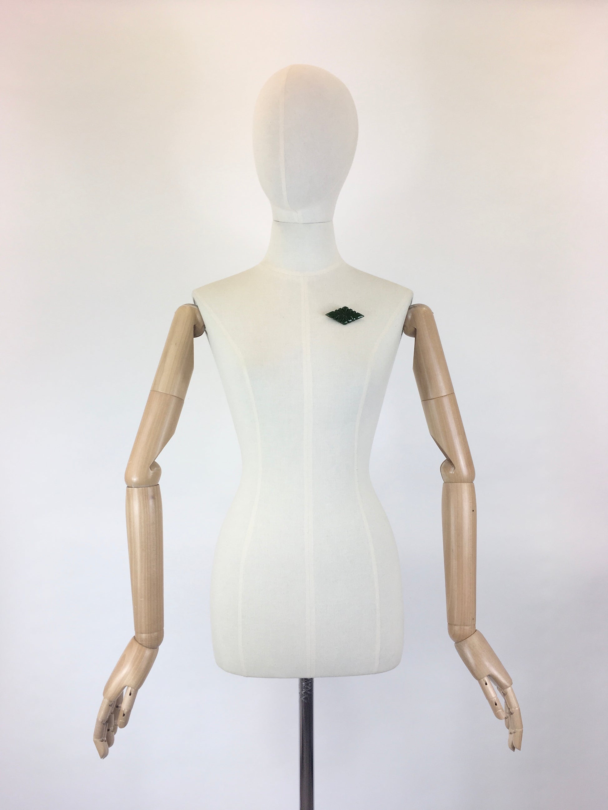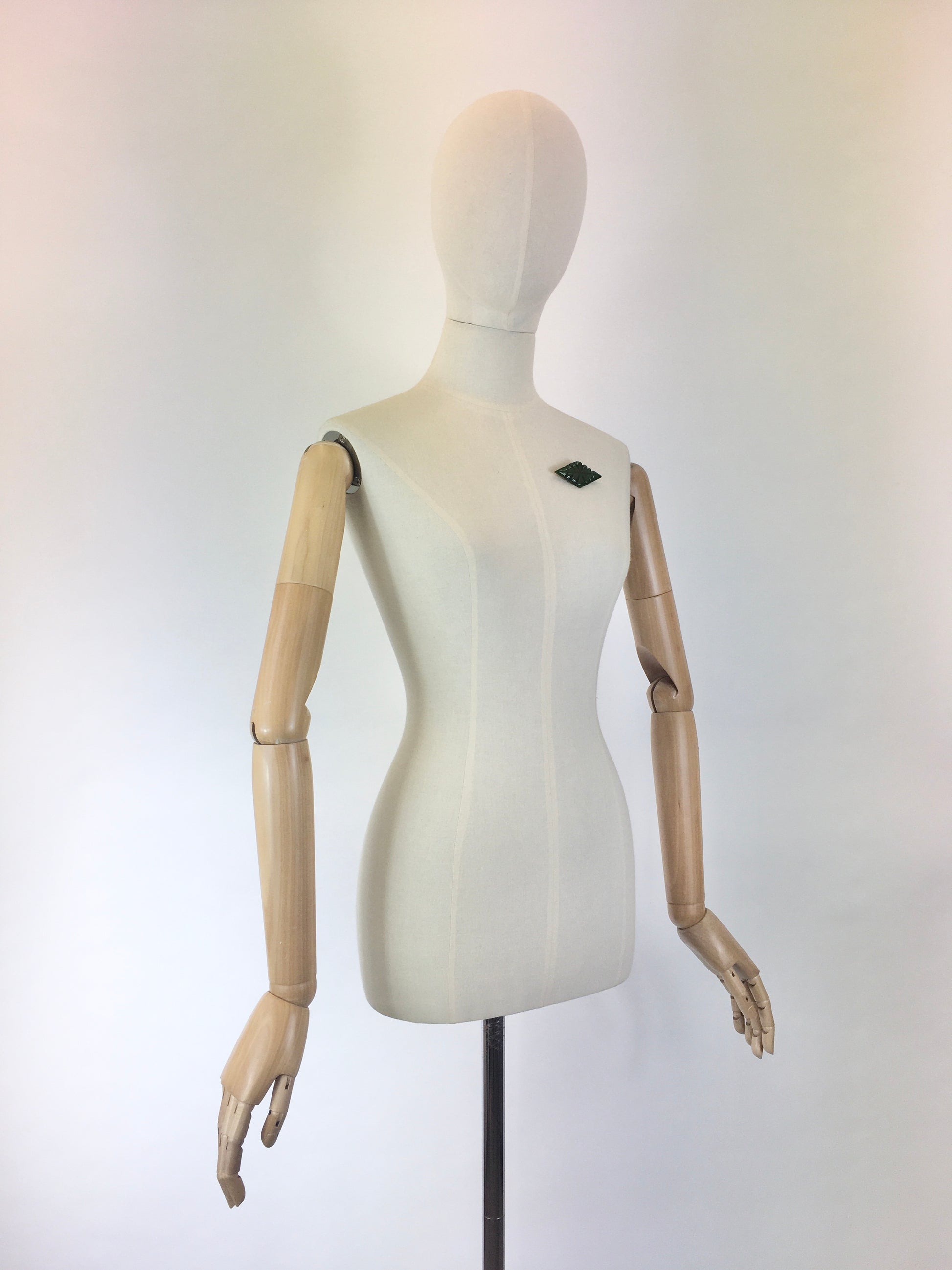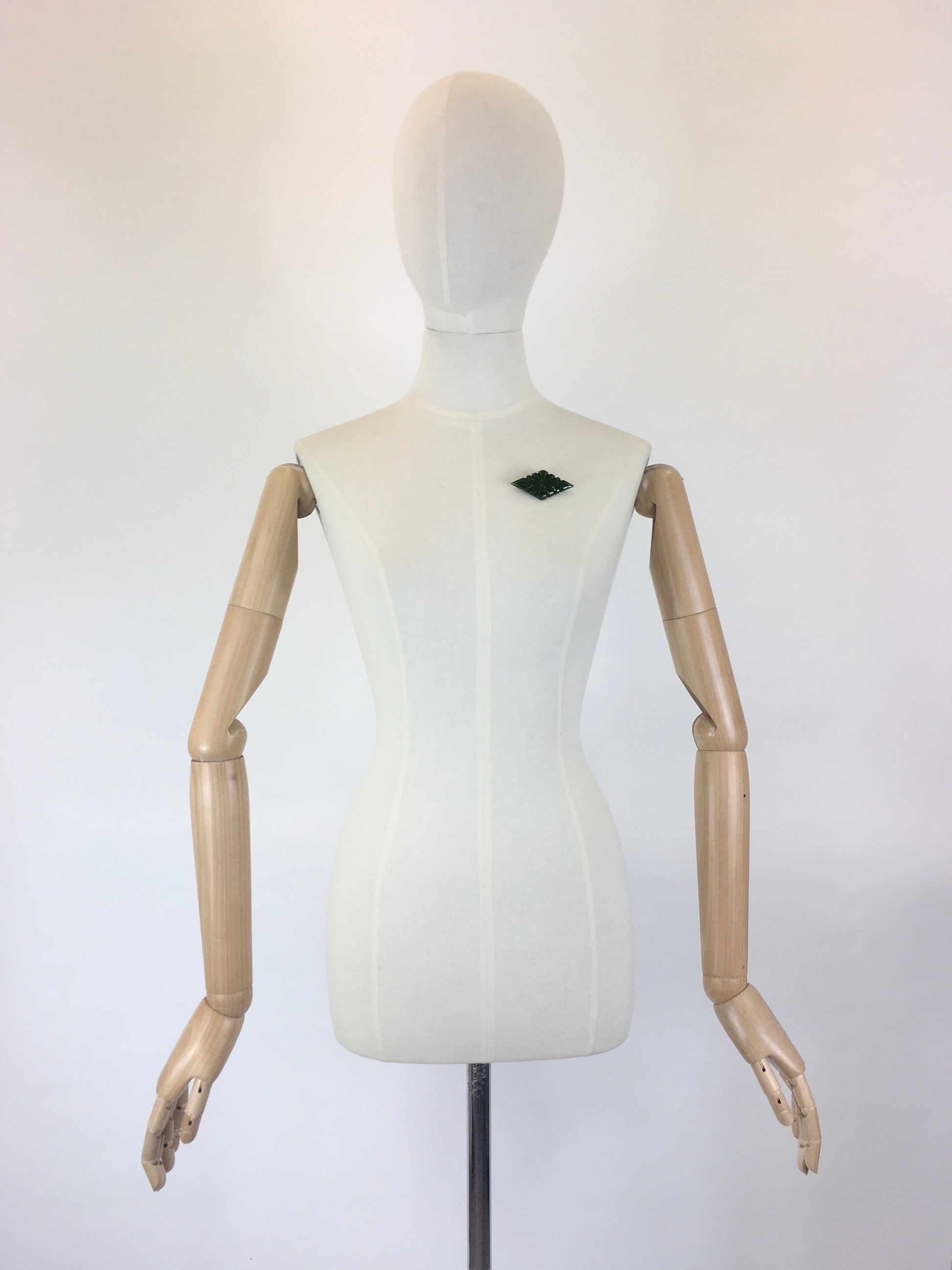Vintage late 1940’s early 1950’s Bakelite leaf brooch in a warm pine green. This piece measures 2’ x 1’ and makes a lovely statement on a jacket lapel, cardigan or coat.