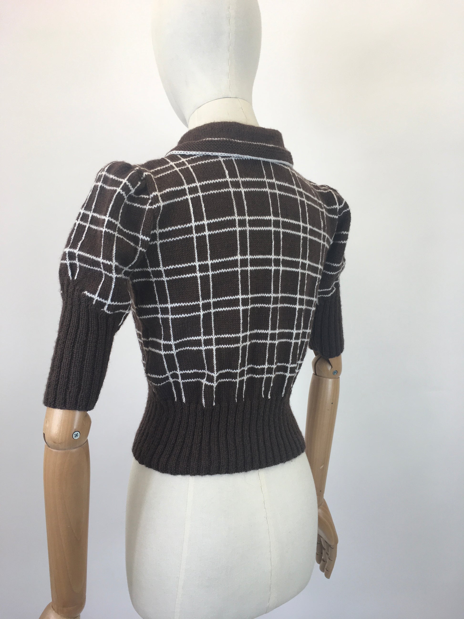RESERVED DO NOT BUY Made from an original 1940’s pattern by Linda Boddison, we have this exquisite jumper knitted using ‘ Sirdar country classic wool’ in brown. Truly one of a kind and extremely authentic using original 1940’s buttons to finish the garment. Featuring a button front, small collar and ribbed waistline this piece has a classic 1940’s silhouette. All its contrast stitch detailing is hand embroidered onto the garment. Linda has sewn shoulder pads into the shoulder seams which help create the most authentic shaping.