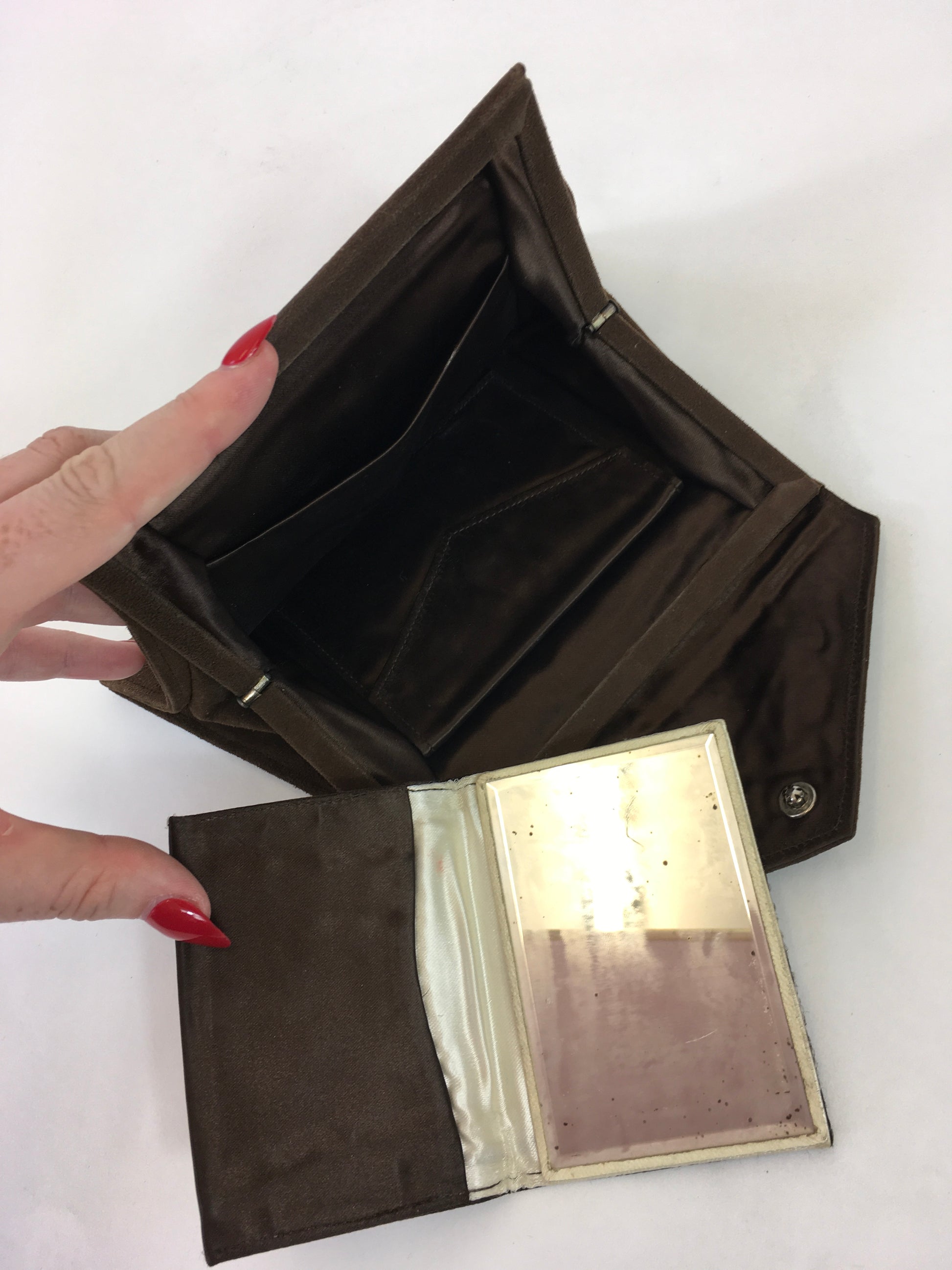 Vintage 1930's exquisite suede evening handbag in a chocolate brown suede with paste embellishment. This piece measures 7' x 5' and is big enough to fit a modern phone, card and a lipstick in for an evenings soiree. It has a fabulous silhouette and features a back opening press stud fastening with finger strap, to the front there is decorative pleating with a paste embellishment.