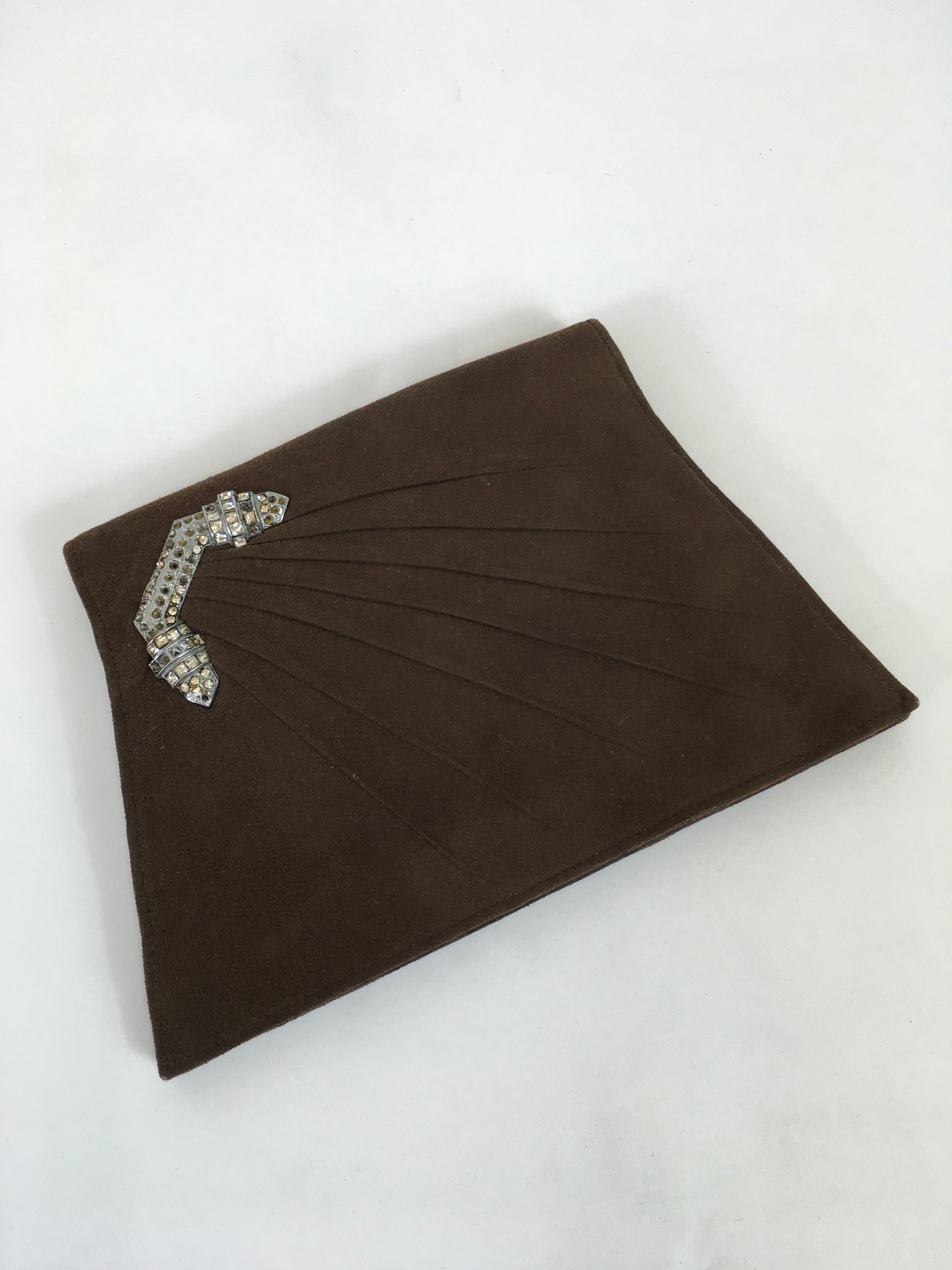Original 1930's Exquisite Suede Evening Handbag - In Chocolate Brown Suede with Paste Embellishment