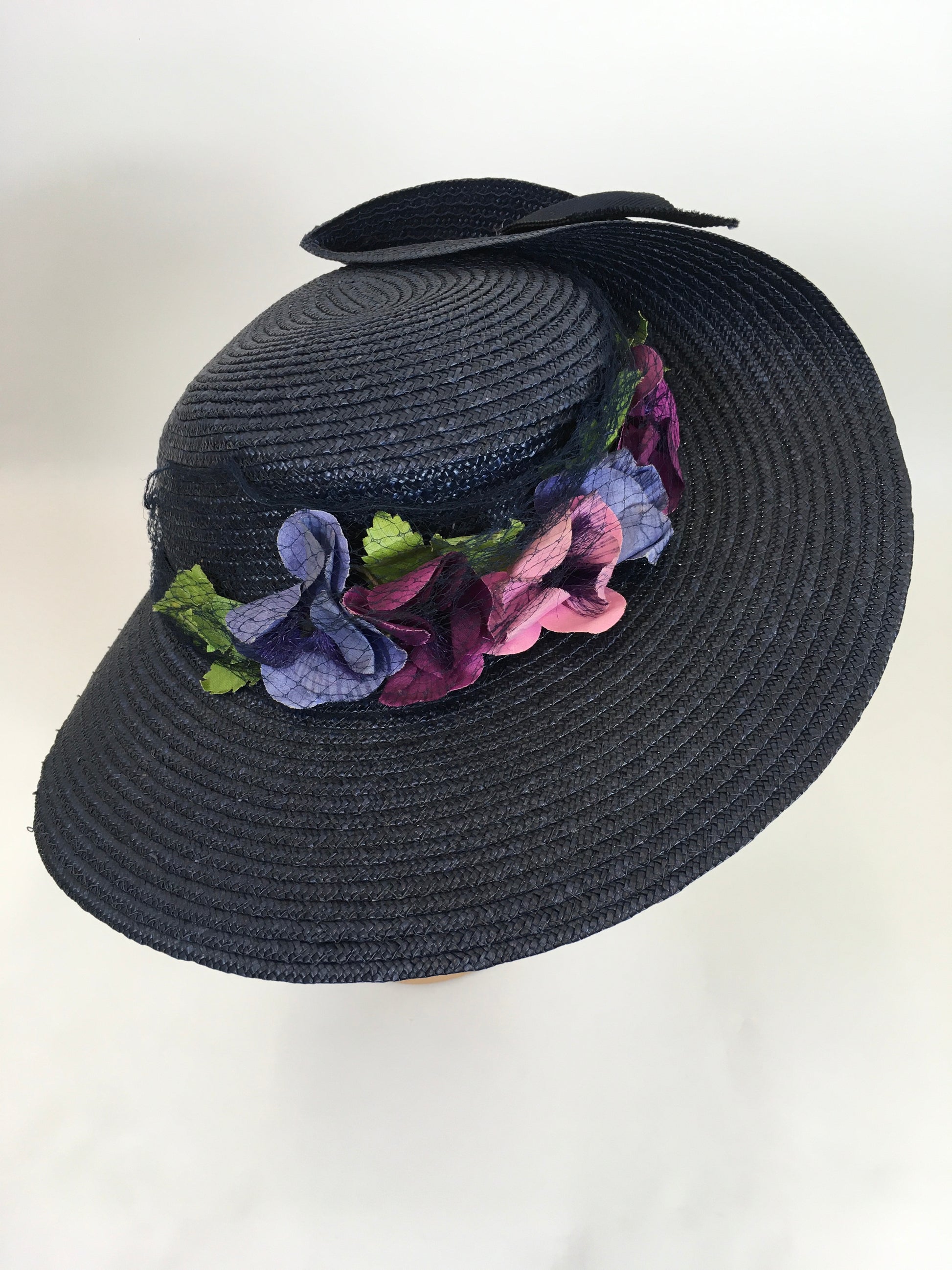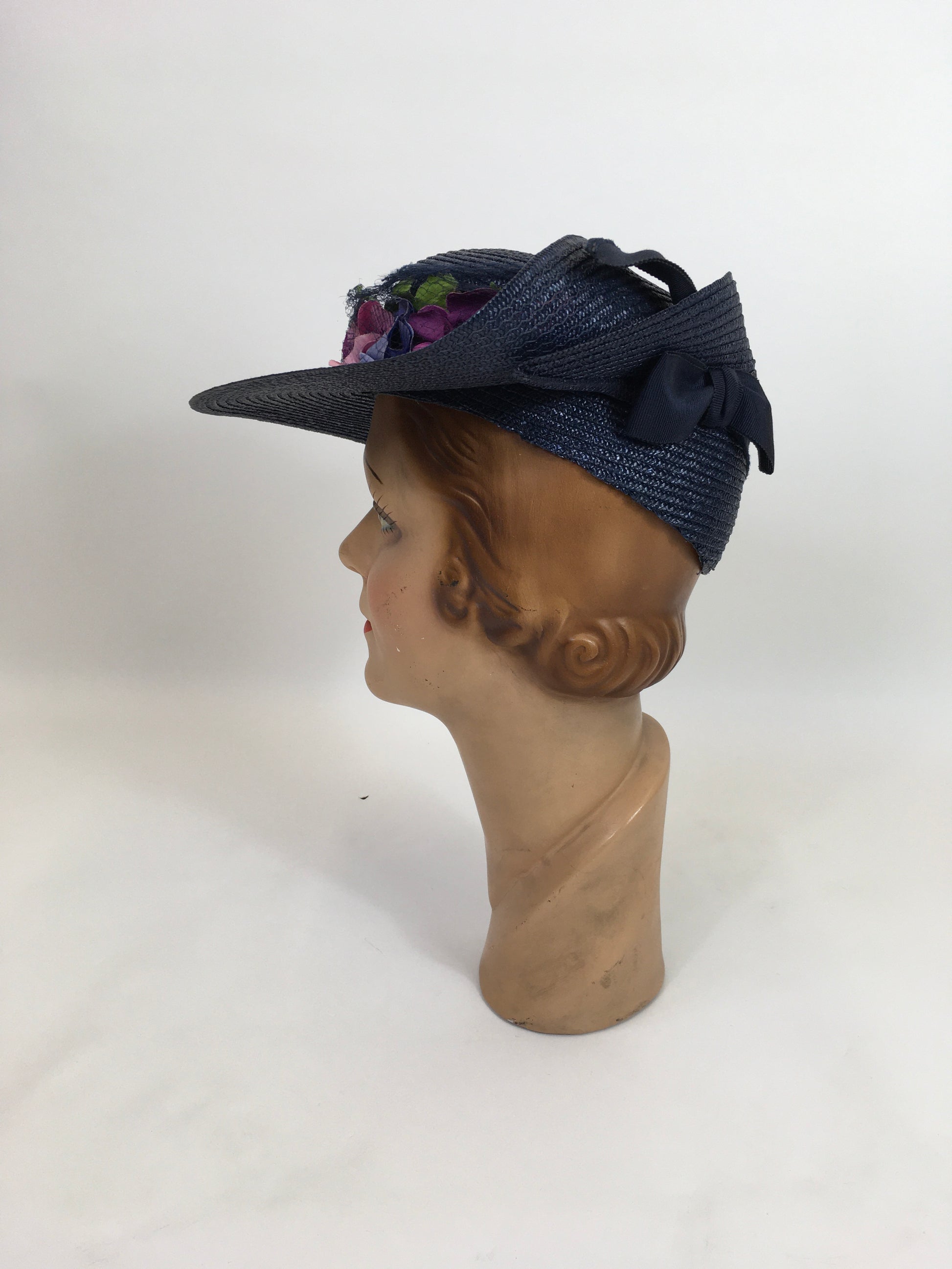 Original 1930’s Stunning Straw Hat - In A Deep Navy With Florals