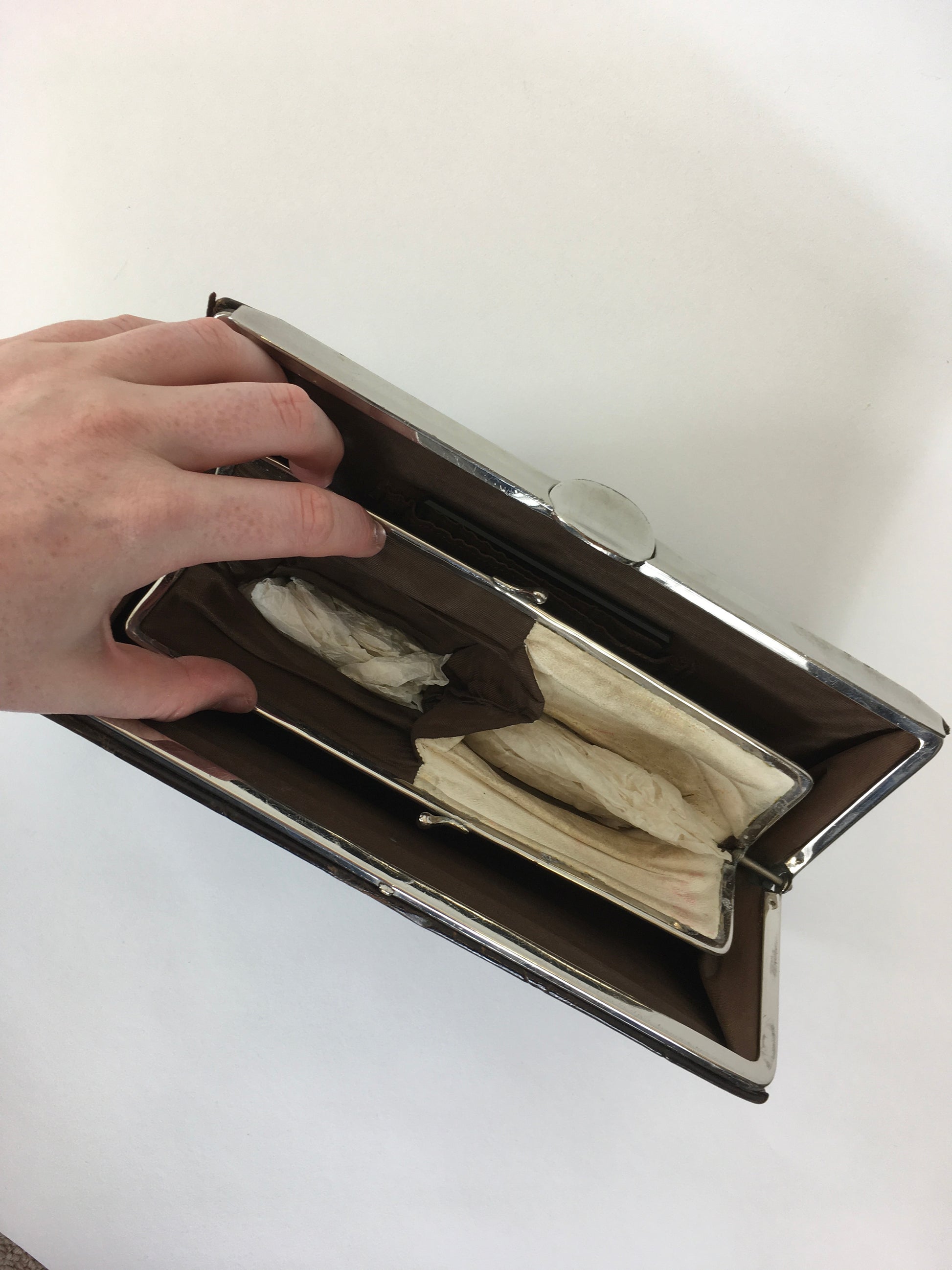 Vintage 1930’s Deco crocodile clutch handbag in a warm brown with chrome detailing. This clutch bag is a lovely piece for both daywear and evening wear for any 30’s or 40’s wearer. It features a classic shape on a metal frame, back strap handle for ease of wear, chrome clasp with internal pockets including purse and mirror. Measuring 10’ x 6’ this is a fabulous piece for the modern lady to fit in a modern phone, lipstick and some pennies.