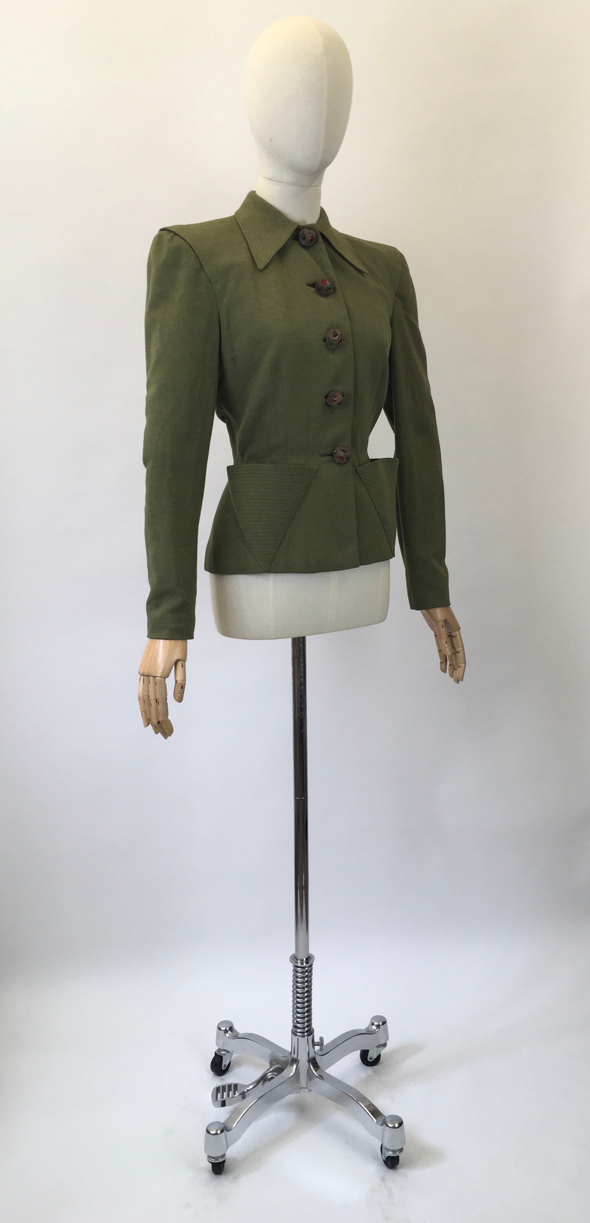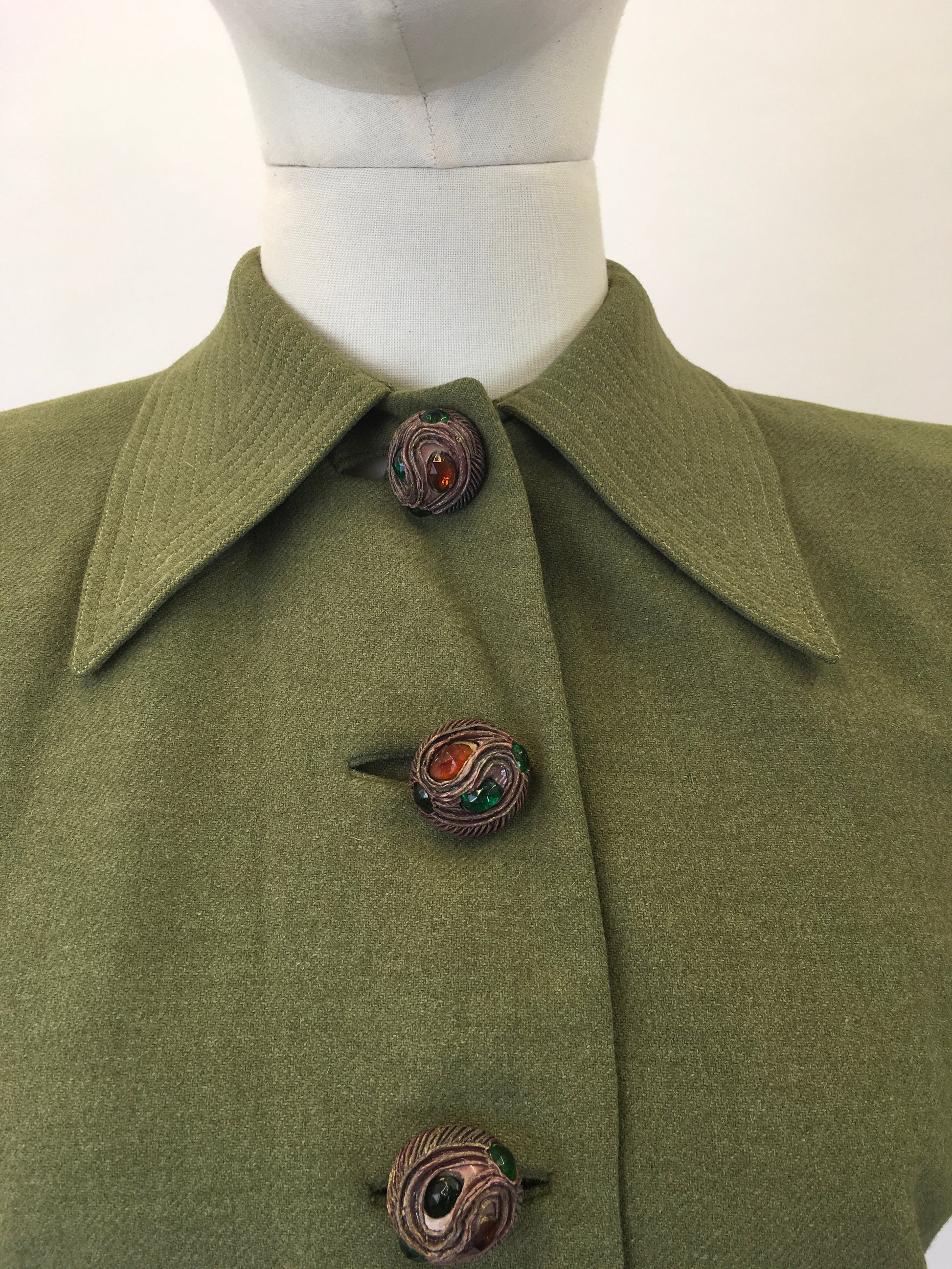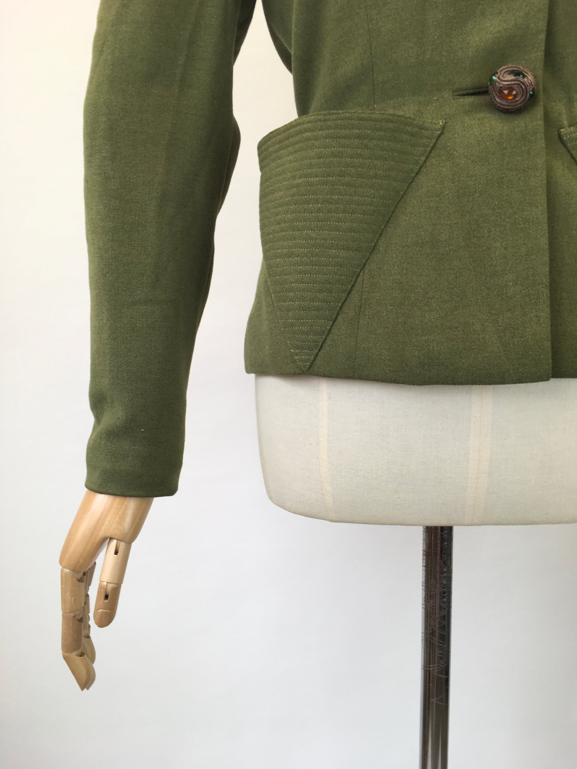 Vintage 40's darling jacket in Sage Green. Fully lined in the softest of wool. This American beauty has amazing stitch work to the spearpoint collar, with matching stitch work to the pockets. 5 x gorgeous original oversized buttons adorn the front with glass beads of amber and jade green. Slight shoulder pads and gentle shoulder tuck give this jacket such a glamour and with the darts to the back, all in all a fabulous silhouette of the Finest quality.
