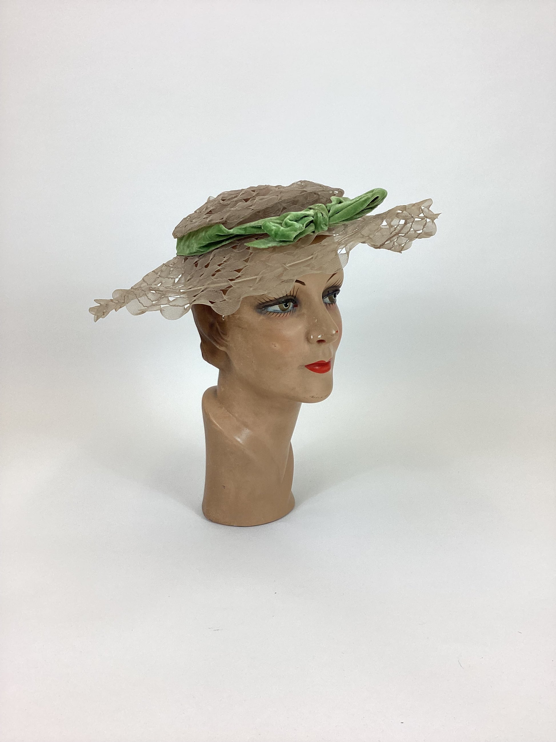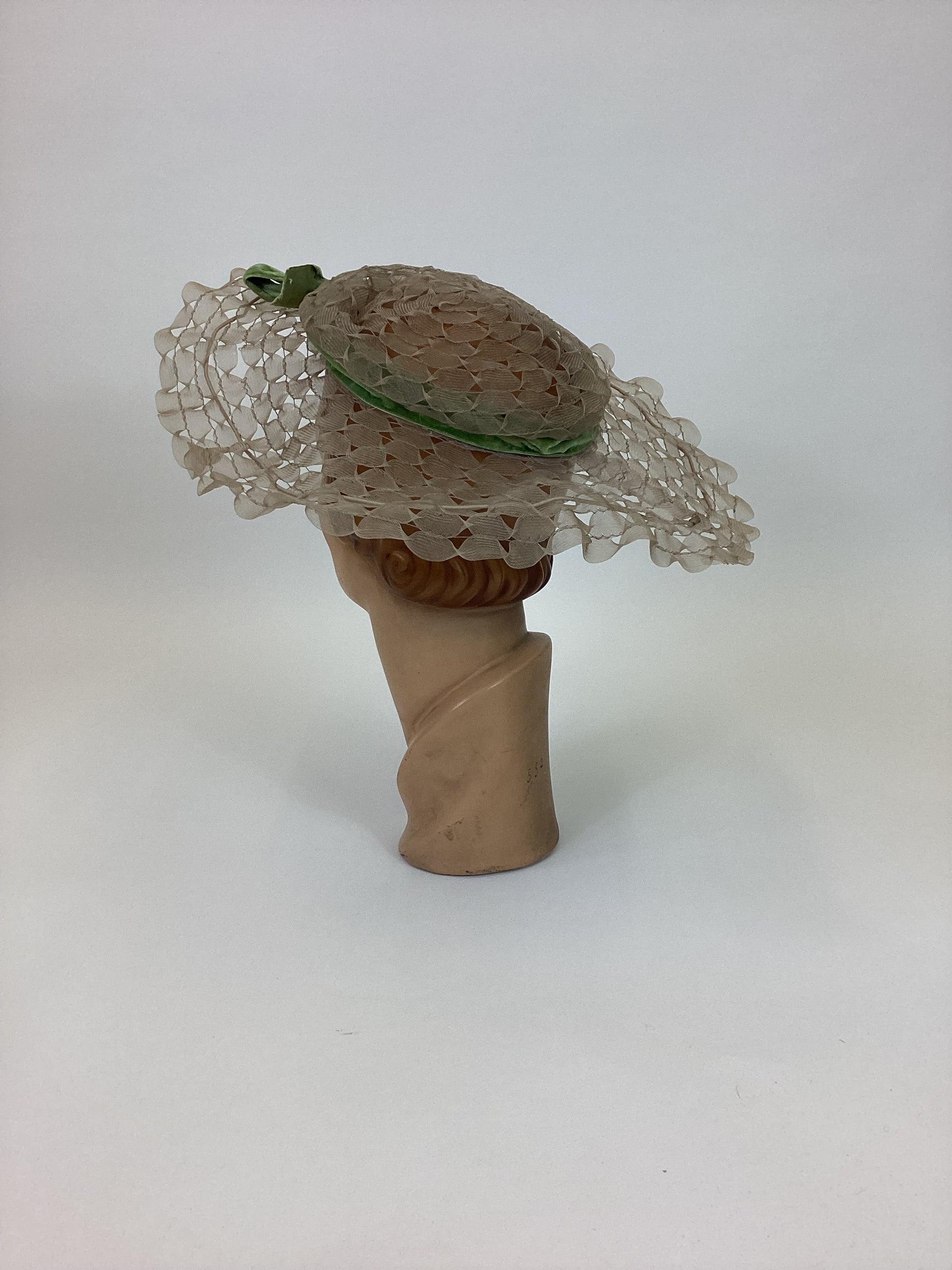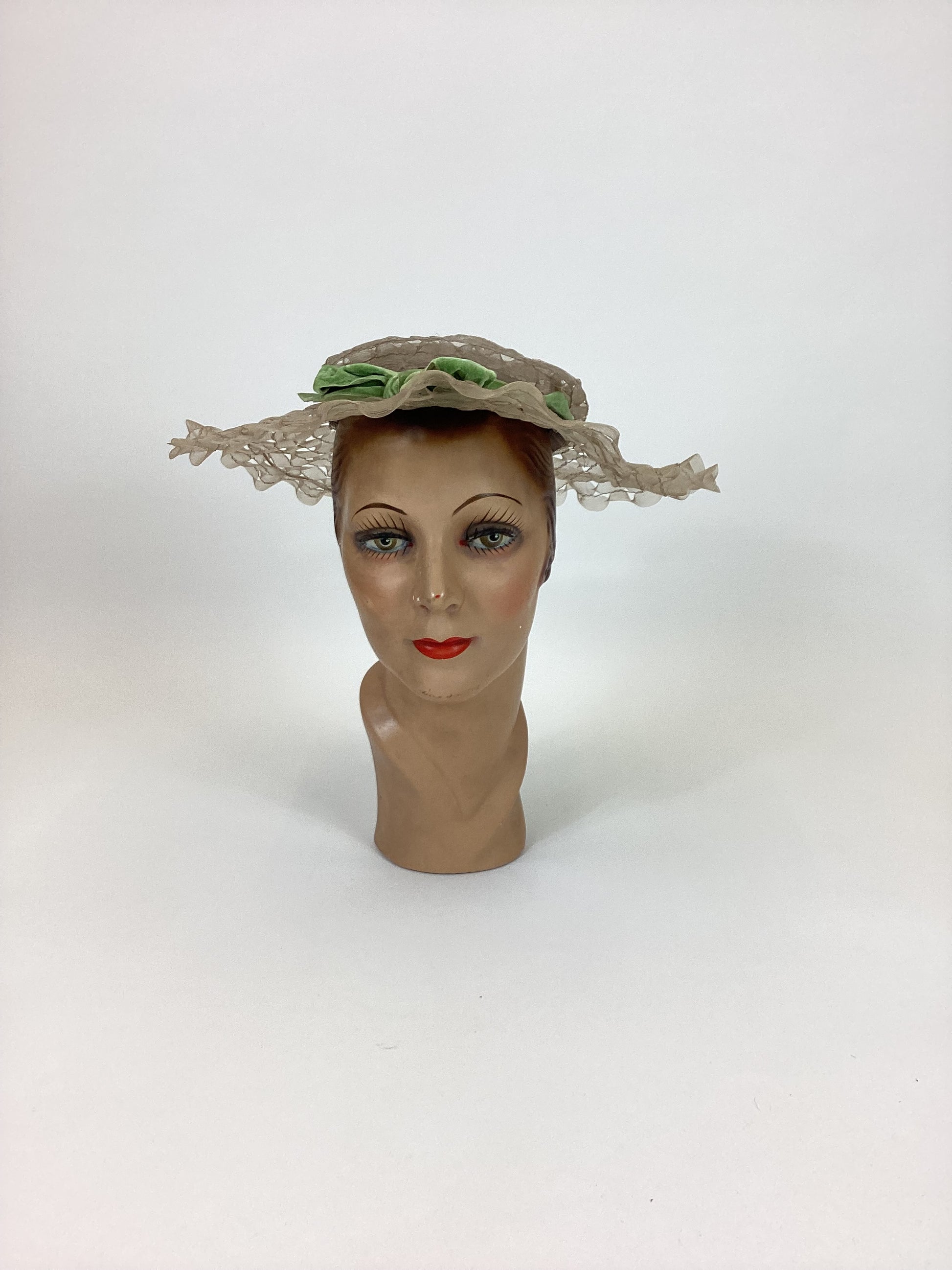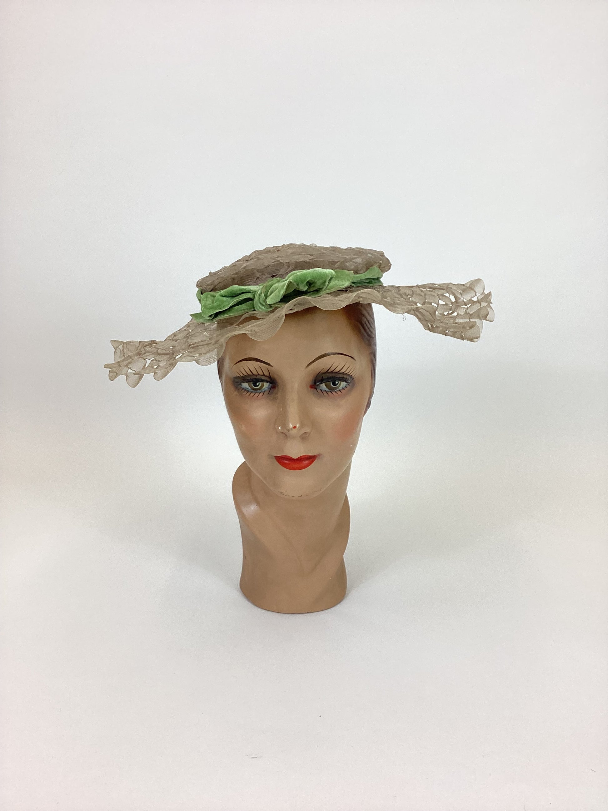 Vintage 1910's Amazing Edwardian hat in the palest of pale green. Think Titanic era. Immense construction on this fabulous beauty - almost ribbon like, sewn in a swirling circle from the shallow crown to the end of the suitably wide brim. Edwardian era hats were more pastel shades rather than the darker hues of the Victorian era.