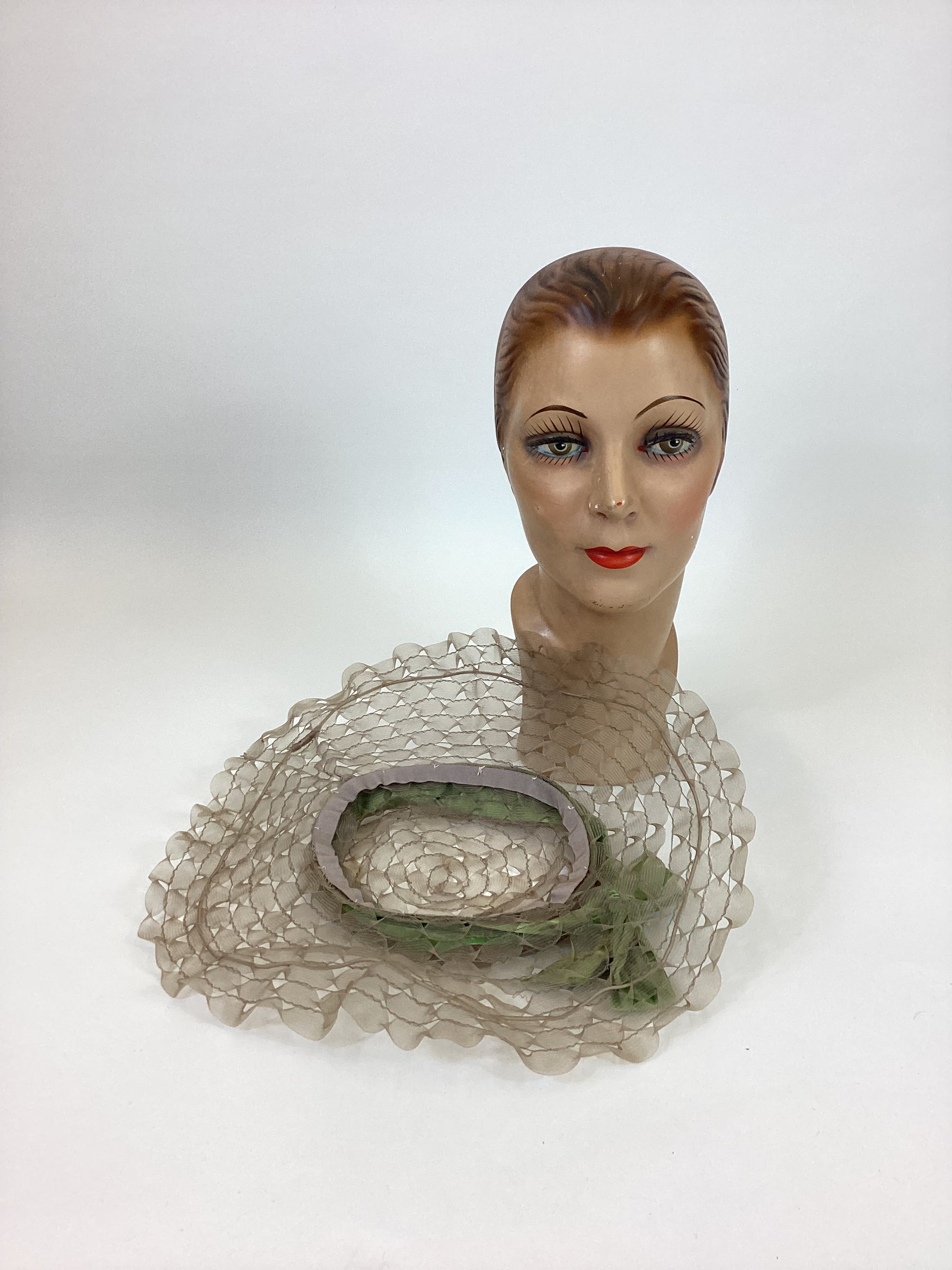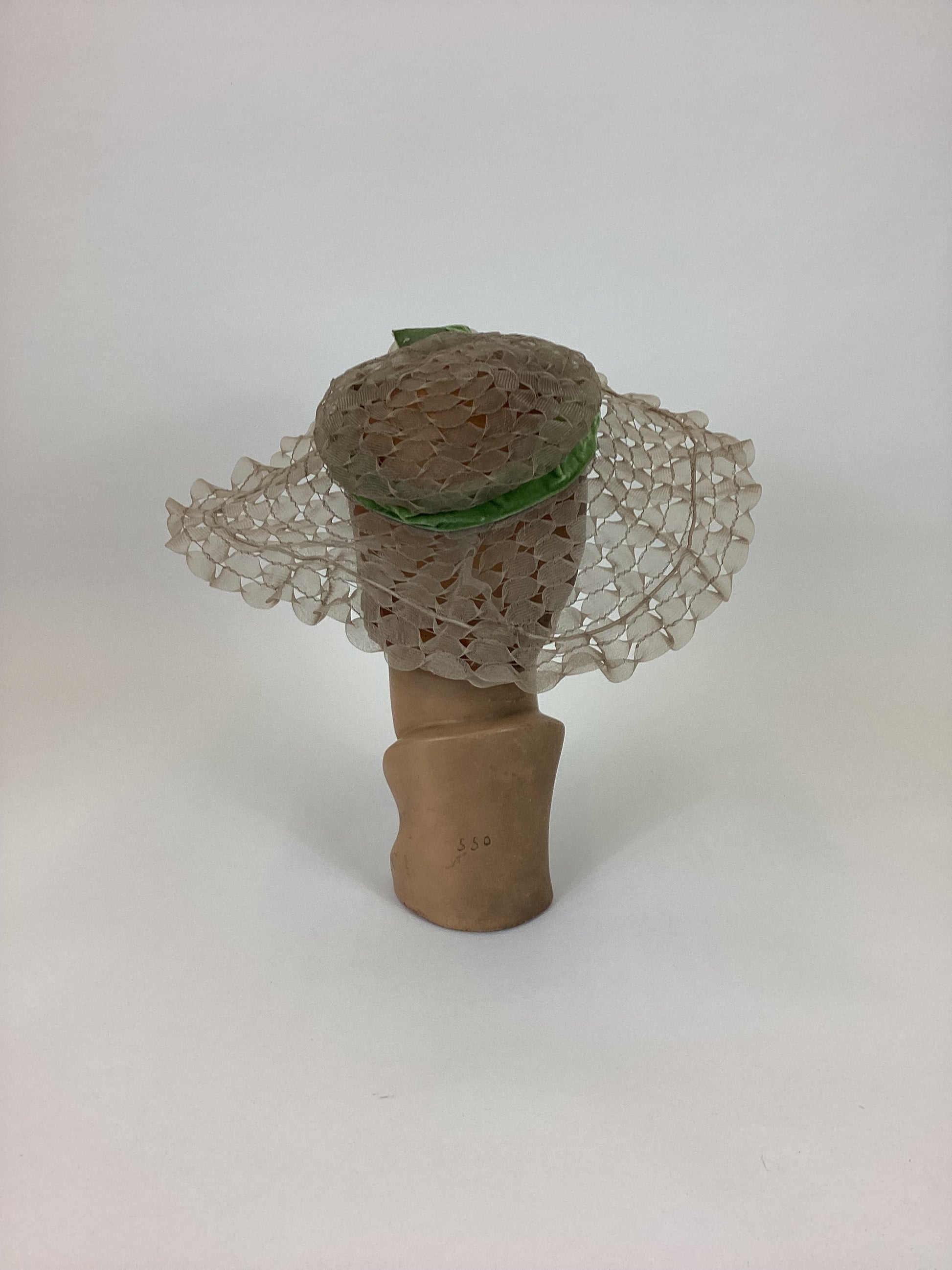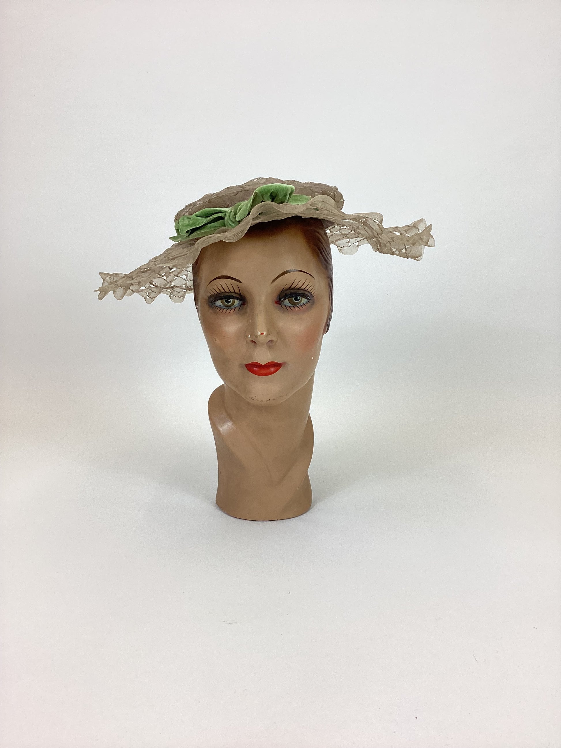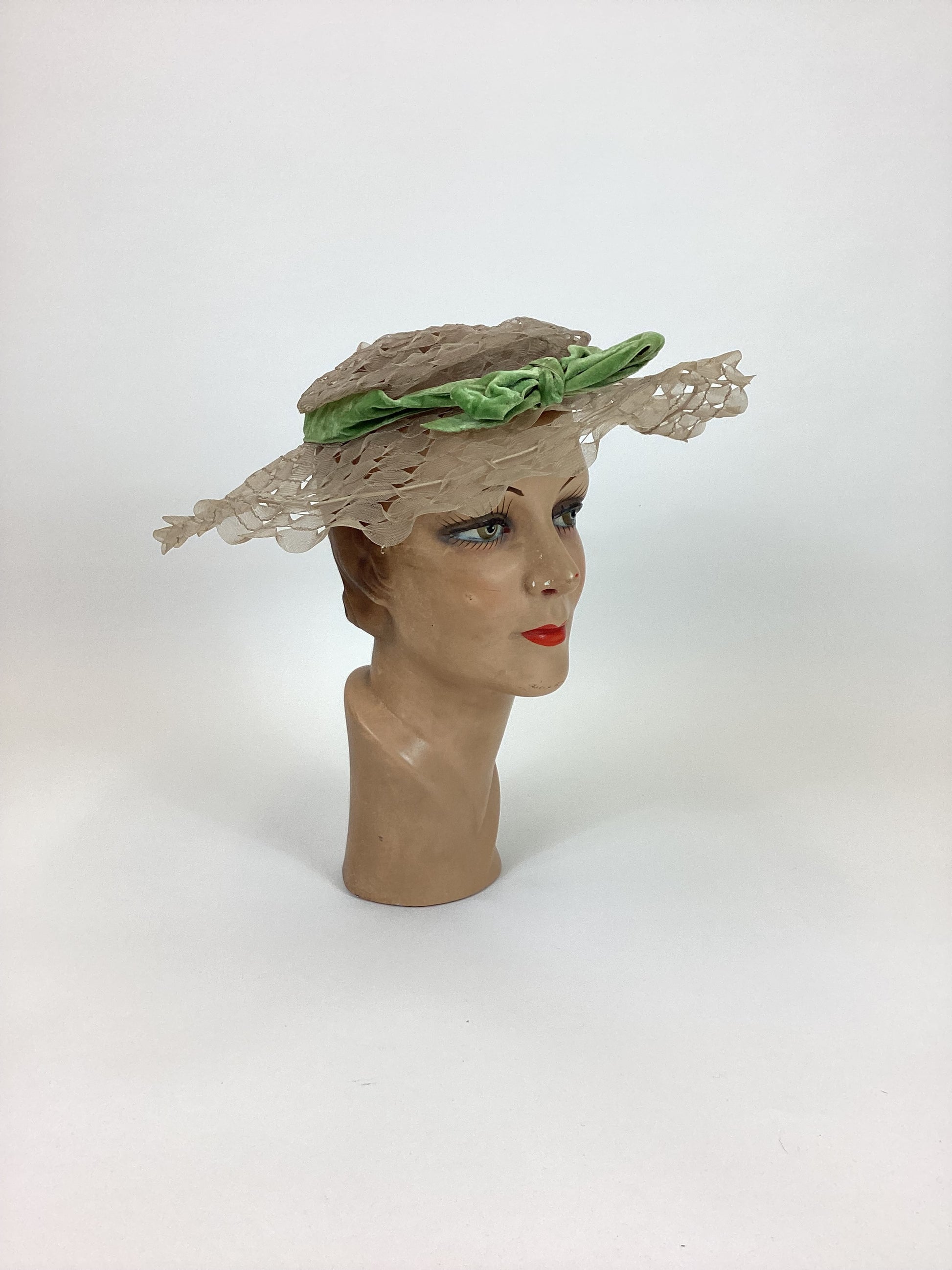 Vintage 1910's Amazing Edwardian hat in the palest of pale green. Think Titanic era. Immense construction on this fabulous beauty - almost ribbon like, sewn in a swirling circle from the shallow crown to the end of the suitably wide brim. Edwardian era hats were more pastel shades rather than the darker hues of the Victorian era.
