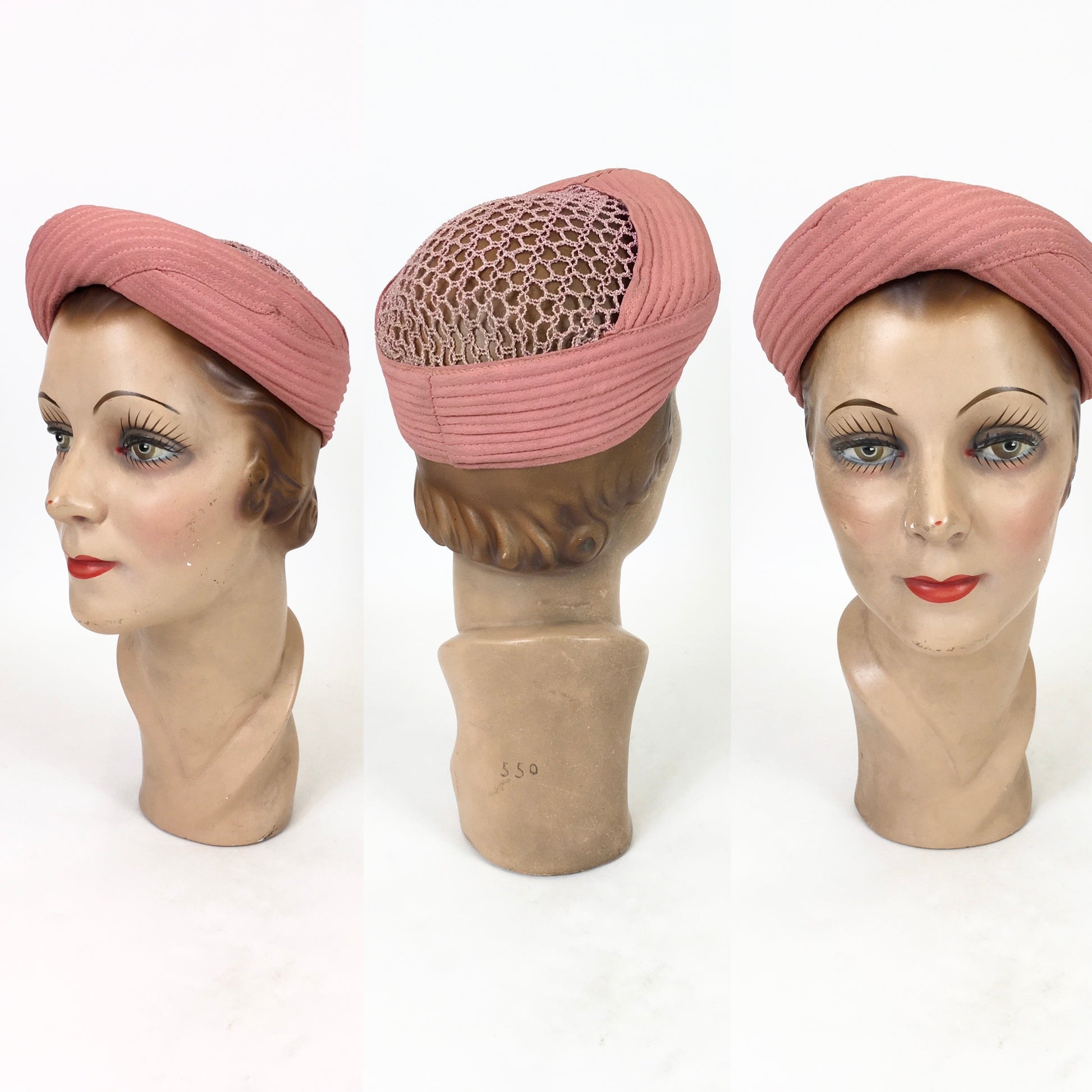Vintage 1940's darling turban halo hat with open crown in a powdered salmon pink crepe. This is a fabulous piece with a really interesting construction. It is made from layered crepe to its outer with a crochet lacework overlay to its open crown back. It sits on the head similar to that of a turban with an almost halo shaping to its front. This piece presents beautifully and in a very popular colourway.