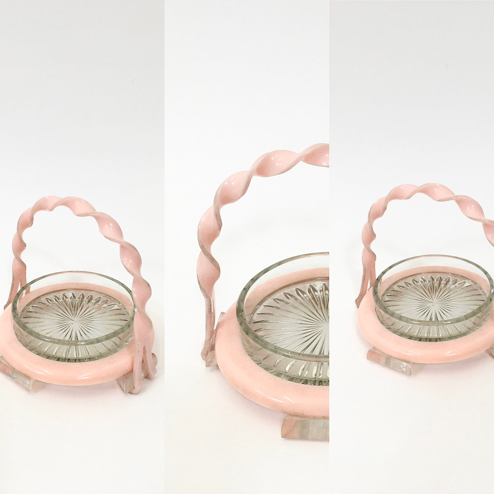 Vintage 1940's / 1950's fabulous lucite and glass trinket dish with twisted handle and matching feet in a darling pastel pink. This piece is a great addition to any vintage vanity to store trinkets / jewellery or even as part of the breakfast table for jams and condiments. A very versatile but fabulous piece of homeware that also stores flat for ease of use.
