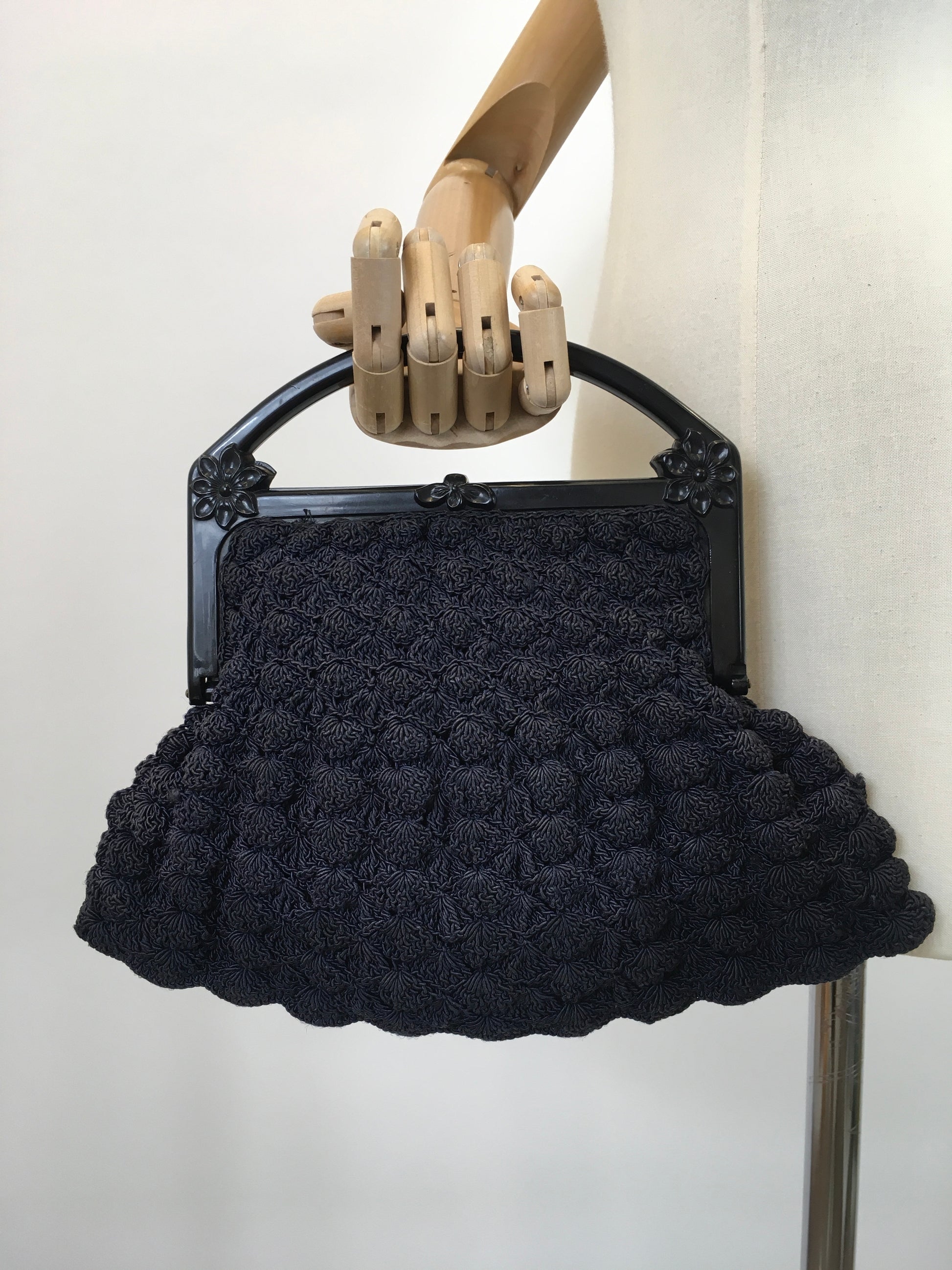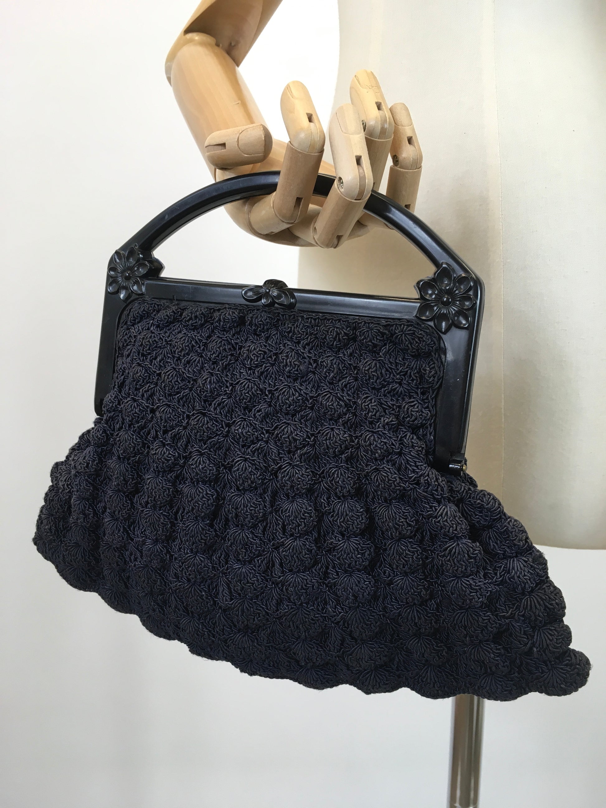 Vintage stunning 1930's popcorn crochet handbag with celluloid embossed handle in a classic navy colourway. This is a beautiful example from its time and features beautiful floral embossed detailing to its handle which opens with a simple matching lift up clasp. The main body of the bad is made from popcorn crochet stitchwork and to its interior features one large pocket.