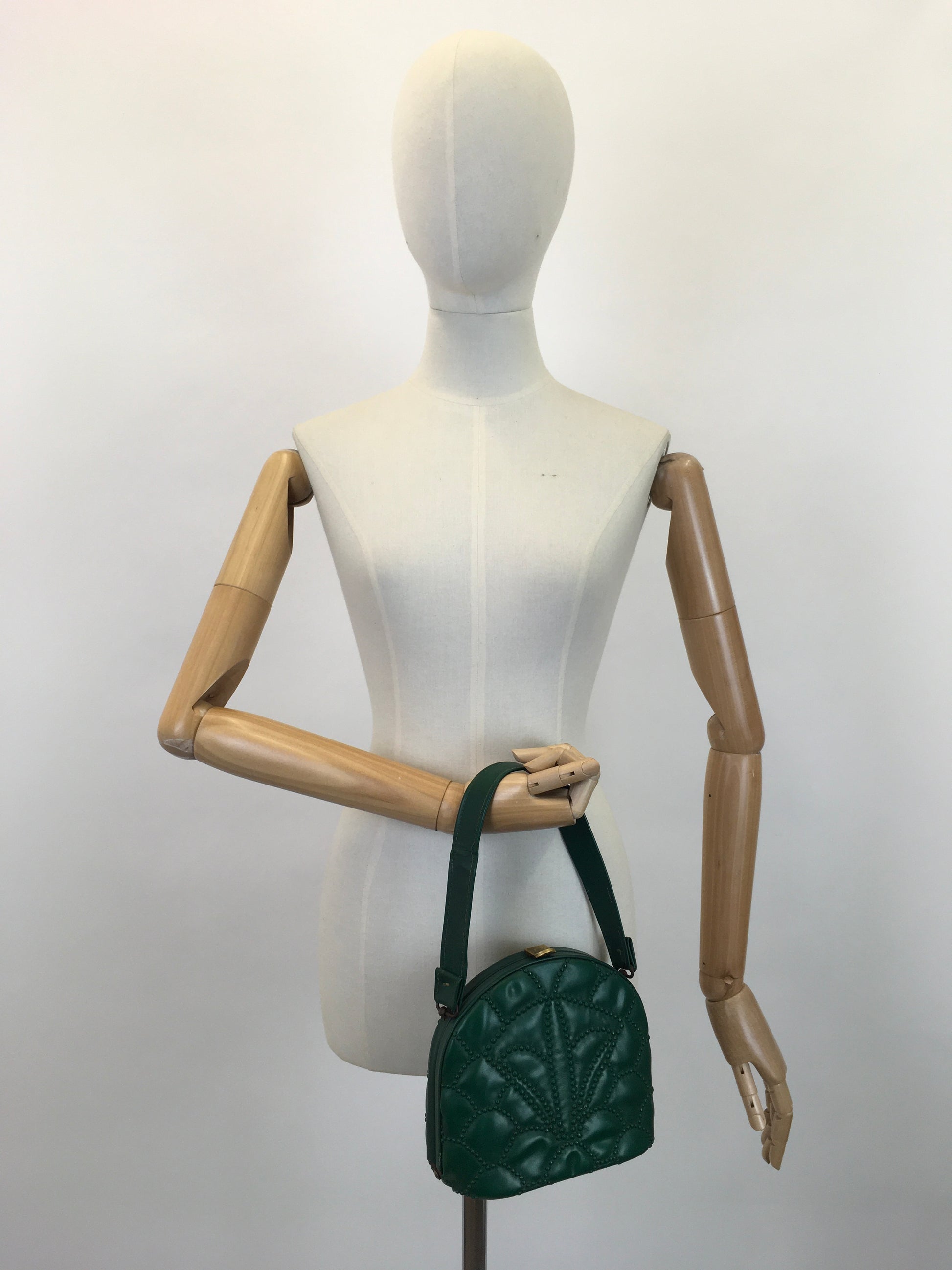 Vintage stunning 1940's emerald green handbag with studded embellishments. This is a beautiful example from its time in a stunning colourway which you don't often see. It has a classic late 1940's shape and features a single handle on a metal work frame. It is made from an emerald green vinyl with metalwork studs pressed into a pattern to its front. To its interior it features its split into 2 sections and features a central zip compartment.