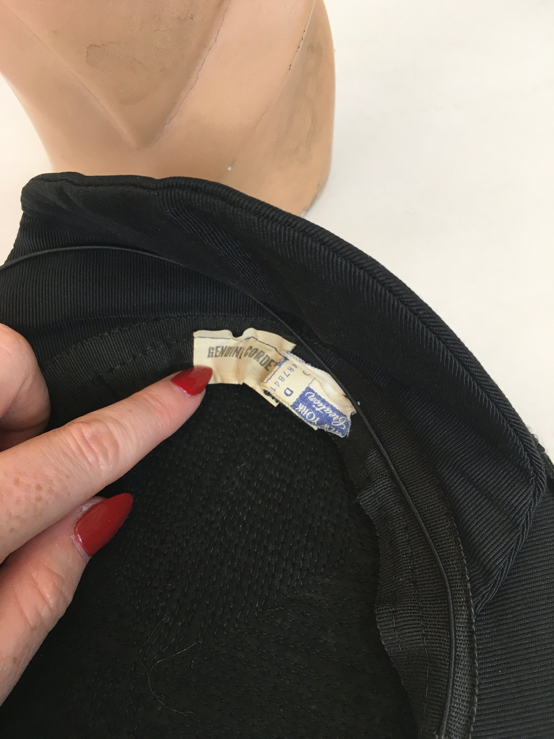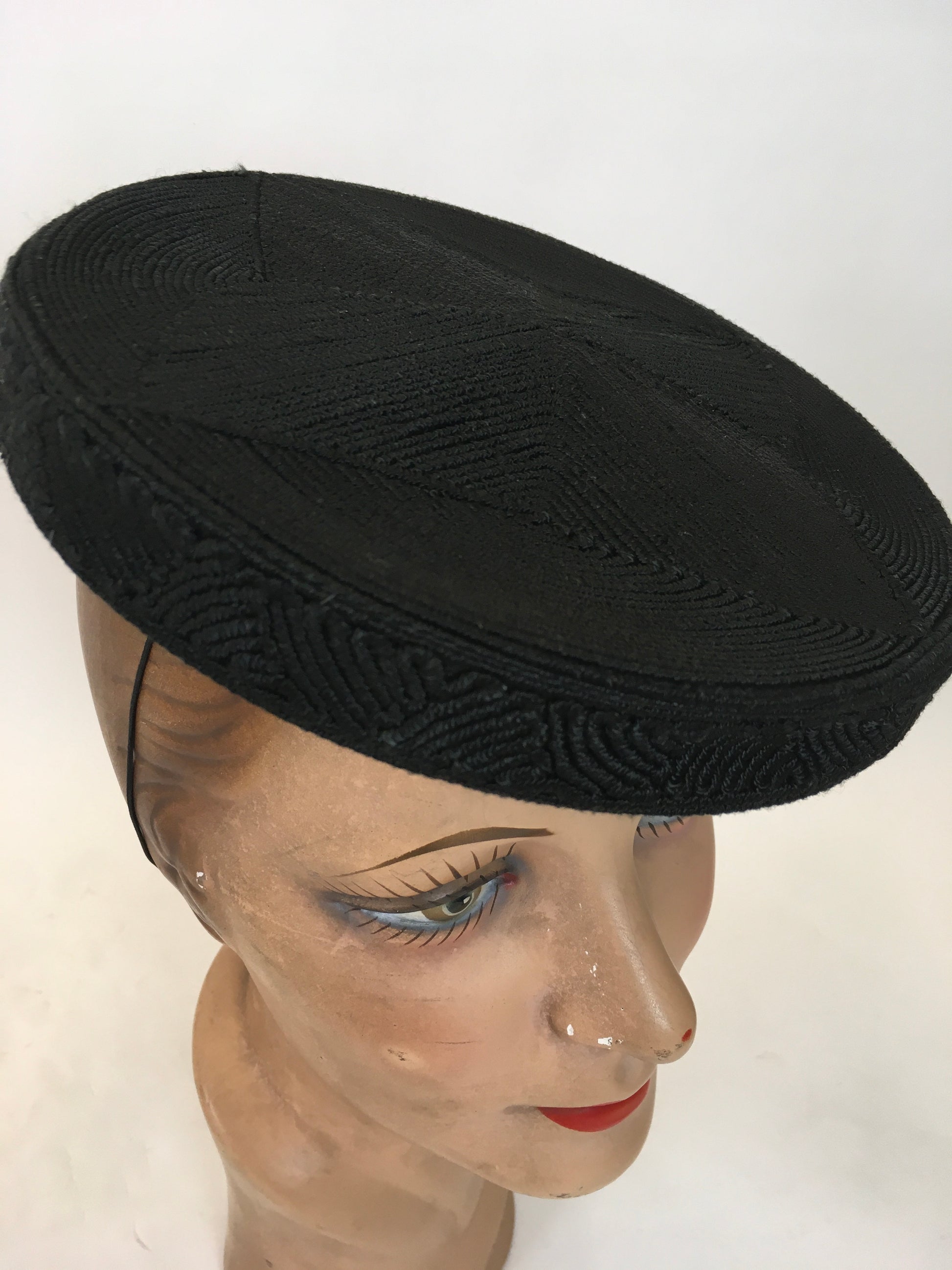Vintage sublime 1940's American Corde tilt hat in an inky black. It has a back plate and sewn in elastic for ease and stability when wearing. It has a lovely construction with beautiful Corde detailing and can be sat on the head in varying ways for different styling. A must have example for any 1940's loving lady or collector of Corde.