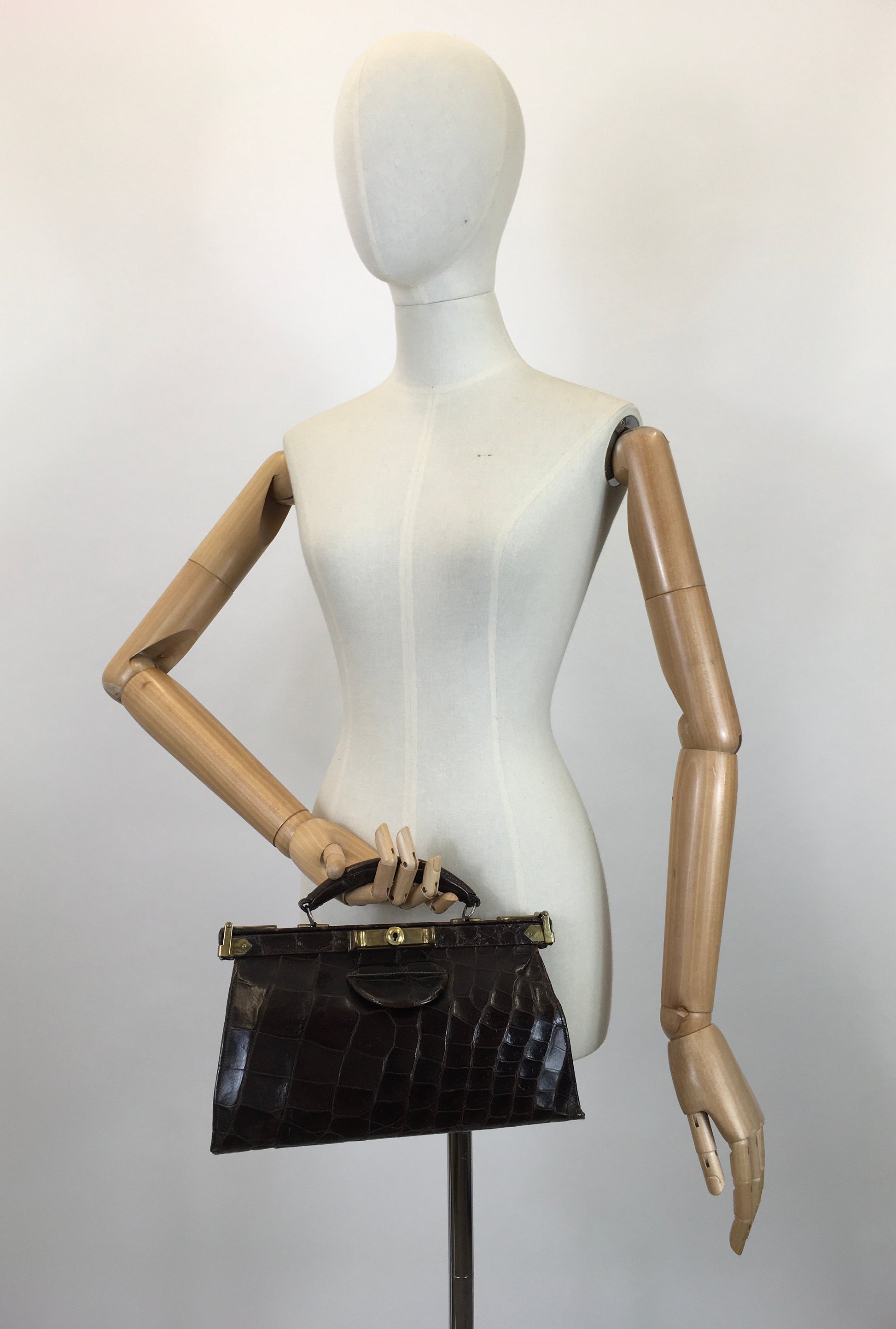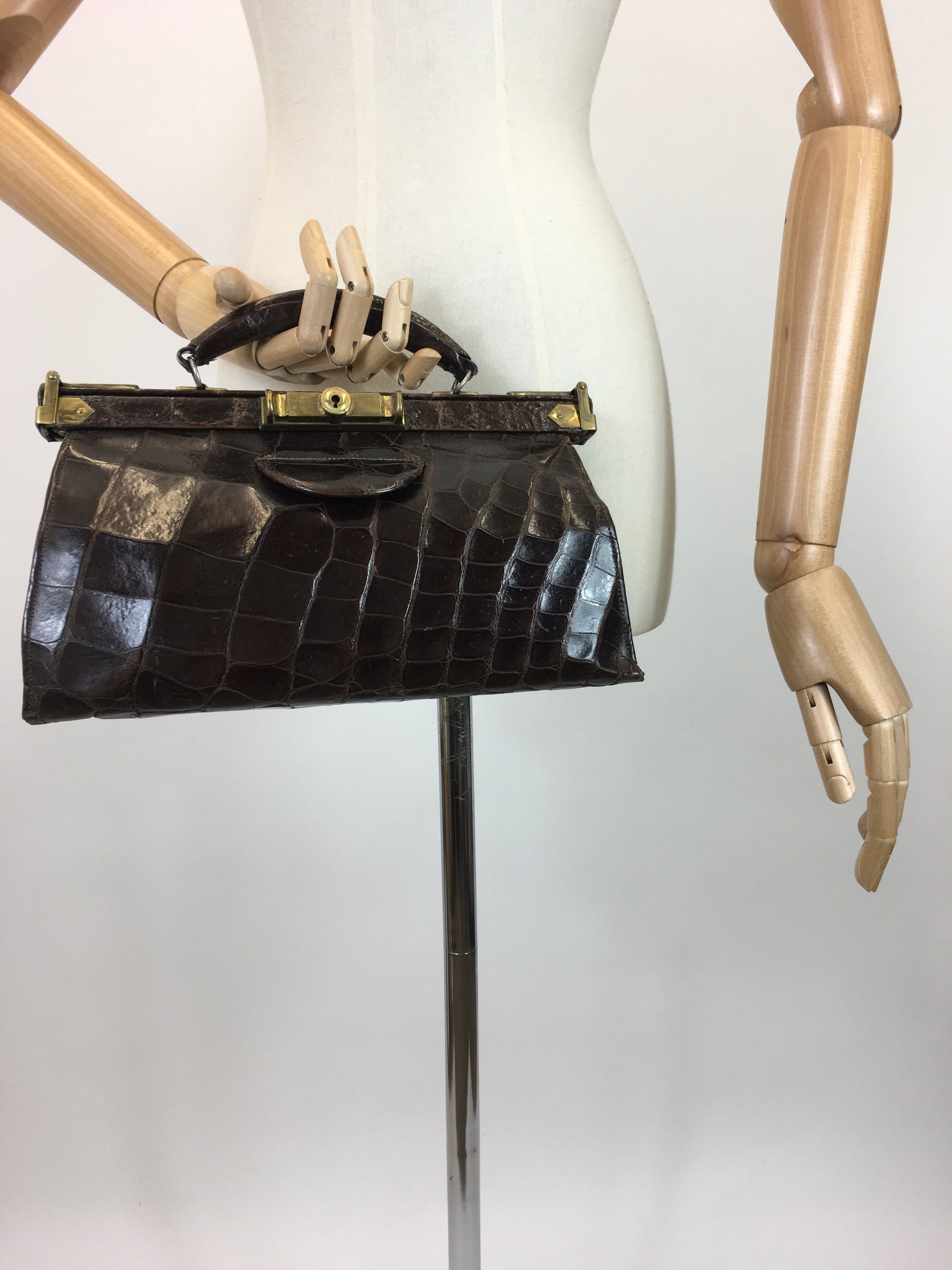Vintage 1930's sensational leather gladstone bag in a chocolate brown with brass accents. A stunning example from the era this piece showcases so many fabulous details in one piece. This bag has a great construction and shares great craftmanship. The bag has a typical gladstone bag shape and has a matching leather handle. The framework features brass clasps to the sides which lift to release the central lock to the middle which then pull open. To the interior you then click the side metalwork to form a rectangular box opening to which the bag becomes a great size. To its interior there is a large compartment with 2 further smaller side pockets. Made from a beautiful dark chocolate leather this piece oozes class and elegance. Great for both day and eveningwear occasions.