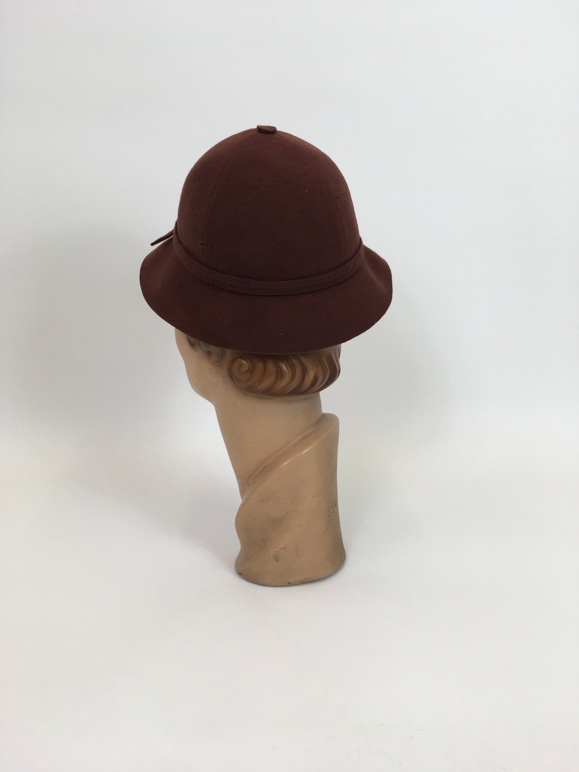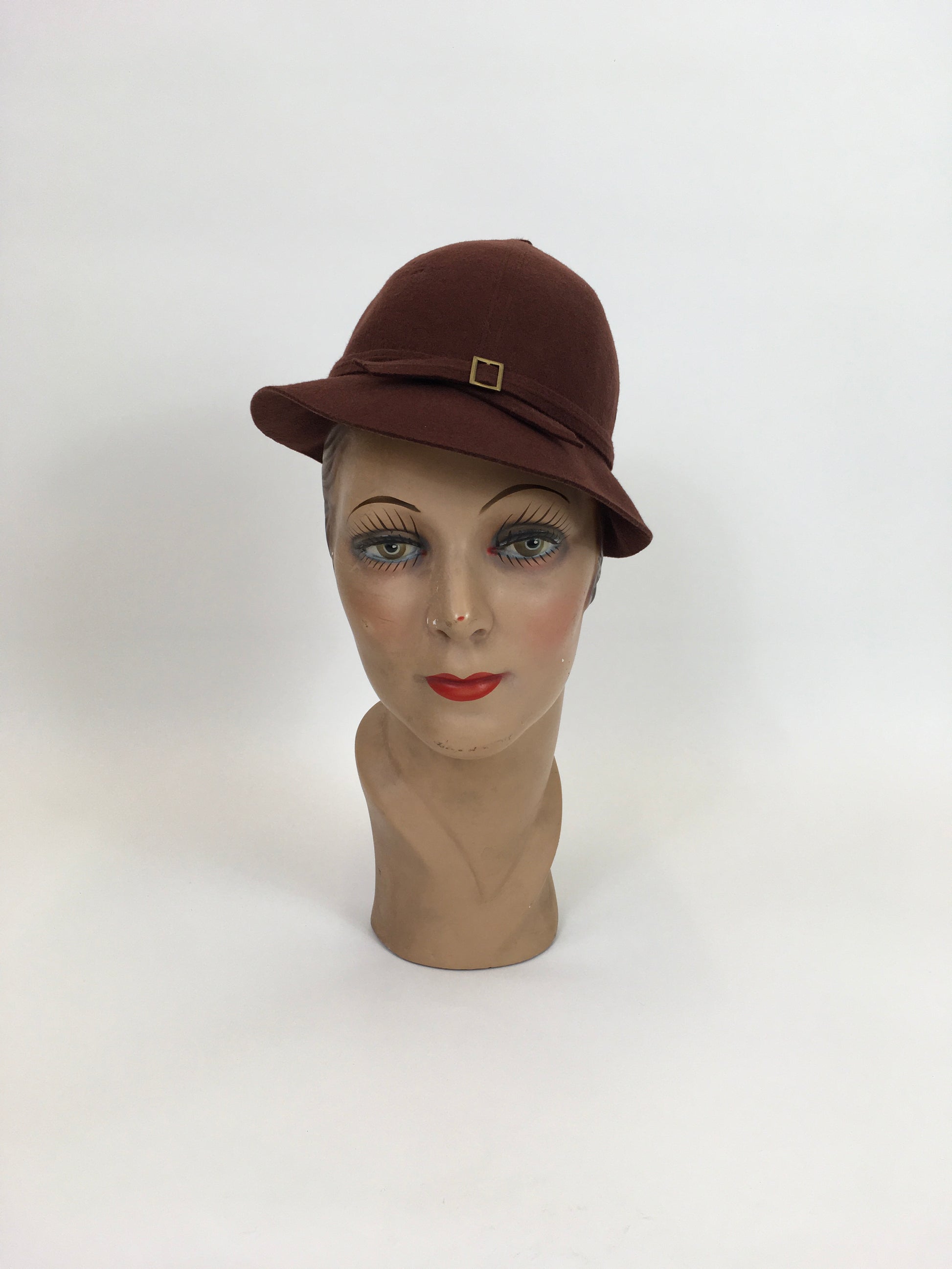 Vintage 1930's sensational sportwear hat in a divine warm brown. This is a delightful piece that appears to be in unworn condition. It's a fabulous example from the period and still retains its original paper label sizing to its interior. It has a fantastic silhouette and looks beautiful styled on the tilt on the head. It almost looks like a riding hat in style and features a brim, matching felt band with buckle to the front and eyelets to the side. This is such a stunning piece of fashion history and a must have for any 1930's loving ladies collection.