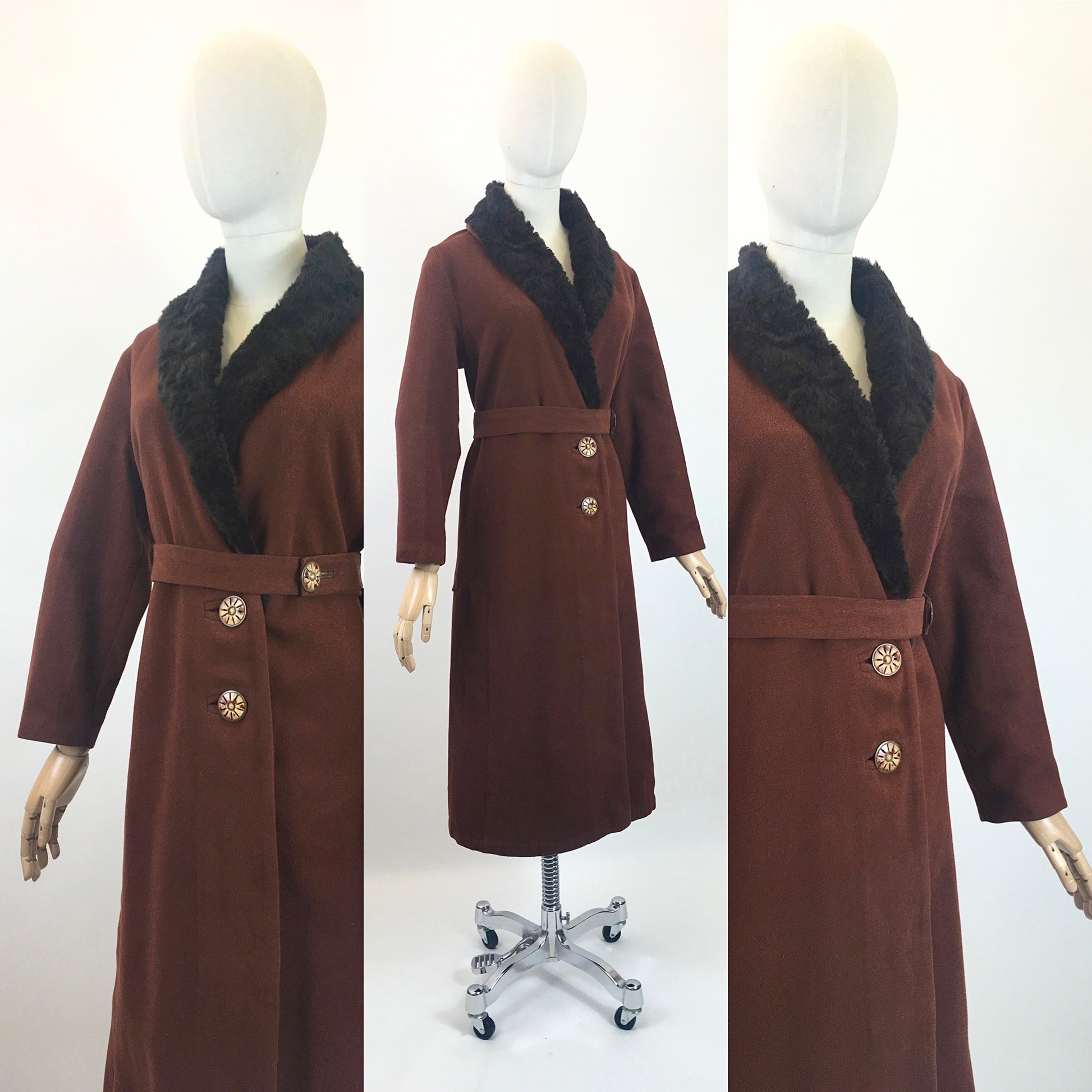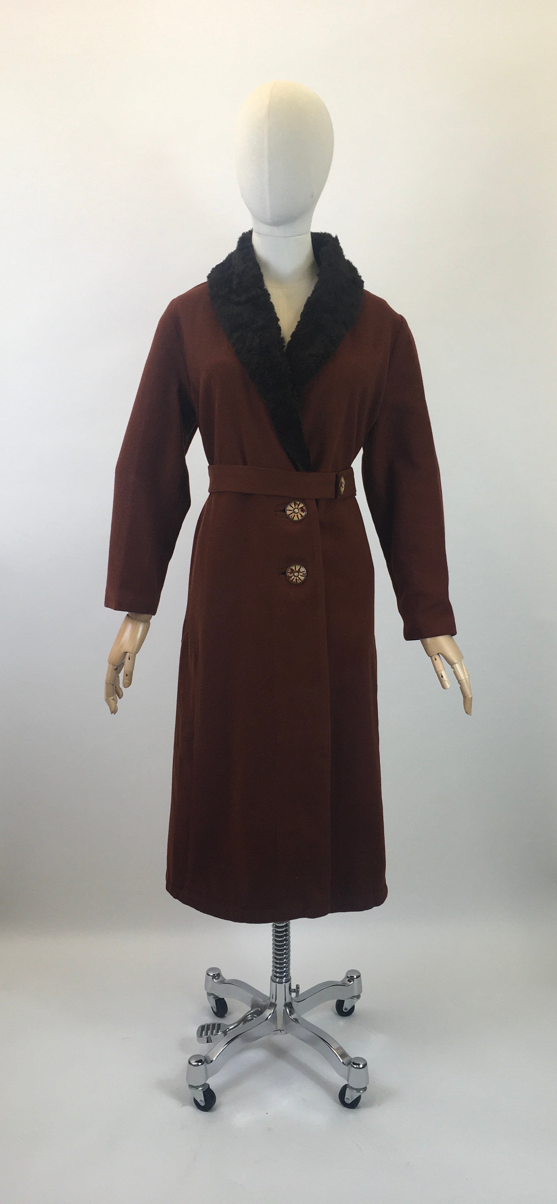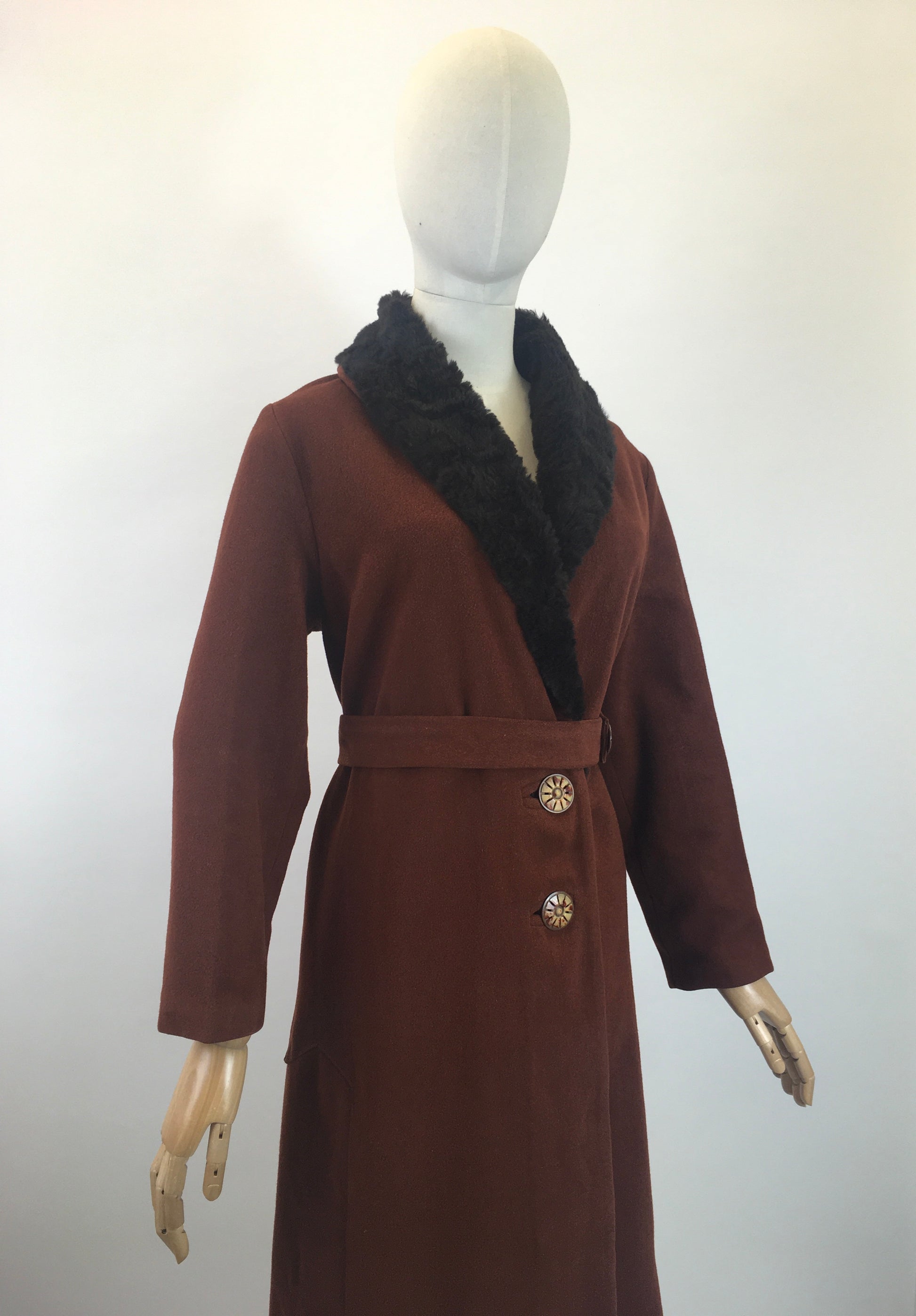 Vintage sensational 1920's / 1930's art deco coat in a warm cinnamon with rabbit fur collar. This is a stunning piece of period fashion and oozes art deco stylised detailing. It has a divine silhouette evocative of the era and features a longline shape, full length sleeve, aysmetric front with rabbit fur trim to its collar. It has a 2 button front, alongside a matching belt with single button. The sides of this piece has the most exquisite art deco shaped panel detailing. The buttons feature a 2 tone colourway and have an art deco stylised design to them. To its interior it has a half lining in a multi coloured damask and features a label to it's the nape ' The Chorlbro Guaranteed Label'.