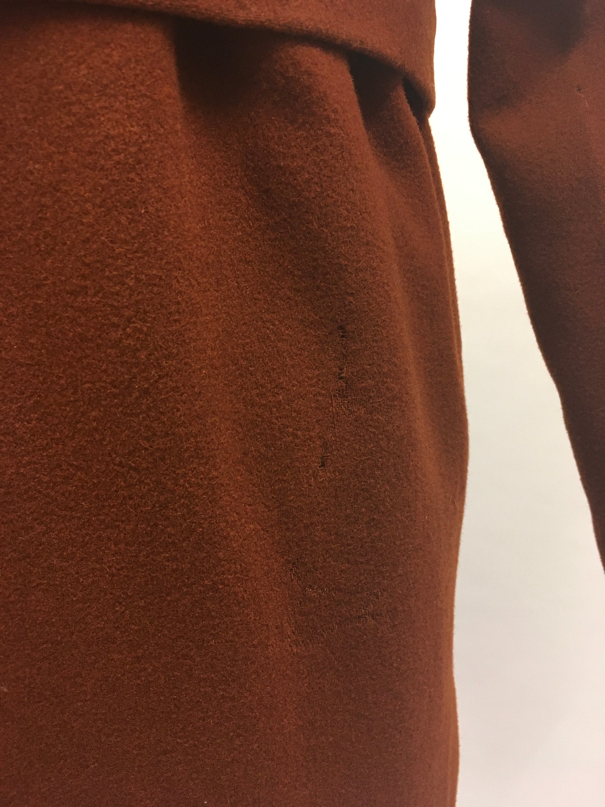 Fair Vintage Condition, flaws to note - Several grazes to the back and side of the wool, 2 nibbles but these do not detract from the wearability of the piece. The piece presents beautifully for its age and has its original belt. Priced gently to reflect the nibbles.