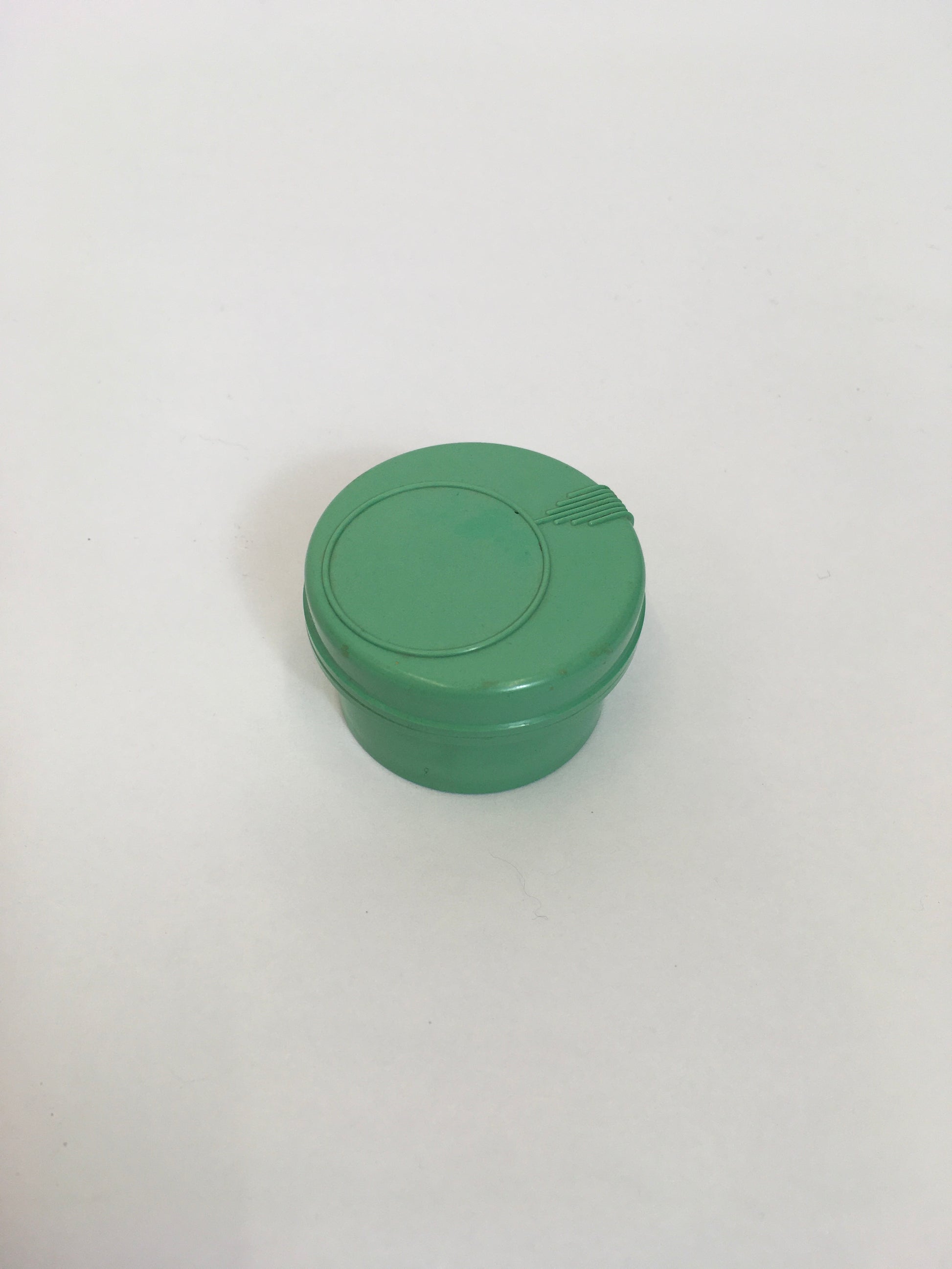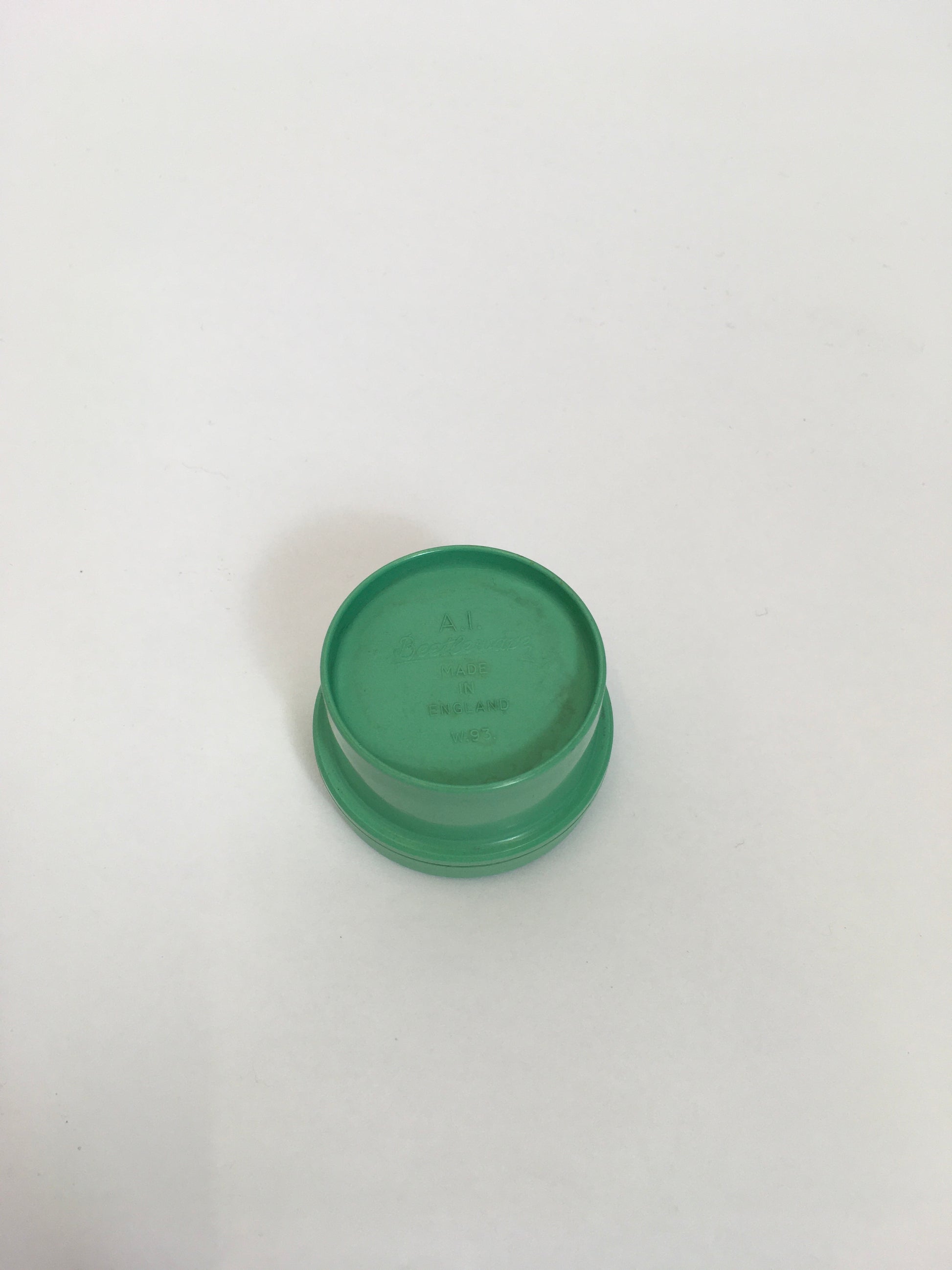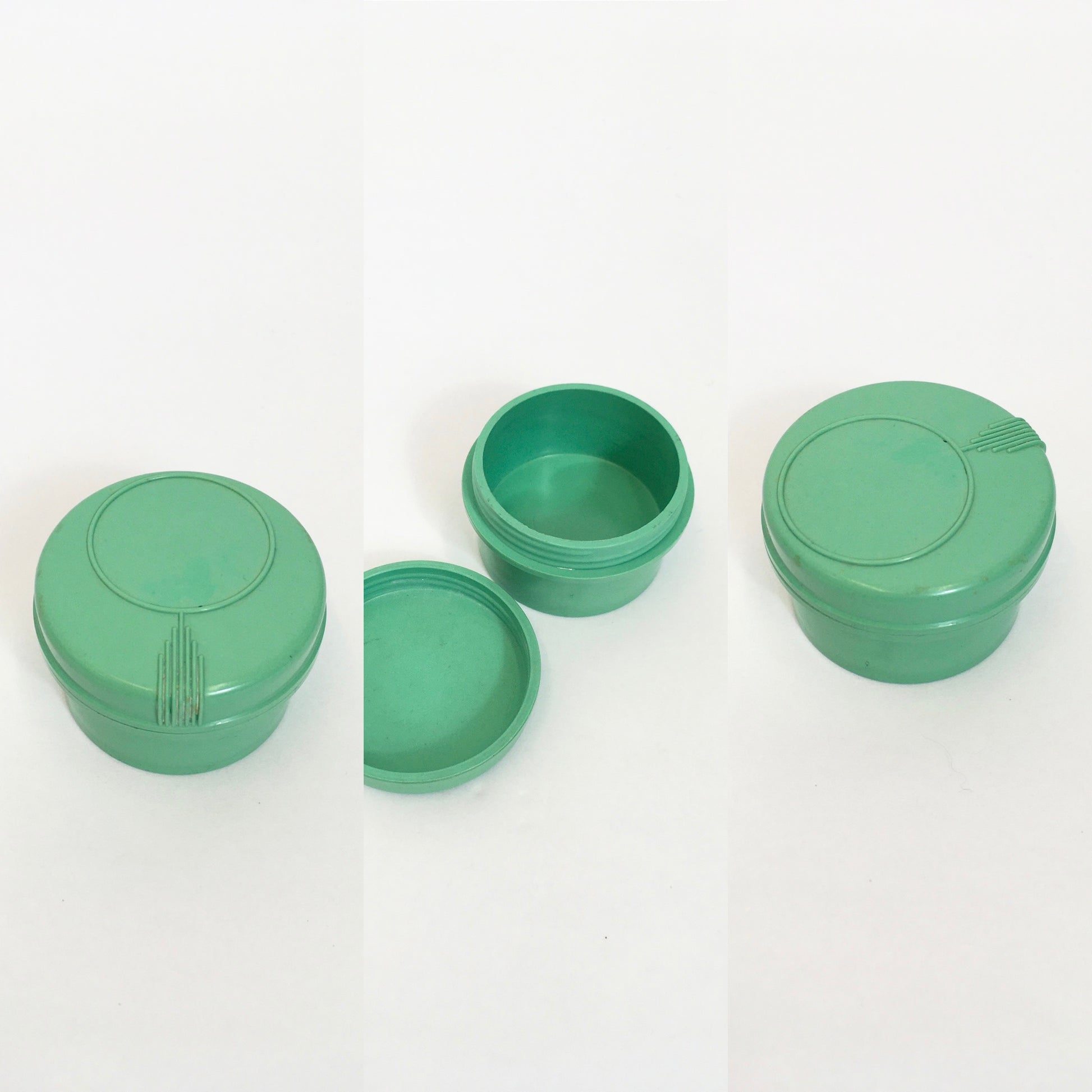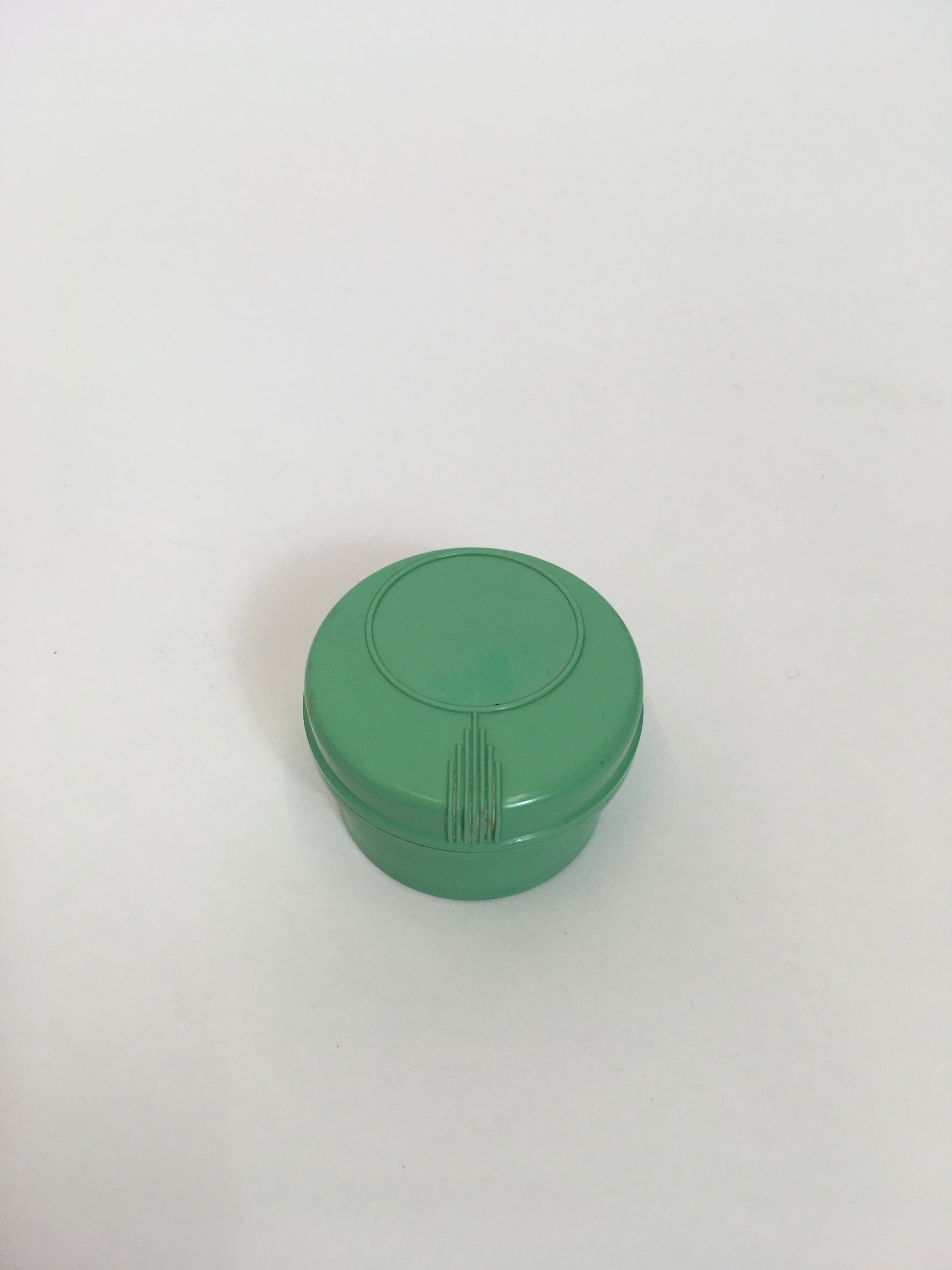 Vintage 1930's darling early plastic trinket pot in deco green. A great addition to your vintage vanity or dressing table to house little trinkets or small keepsakes and jewellery. Measuring 1.5' x 1.25' its a lovely dinky size for a small space.