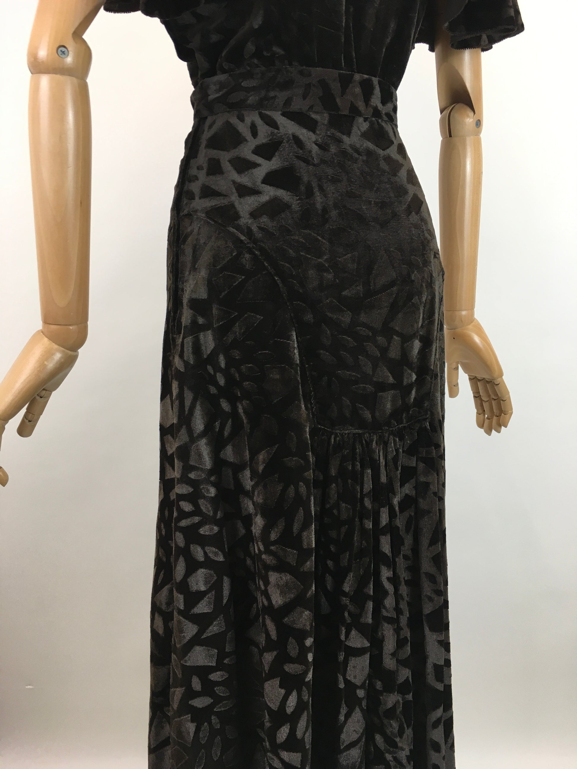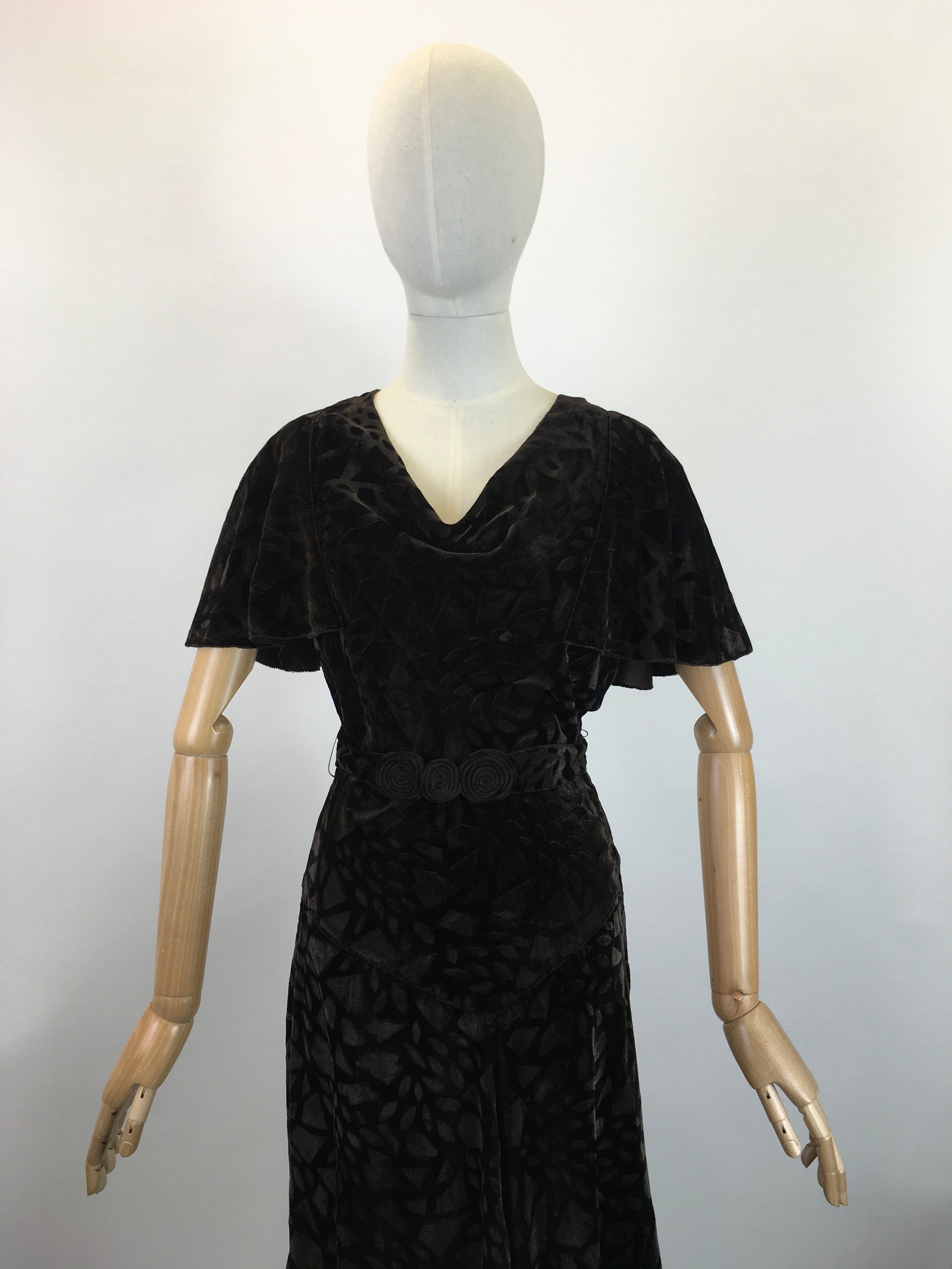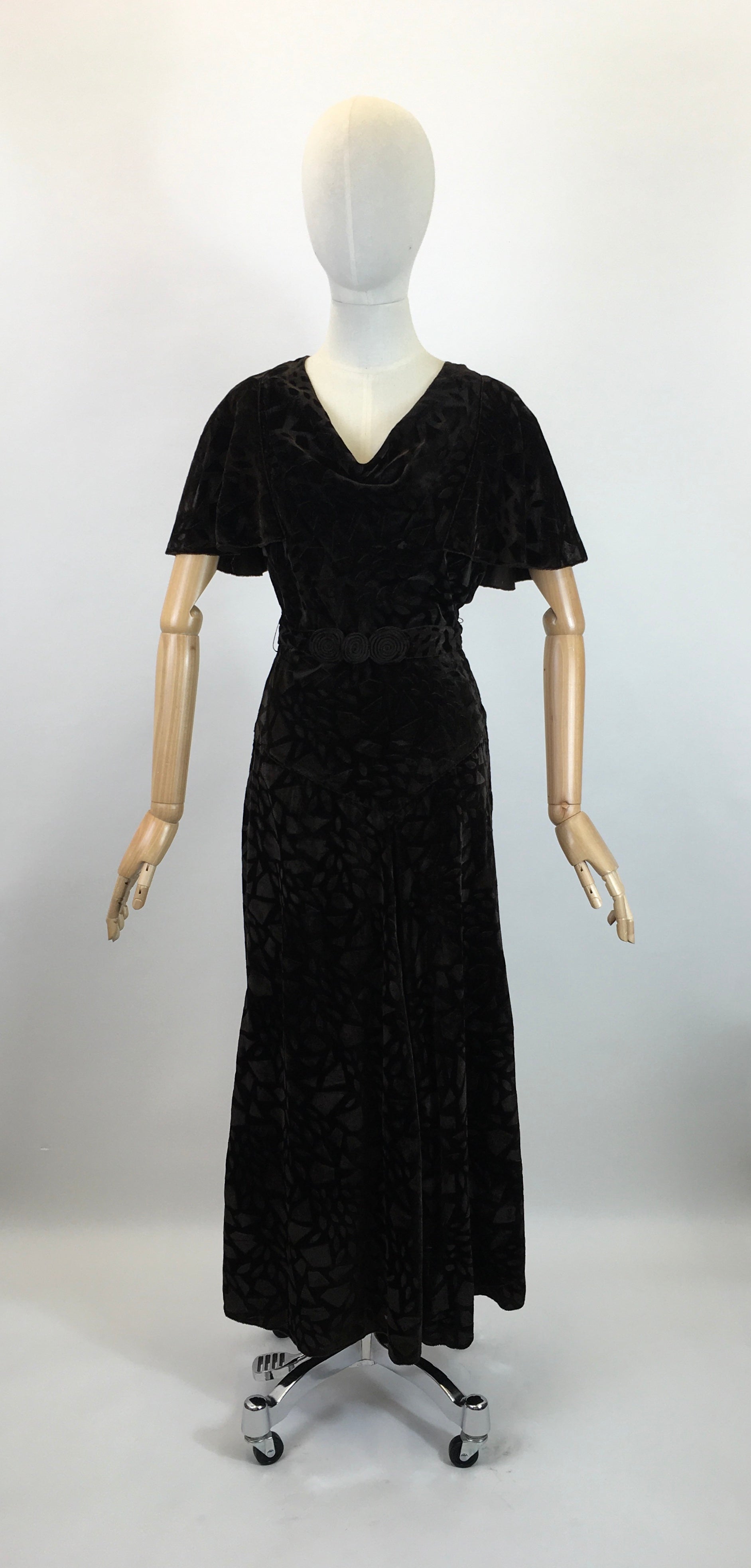 Vintage 1930's sensational evening gown in a rich dark chocolate Devore silk velvet. This is a sublime example from the era and showcases so many exquisite deco details. It has a typical 1930's silhouette with a deep cowl neckline, flutter sleeve overlay, deep v to waist, bias cut with fabulous dropped pleat panel to the rear of the skirt. The dress fastens with side press studs. To enhance the silhouette the evening gown has a matching belt which features 3 deco swirls to the front and fastens with hook and eyes. The epitome of its era, a great showcase piece to wear for a special occasion or 30's soiree.