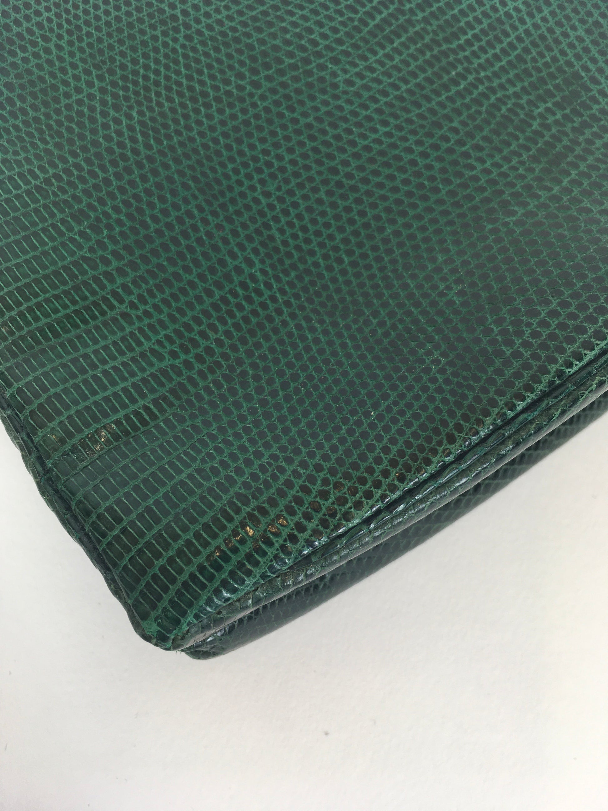 Vintage 1930’s fabulous green skin handbag in a lovely deco shape. This bag measures 8’ x 7’ ( 12’ including handle ‘, a great size for daywear for minimal necessities or on an evening out. A bag in a shade of green that is so hard to find !! This piece has a lovely Made In England label to its interior which features internal pockets for mirrors and lipsticks. The bag has a good strong handle and clasp.